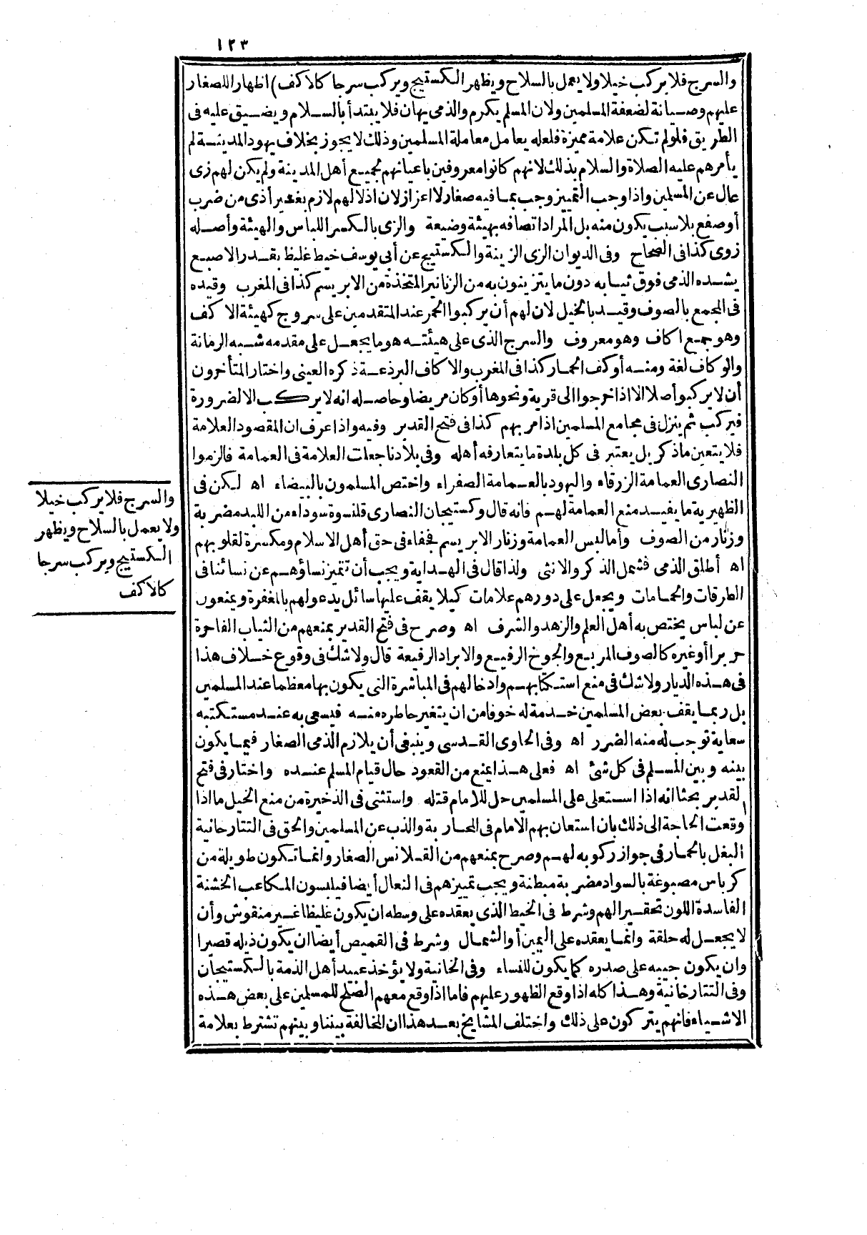 وَصَرَّحَ فِي فَتْحِ الْقَدِيرِ بِمَنْعِهِمْ مِنْ الثِّيَابِ الْفَاخِرَةِ حَرِيرًا أَوْ غَيْرَهُ كَالصُّوفِ الْمُرَبَّعِ وَالْجُوخِ الرَّفِيعِ وَالْأَبْرَادِ الرَّفِيعَةِ قَالَ وَلَا شَكَّ فِي وُقُوعِ خِلَافِ هَذَا فِي هَذِهِ الدِّيَارِ وَلَا شَكَّ فِي مَنْعِ اسْتِكْتَابِهِمْ وَإِدْخَالِهِمْ فِي الْمُبَاشَرَةِ الَّتِي يَكُونُ بِهَا مُعَظَّمًا عِنْدَ الْمُسْلِمِينَ بَلْ رُبَّمَا يَقِفُ بَعْضُ الْمُسْلِمِينَ خِدْمَةً لَهُ خَوْفًا مِنْ أَنْ يَتَغَيَّرَ خَاطِرُهُ مِنْهُ فَيَسْعَى بِهِ عِنْدَ مُسْتَكْتِبِهِ سِعَايَةً تُوجِبُ لَهُ مِنْهُ الضَّرَرَ اهـ.