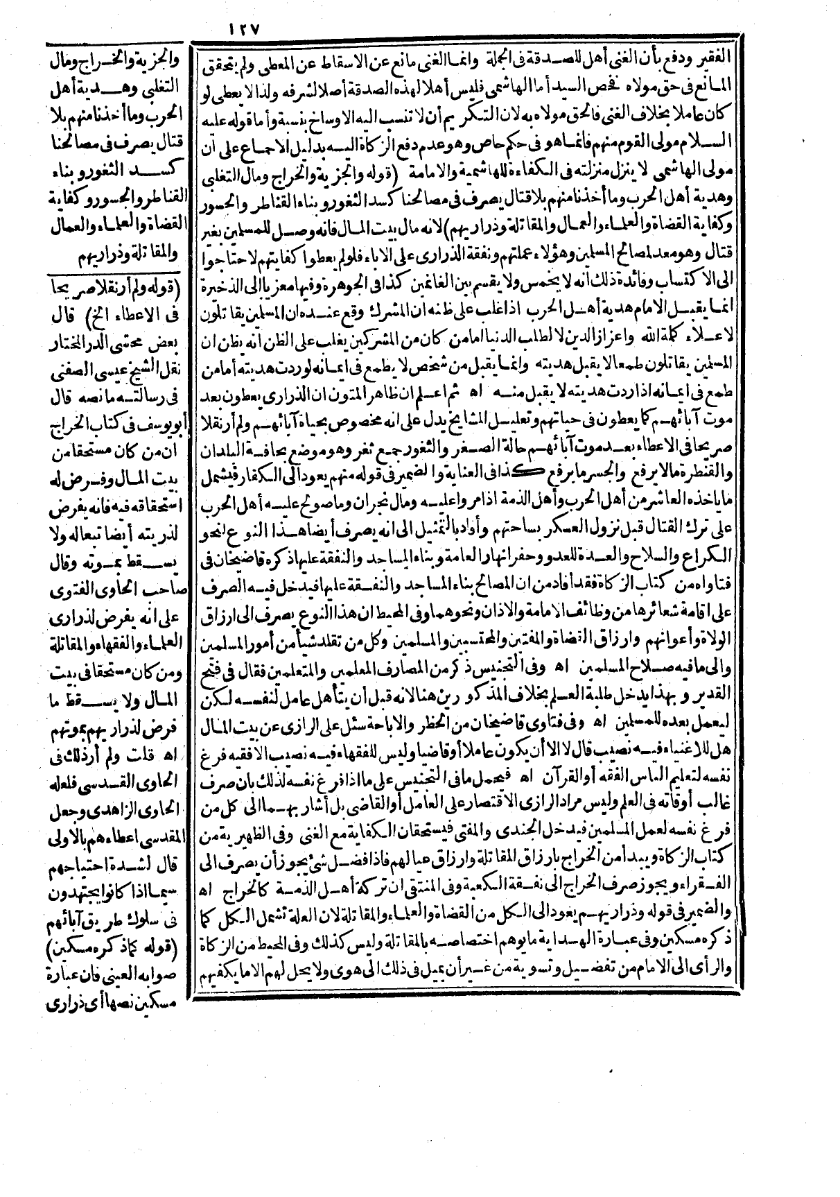 الْفَقِيرِ وَدُفِعَ بِأَنَّ الْغَنِيَّ أَهْلٌ لِلصَّدَقَةِ فِي الْجُمْلَةِ وَإِنَّمَا الْغَنِيُّ مَانِعٌ عَنْ الْإِسْقَاطِ عَنْ الْمُعْطِي وَلَمْ يَتَحَقَّقْ الْمَانِعُ فِي حَقِّ مَوْلَاهُ فَخُصَّ السَّيِّدُ أَمَّا الْهَاشِمِيُّ فَلَيْسَ أَهْلًا لِهَذِهِ الصَّدَقَةِ أَصْلًا لِشَرَفِهِ وَلِذَا لَا يُعْطَى لَوْ كَانَ عَامِلًا بِخِلَافِ الْغَنِيِّ فَالْحَقُّ مَوْلَاهُ بِهِ لِأَنَّ التَّكْرِيمَ أَنْ لَا تُنْسَبَ إلَيْهِ الْأَوْسَاخُ بِنِسْبَةٍ وَأَمَّا قَوْلُهُ - عَلَيْهِ السَّلَامُ - مَوْلَى الْقَوْمِ مِنْهُمْ فَإِنَّمَا هُوَ فِي حُكْمٍ خَاصٍّ وَهُوَ عَدَمُ الزَّكَاةِ إلَيْهِ بِدَلِيلِ الْإِجْمَاعِ عَلَى أَنَّ مَوْلَى الْهَاشِمِيِّ لَا يَنْزِلُ مَنْزِلَهُ فِي الْكَفَاءَةِ لِلْهَاشِمِيَّةِ وَالْإِمَامَةِ (قَوْلُهُ وَالْجِزْيَةُ وَالْخَرَاجُ وَمَالُ التَّغْلِبِيَّ وَهَدِيَّةُ أَهْلِ الْحَرْبِ وَمَا أَخَذْنَا مِنْهُمْ بِلَا قِتَالٍ يُصْرَفُ فِي مَصَالِحِنَا كَسَدِّ الثُّغُورِ وَبِنَاءِ الْقَنَاطِرِ وَالْجُسُورِ وَكِفَايَةِ الْقُضَاةِ وَالْعُلَمَاءِ وَالْعُمَّالِ وَالْمُقَاتِلَةِ وَذَرَارِيِّهِمْ) لِأَنَّهُ مَالُ بَيْتِ الْمَالِ فَإِنَّهُ وَصَلَ لِلْمُسْلِمِينَ بِغَيْرِ قِتَالٍ وَهُوَ مُعَدٌّ لِمَصَالِحِ الْمُسْلِمِينَ وَهَؤُلَاءِ عَمَلَتُهُمْ وَنَفَقَةُ الذَّرَارِيِّ عَلَى الْآبَاءِ فَلَوْ لَمْ يُعْطَوْا كِفَايَتَهُمْ لَاحْتَاجُوا إلَى الِاكْتِسَابِ وَفَائِدَةُ ذَلِكَ أَنَّهُ لَا يُخَمَّسُ وَلَا يُقْسَمُ بَيْنَ الْغَانِمِينَ كَذَا فِي الْجَوْهَرَةِ وَفِيهَا مَعْزِيًّا إلَى الذَّخِيرَةِ إنَّمَا يَقْبَلُ الْإِمَامُ هَدِيَّةَ أَهْلِ الْحَرْبِ إذَا غَلَبَ عَلَى ظَنِّهِ أَنَّ الْمُشْرِكَ وَقَعَ عِنْدَهُ أَنَّ الْمُسْلِمِينَ يُقَاتِلُونَ لِإِعْلَاءِ كَلِمَةِ اللَّهِ وَإِعْزَازِ الدِّينِ لَا لِطَلَبِ الدُّنْيَا أَمَّا مَنْ كَانَ مِنْ الْمُشْرِكِينَ يَغْلِبُ عَلَى الظَّنِّ أَنَّهُ يَظُنُّ أَنَّ الْمُسْلِمِينَ يُقَاتِلُونَ طَمَعًا لَا يَقْبَلُ هَدِيَّتَهُ وَإِنَّمَا يَقْبَلُ مِنْ شَخْصٍ لَا يَطْمَعُ فِي إيمَانِهِ لَوْ رُدَّتْ هَدِيَّتُهُ أَمَّا مَنْ طَمِعَ فِي إيمَانِهِ إذَا رُدَّتْ هَدِيَّتُهُ لَا يُقْبَلُ مِنْهُ اهـ.