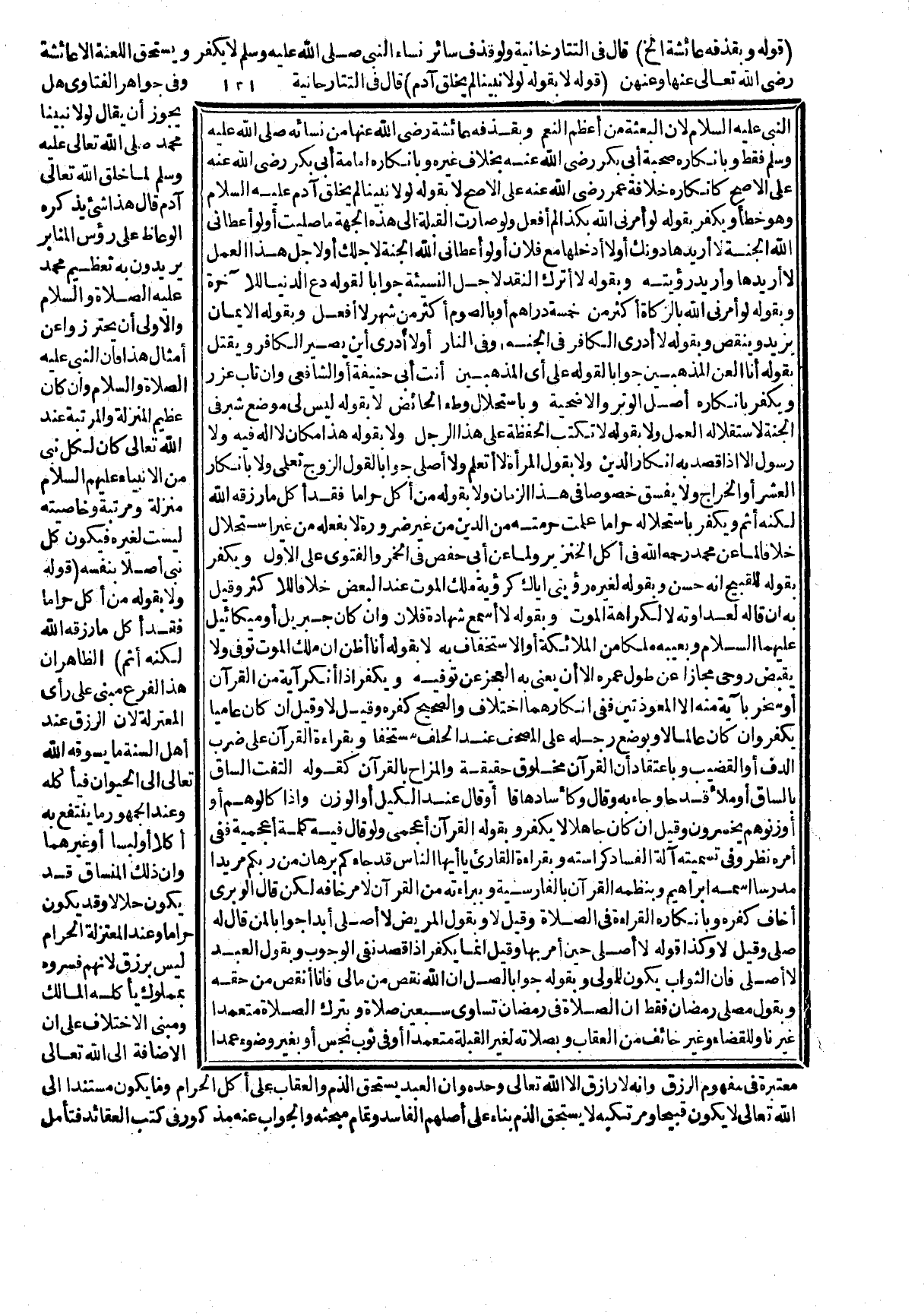 ـــــــــــــــــــــــــــــQ (قَوْلُهُ وَبِقَذْفِهِ عَائِشَةَ إلَخْ) قَالَ فِي التَّتَارْخَانِيَّة وَلَوْ قَذَفَ سَائِرَ نِسَاءِ النَّبِيِّ - صَلَّى اللَّهُ عَلَيْهِ وَسَلَّمَ - لَا يَكْفُرُ وَيَسْتَحِقُّ اللَّعْنَةَ إلَّا عَائِشَةُ رَضِيَ اللَّهُ تَعَالَى عَنْهَا وَعَنْهُنَّ (قَوْلُهُ لَا بِقَوْلِهِ لَوْلَا نَبِيُّنَا لَمْ يُخْلَقْ آدَمَ) قَالَ فِي التَّتَارْخَانِيَّة وَفِي جَوَاهِرِ الْفَتَاوَى هَلْ يَجُوزُ أَنْ يُقَالَ لَوْلَا نَبِيُّنَا مُحَمَّدٌ صَلَّى اللَّهُ تَعَالَى عَلَيْهِ وَسَلَّمَ لَمَا خَلَقَ اللَّهُ تَعَالَى آدَمَ قَالَ هَذَا شَيْءٌ يَذْكُرُهُ الْوُعَّاظُ عَلَى رُءُوسِ الْمَنَابِرِ يُرِيدُونَ بِهِ تَعْظِيمَ مُحَمَّدٍ - عَلَيْهِ الصَّلَاةُ وَالسَّلَامُ - وَالْأَوْلَى أَنْ يَحْتَرِزُوا عَنْ أَمْثَالِ هَذَا فَإِنَّ النَّبِيَّ - عَلَيْهِ الصَّلَاةُ وَالسَّلَامُ - وَإِنْ كَانَ عَظِيمَ الْمَنْزِلَةِ وَالْمَرْتَبَةِ عِنْدَ اللَّهِ تَعَالَى كَانَ لِكُلِّ نَبِيٍّ مِنْ الْأَنْبِيَاءِ - عَلَيْهِمْ السَّلَامُ - مَنْزِلَةٌ وَمَرْتَبَةٌ وَخَاصِّيَّتُهُ لَيْسَتْ لِغَيْرِهِ فَيَكُونُ كُلُّ نَبِيٍّ أَصْلًا بِنَفْسِهِ (قَوْلُهُ وَلَا بِقَوْلِهِ مَنْ أَكَلَ حَرَامًا فَقَدْ أَكَلَ مَا رَزَقَهُ اللَّهُ لَكِنَّهُ أَثِمَ) الظَّاهِرُ أَنَّ هَذَا الْفَرْعَ مَبْنِيٌّ عَلَى رَأْيِ الْمُعْتَزِلَةِ لِأَنَّ الرِّزْقَ عِنْدَ أَهْلِ السُّنَّةِ مَا يَسُوقُهُ اللَّهُ تَعَالَى إلَى الْحَيَوَانِ فَيَأْكُلُهُ وَعِنْدَ الْجُمْهُورِ مَا يُنْتَفَعُ بِهِ أَكْلًا أَوْ لُبْسًا أَوْ غَيْرَهُمَا وَأَنَّ ذَلِكَ الْمُنْسَاقَ قَدْ يَكُونُ حَلَالًا وَقَدْ يَكُونُ حَرَامًا وَعِنْدَ الْمُعْتَزِلَةِ الْحَرَامُ لَيْسَ بِرِزْقٍ لِأَنَّهُمْ فَسَرُّوهُ بِمَمْلُوكٍ يَأْكُلُهُ الْمَالِكُ.