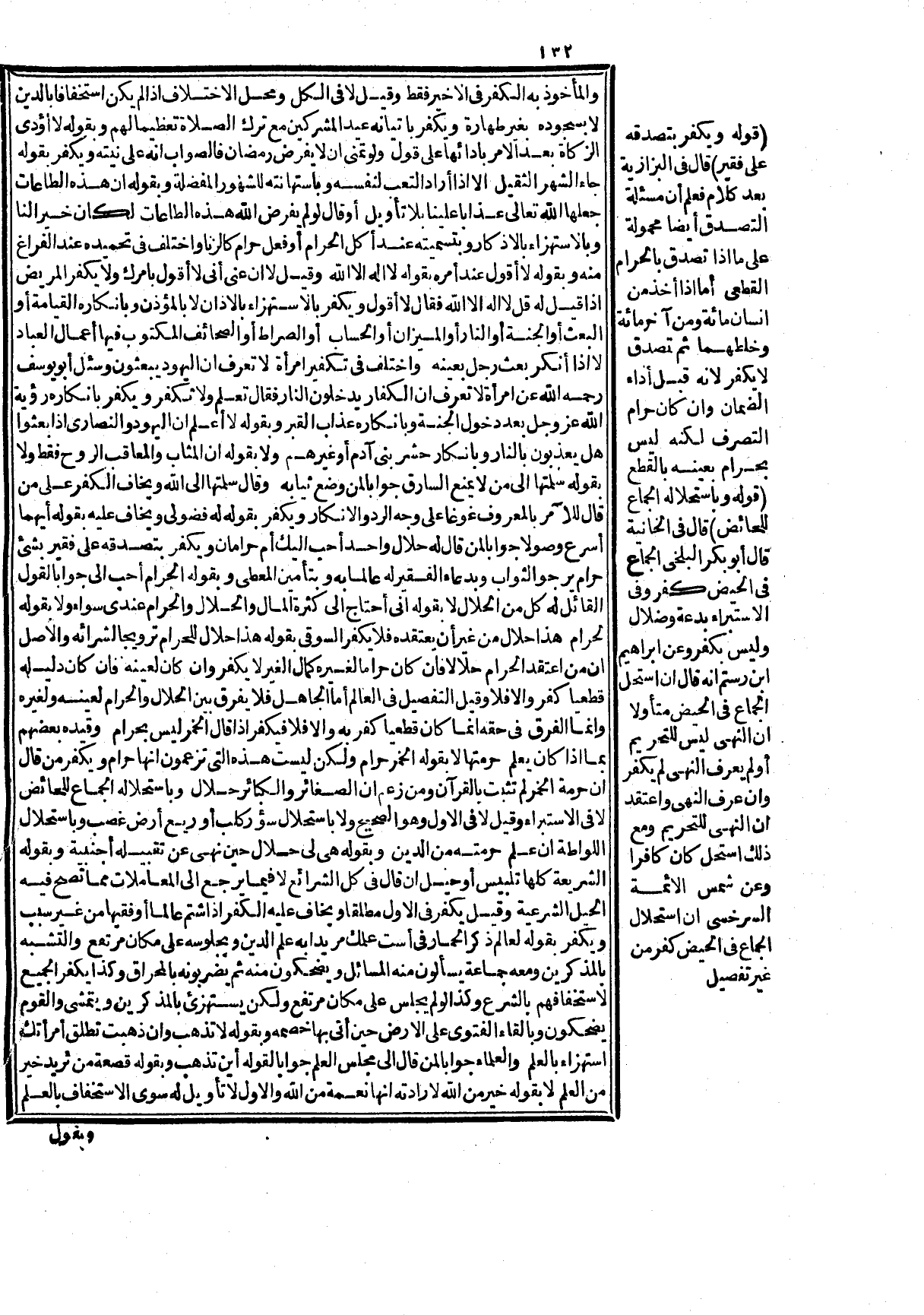 وَإِنْ كَانَ لِعَيْنِهِ فَإِنْ كَانَ دَلِيلُهُ قَطْعِيًّا كَفَرَ وَإِلَّا فَلَا وَقِيلَ التَّفْصِيلُ فِي الْعَالِمِ أَمَّا الْجَاهِلُ فَلَا يُفَرِّقُ بَيْنَ الْحَلَالِ وَالْحَرَامِ لِعَيْنِهِ وَلِغَيْرِهِ وَإِنَّمَا الْفَرْقُ فِي حَقِّهِ إنَّمَا كَانَ قَطْعِيًّا كَفَرَ بِهِ وَإِلَّا فَلَا فَيَكْفُرُ إذَا قَالَ الْخَمْرُ لَيْسَ بِحَرَامٍ وَقَيَّدَهُ بَعْضُهُمْ بِمَا إذَا كَانَ يَعْلَمُ حُرْمَتَهَا لَا بِقَوْلِهِ حَرَامٌ وَلَكِنْ لَيْسَتْ هَذِهِ الَّتِي تَزْعُمُونَ أَنَّهَا حَرَامٌ وَيَكْفُرُ مَنْ قَالَ إنَّ حُرْمَةَ الْخَمْرِ لَمْ تَثْبُتْ بِالْقُرْآنِ وَمَنْ زَعَمَ أَنَّ الصَّغَائِرَ وَالْكَبَائِرَ حَلَالٌ وَبِاسْتِحْلَالِهِ الْجِمَاعَ لِلْحَائِضِ لَا فِي الِاسْتِبْرَاءِ وَقِيلَ لَا فِي الْأَوَّلِ وَهُوَ الصَّحِيحُ وَلَا بِاسْتِحْلَالِ سُؤْرِ كَلْبٍ أَوْ رَبْعِ أَرْضٍ غُصِبَ وَبِاسْتِحْلَالِ اللِّوَاطَةِ إنْ عَلِمَ حُرْمَتَهُ مِنْ الدِّينِ وَبِقَوْلِهِ هِيَ لِي حَلَالٌ حِينَ نُهِيَ عَنْ تَقْبِيلِهِ أَجْنَبِيَّةً وَبِقَوْلِهِ الشَّرِيعَةُ كُلُّهَا تَلْبِيسٌ أَوْ حِيَلٌ إنْ قَالَ فِي كُلِّ الشَّرَائِعِ لَا فِيمَا يَرْجِعُ إلَى الْمُعَامَلَاتِ مِمَّا تَصِحُّ فِيهِ الْحِيَلُ الشَّرْعِيَّةُ وَقِيلَ يَكْفُرُ فِي الْأَوَّلِ مُطْلَقًا وَيُخَافُ عَلَيْهِ الْكُفْرُ إذَا شَتَمَ عَالِمًا أَوْ فَقِيهًا مِنْ غَيْرِ سَبَبٍ وَيَكْفُرُ بِقَوْلِهِ لِعَالِمٍ ذَكَرُ الْحِمَارِ فِي إسْتِ عِلْمِك مُرِيدًا بِهِ عِلْمَ الدِّينِ وَبِجُلُوسِهِ عَلَى مَكَان مُرْتَفِعٍ وَالتَّشَبُّهِ بِالْمُذَكِّرِينَ وَمَعَهُ جَمَاعَةٌ يَسْأَلُونَ مِنْهُ الْمَسَائِلَ وَيَضْحَكُونَ مِنْهُ ثُمَّ يَضْرِبُونَهُ بِالْمِحْرَاقِ وَكَذَا يَكْفُرُ الْجَمِيعُ لِاسْتِخْفَافِهِمْ بِالشَّرْعِ.