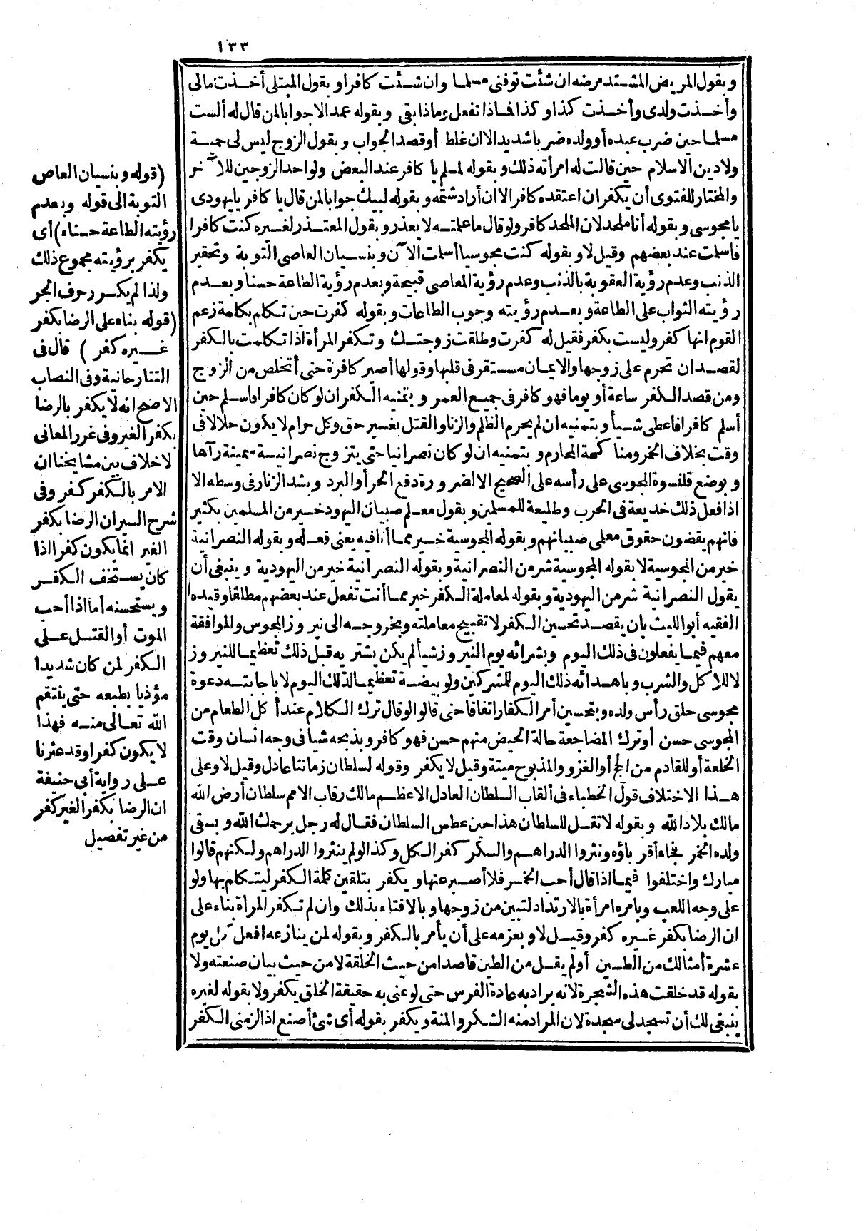 وَقَيَّدَهُ الْفَقِيهُ أَبُو اللَّيْثِ بِأَنْ يَقْصِدَ تَحْسِينَ الْكُفْرِ لَا تَقْبِيحَ مُعَامَلَتِهِ وَبِخُرُوجِهِ إلَى نَيْرُوزِ الْمَجُوسِ وَالْمُوَافَقَةِ مَعَهُمْ فِيمَا يَفْعَلُونَ فِي ذَلِكَ الْيَوْمِ وَبِشِرَائِهِ يَوْمَ النَّيْرُوزِ شَيْئًا لَمْ يَكُنْ يَشْتَرِيهِ قَبْلَ ذَلِكَ تَعْظِيمًا لِلنَّيْرُوزِ لَا لِلْأَكْلِ وَالشُّرْبِ وَبِإِهْدَائِهِ ذَلِكَ الْيَوْمَ لِلْمُشْرِكِينَ وَلَوْ بَيْضَةً تَعْظِيمًا لِذَلِكَ الْيَوْمِ لَا بِإِجَابَتِهِ دَعْوَةَ مَجُوسِيٍّ حَلَقَ رَأْسَ وَلَدِهِ وَبِتَحْسِينِ أَمْرِ الْكُفَّارِ اتِّفَاقًا حَتَّى قَالُوا لَوْ قَالَ تَرْكُ الْكَلَامِ عِنْدَ أَكْلِ الطَّعَامِ مِنْ الْمَجُوسِيِّ حَسَنٌ أَوْ تَرْكُ الْمُضَاجَعَةِ حَالَةَ الْحَيْضِ مِنْهُمْ حَسَنٌ فَهُوَ كَافِرٌ وَبِذَبْحِهِ شَيْئًا فِي وَجْهِ إنْسَانٍ وَقْتَ الْخُلْعَةِ أَوْ لِلْقَادِمِ مِنْ الْحَجِّ أَوْ الْغَزْوِ وَالْمَذْبُوحُ مَيْتَةٌ وَقِيلَ لَا يَكْفُرُ وَقَوْلُهُ لِسُلْطَانِ زَمَانِنَا عَادِلٌ وَقِيلَ لَا وَعَلَى هَذَا الِاخْتِلَافِ قَوْلُ الْخُطَبَاءِ فِي أَلْقَابِ السُّلْطَانِ الْعَادِلُ الْأَعْظَمُ مَالِكُ رِقَابِ الْأُمَمِ سُلْطَانُ أَرْضِ اللَّهِ مَالِكُ بِلَادِ اللَّهِ وَبِقَوْلِهِ لَا تَقُلْ لِلسُّلْطَانِ هَذَا حِينَ عَطَسَ السُّلْطَانُ فَقَالَ لَهُ رَجُلٌ يَرْحَمُك اللَّهُ وَيَسْقِي وَلَدَهُ الْخَمْرَ فَجَاءَ أَقْرِبَاؤُهُ وَنَثَرُوا الدَّرَاهِمَ وَالسُّكَّرَ كَفَرَ الْكُلُّ وَكَذَا لَوْ لَمْ يَنْثُرُوا الدَّرَاهِمَ وَلَكِنَّهُمْ قَالُوا مُبَارَكٌ وَاخْتَلَفُوا فِيمَا إذَا قَالَ أُحِبُّ الْخَمْرَ فَلَا أَصْبِرُ عَنْهَا وَيَكْفُرُ بِتَلْقِينِ كَلِمَةِ الْكُفْرِ لِيَتَكَلَّمَ بِهَا وَلَوْ عَلَى وَجْهِ اللَّعِبِ وَبِأَمْرِهِ امْرَأَةً بِالِارْتِدَادِ لِتَبِينَ مِنْ زَوْجِهَا وَبِالْإِفْتَاءِ بِذَلِكَ وَإِنْ لَمْ تَكْفُرْ الْمَرْأَةُ بِنَاءً عَلَى أَنَّ الرِّضَا بِكُفْرِ غَيْرِهِ كُفْرٌ وَقِيلَ لَا وَبِعَزْمِهِ عَلَى أَنْ يَأْمُرَ بِالْكُفْرِ وَبِقَوْلِهِ لِمَنْ يُنَازِعُهُ أَفْعَلُ كُلَّ يَوْمٍ عَشَرَةَ أَمْثَالِك مِنْ الطِّينِ أَوْ لَمْ يَقُلْ مِنْ الطِّينِ قَاصِدًا مِنْ حَيْثُ الْخِلْقَةِ لَا مِنْ حَيْثُ بَيَانِ صَنْعَتِهِ وَلَا بِقَوْلِهِ قَدْ خَلَقْت هَذِهِ الشَّجَرَةَ لِأَنَّهُ يُرَادُ بِهِ عَادَةُ الْفُرْسِ حَتَّى لَوْ عَنَى بِهِ حَقِيقَةَ الْخَلْقِ يَكْفُرُ وَلَا بِقَوْلِهِ لِغَيْرِهِ يَنْبَغِي لَك أَنْ تَسْجُدَ لِي سَجْدَةً لِأَنَّ الْمُرَادَ مِنْهُ الشُّكْرُ وَالْمِنَّةُ.
