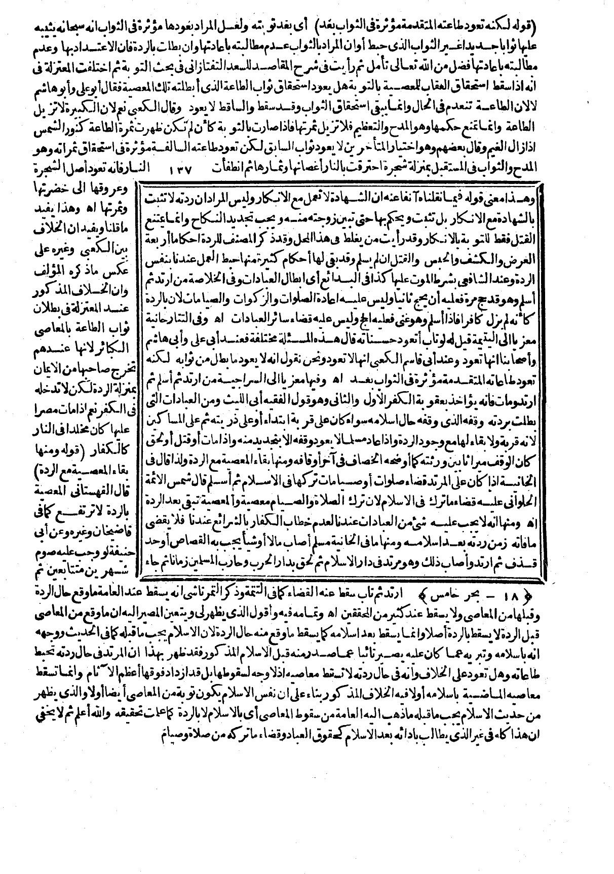 وَهَذَا يُفِيدُ مَا قُلْنَا وَيُفِيدُ أَنَّ الْخِلَافَ بَيْنَ الْكَعْبِيِّ وَغَيْرِهِ عَلَى عَكْسِ مَا ذَكَرَهُ الْمُؤَلِّف وَأَنَّ الْخِلَافَ الْمَذْكُورَ عِنْدَ الْمُعْتَزِلَةِ فِي بُطْلَانِ ثَوَابِ الطَّاعَةِ بِالْمَعَاصِي الْكَبَائِرُ لِأَنَّهَا عِنْدَ هُمْ تُخْرِجُ صَاحِبَهَا مِنْ الْإِيمَانِ بِمَنْزِلَةِ الرِّدَّةِ لَكِنْ لَا تُدْخِلُهُ فِي الْكُفْرِ نَعَمْ إذَا مَاتَ مُصِرًّا عَلَيْهَا كَانَ مُخَلَّدًا فِي النَّارِ كَالْكُفَّارِ (قَوْلُهُ وَمِنْهَا بَقَاءُ الْمَعْصِيَةِ مَعَ الرِّدَّةِ) قَالَ الْقُهُسْتَانِيُّ الْمَعْصِيَةُ بِالرِّدَّةِ لَا تَرْتَفِعُ كَمَا فِي قَاضِي خَانْ وَغَيْرِهِ وَعَنْ أَبِي حَنِيفَةَ لَوْ وَجَبَ عَلَيْهِ صَوْمُ شَهْرَيْنِ مُتَتَابِعَيْنِ ثُمَّ ارْتَدَّ ثُمَّ تَابَ سَقَطَ عَنْهُ الْقَضَاءُ كَمَا فِي التَّتِمَّةِ وَذَكَرَ التُّمُرْتَاشِيُّ أَنَّهُ يَسْقُطُ عِنْدَ الْعَامَّةِ مَا وَقَعَ حَالَ الرِّدَّةِ وَقَبْلَهَا مِنْ الْمَعَاصِي وَلَا يَسْقُطُ عِنْدَ كَثِيرٍ مِنْ الْمُحَقِّقِينَ اهـ.