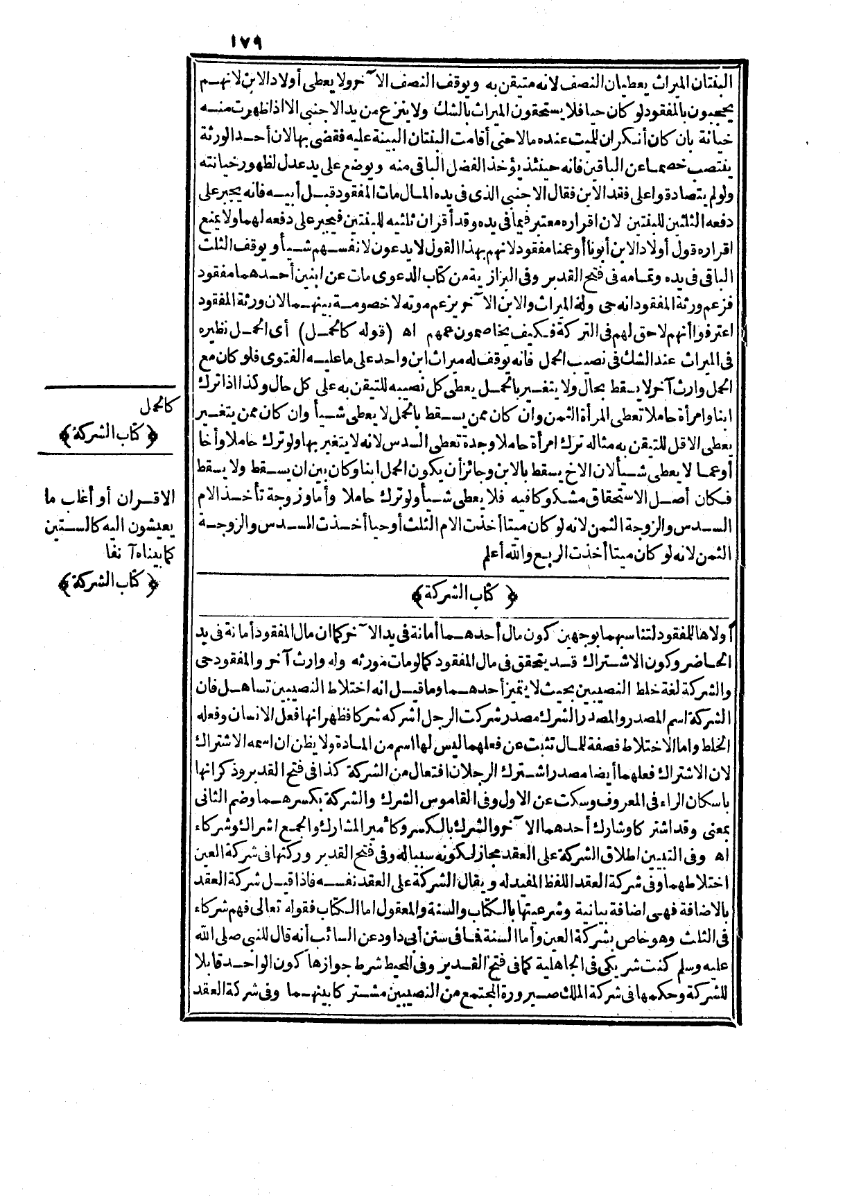 أَوْلَاهَا لِلْمَفْقُودِ لِتَنَاسُبِهِمَا بِوَجْهَيْنِ: كَوْنُ مَالِ أَحَدِهِمَا أَمَانَةً فِي يَدِ الْآخَرِ كَمَا أَنَّ مَالَ الْمَفْقُودِ أَمَانَةٌ فِي يَدِ الْحَاضِرِ، وَكَوْنُ الِاشْتِرَاكِ قَدْ يَتَحَقَّقُ فِي مَالِ الْمَفْقُودِ كَمَا لَوْ مَاتَ مُوَرِّثُهُ وَلَهُ وَارِثٌ آخَرُ وَالْمَفْقُودُ حَيٌّ وَالشَّرِكَةُ لُغَةً خَلْطُ النَّصِيبَيْنِ بِحَيْثُ لَا يَتَمَيَّزُ أَحَدُهُمَا وَمَا قِيلَ إنَّهُ اخْتِلَاطُ النَّصِيبَيْنِ تَسَاهُلٌ فَإِنَّ الشَّرِكَةَ اسْمُ الْمَصْدَرِ وَالْمَصْدَرُ الشِّرْكُ مَصْدَرُ شَرِكْت الرَّجُلَ أُشْرِكُهُ شِرْكًا فَظَهَرَ أَنَّهَا فِعْلُ الْإِنْسَانِ وَفِعْلُهُ الْخَلْطُ، وَأَمَّا الِاخْتِلَاطُ فَصِفَةٌ لِلْمَالِ تَثْبُتُ عَنْ فِعْلِهِمَا لَيْسَ لَهَا اسْمٌ مِنْ الْمَادَّةِ وَلَا يُظَنُّ أَنَّ اسْمَهُ الِاشْتِرَاكُ؛ لِأَنَّ الِاشْتِرَاكَ فِعْلُهُمَا أَيْضًا مَصْدَرُ اشْتَرَكَ الرَّجُلَانِ افْتِعَالٌ مِنْ الشَّرِكَةِ، كَذَا فِي فَتْحِ الْقَدِيرِ وَذُكِرَ أَنَّهَا بِإِسْكَانِ الرَّاءِ فِي الْمَعْرُوفِ وَسَكَتَ عَنْ الْأَوَّلِ، وَفِي الْقَامُوسِ الشِّرْكُ وَالشَّرِكَةُ بِكَسْرِهِمَا وَضَمِّ الثَّانِي بِمَعْنًى، وَقَدْ اشْتَرَكَا وَشَارَكَ أَحَدُهُمَا الْآخَرَ وَالشِّرْكُ بِالْكَسْرِ وَكَأَمِيرٍ الْمُشَارِكُ وَالْجَمْعُ إشْرَاكٌ وَشُرَكَاءُ. اهـ.
