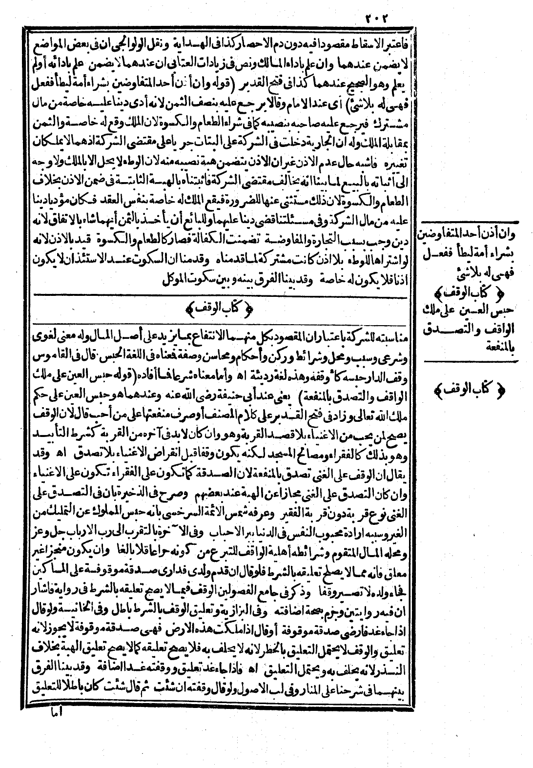 مُنَاسَبَتُهُ لِلشَّرِكَةِ بِاعْتِبَارِ أَنَّ الْمَقْصُودَ بِكُلٍّ مِنْهُمَا الِانْتِفَاعُ بِمَا يَزِيدُ عَلَى أَصْلِ الْمَالِ وَلَهُ مَعْنًى لُغَوِيٌّ وَشَرْعِيٌّ وَسَبَبٌ وَمَحَلٌّ وَشَرَائِطُ وَرُكْنٌ وَأَحْكَامٌ وَمَحَاسِنُ وَصِفَةٌ فَمَعْنَاهُ فِي اللُّغَةِ الْحَبْسُ قَالَ فِي الْقَامُوسِ وَقَفَ الدَّارَ حَبَسَهُ كَأَوْقَفَهُ وَهَذِهِ لُغَةٌ رَدِيئَةٌ. اهـ.