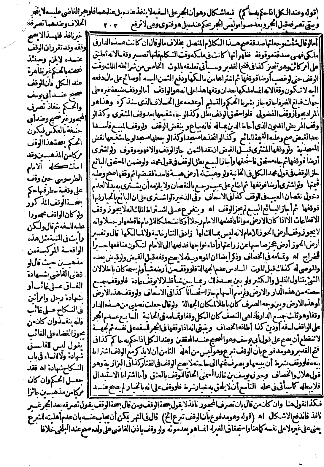 ـــــــــــــــــــــــــــــQ (قَوْلُهُ وَعِنْدَ الْكُلِّ إذَا حَكَمَ بِهِ حَاكِمٌ) فِيهِ إشْكَالٌ وَهُوَ أَنَّ الْحَجْرَ عَلَى السَّفِيهِ لَا يَنْفُذُ عِنْدَهُ بَلْ عِنْدَهُمَا فَلَوْ حَجَرَ الْقَاضِي عَلَيْهِ لَا يَنْحَجِرُ وَيَبْقَى تَصَرُّفُهُ قَبْلَ الْحَجْرِ وَبَعْدَهُ سَوَاءً وَلَيْسَ الْحَجْرُ بِحُكْمٍ عِنْدَهُ بَلْ هُوَ فَتْوَى وَهِيَ لَا تَرْفَعُ الْخِلَافَ وَعِنْدَهُمَا تَصَرُّفُهُ غَيْرُ نَافِذٍ فَلِهَذَا لَا يَصِحُّ وَقْفُهُ وَقَدْ تَقَرَّرَ أَنَّ الْوَقْفَ عِنْدَهُ لَا يَلْزَمُ وَحِينَئِذٍ فَصِحَّتُهُ بِالْحُكْمِ غَيْرُ ظَاهِرَةٍ عِنْدَ الْكُلِّ فَإِنَّ الْوَقْفَ صَحِيحٌ عِنْدَ أَبِي يُوسُفَ وَالْحُكْمَ بِنَفَاذِ تَصَرُّفِ الْمَحْجُورِ غَيْرُ صَحِيحٍ وَعِنْدَ أَبِي حَنِيفَةَ بِالْعَكْسِ فَيَكُونُ الْحُكْمُ بِصِحَّةِ هَذَا الْوَقْفِ مُرَكَّبًا مِنْ الْمَذْهَبَيْنِ وَقَدْ اسْتَشْكَلَهُ الْإِمَامُ الطَّرَسُوسِيُّ حِينَ وَقَفَ عَلَى وَقْفِيَّةٍ سُطِّرَ فِيهَا حُكْمٌ بِصِحَّةِ الْوَقْفِ الْمَذْكُورِ وَلَوْ كَانَ الْوَاقِفُ مَحْجُورًا عَلَيْهِ لِلسَّفَهِ ثُمَّ قَالَ وَلَكِنْ رَأَيْت فِي الْمُنْيَةِ مِثْلَ هَذِهِ الْوَاقِعَةِ الْمُرَكَّبَةِ مِنْ مَذْهَبَيْنِ حَيْثُ قَالَ لَوْ قَضَى الْقَاضِي بِشَهَادَةِ الْفُسَّاقِ عَلَى غَائِبٍ أَوْ بِشَهَادَةِ رَجُلٍ وَامْرَأَتَيْنِ فِي النِّكَاحِ عَلَى غَائِبٍ فَإِنَّهُ يَنْفُذُ وَإِنْ كَانَ مَنْ يُجَوِّزُ الْقَضَاءَ عَلَى الْغَائِبِ يَقُولُ لَيْسَ لِلْفَاسِقِ شَهَادَةٌ وَلَا لِلنِّسَاءِ فِي بَابِ النِّكَاحِ شَهَادَةٌ اهـ.
