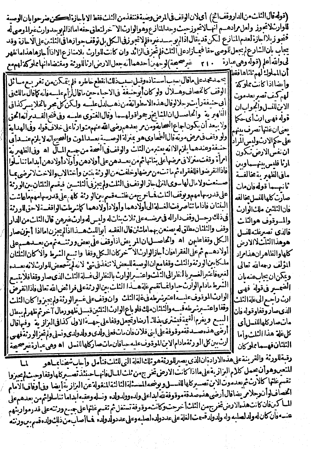 وَفِيهَا قَالَ أَرْضِي هَذِهِ صَدَقَةٌ مَوْقُوفَةٌ عَلَى ابْنِي فُلَانٍ فَإِنْ مَاتَ فَعَلَى وَلَدِي وَوَلَدِ وَلَدِي وَنَسْلِي وَلَمْ تُجِزْ الْوَرَثَةُ فَهِيَ إرْثٌ بَيْنَ كُلِّ الْوَرَثَةِ مَا دَامَ الِابْنُ الْمَوْقُوفُ عَلَيْهِ حَيًّا فَإِنْ مَاتَ صَارَ كُلُّهَا لِلنَّسْلِ. اهـ.