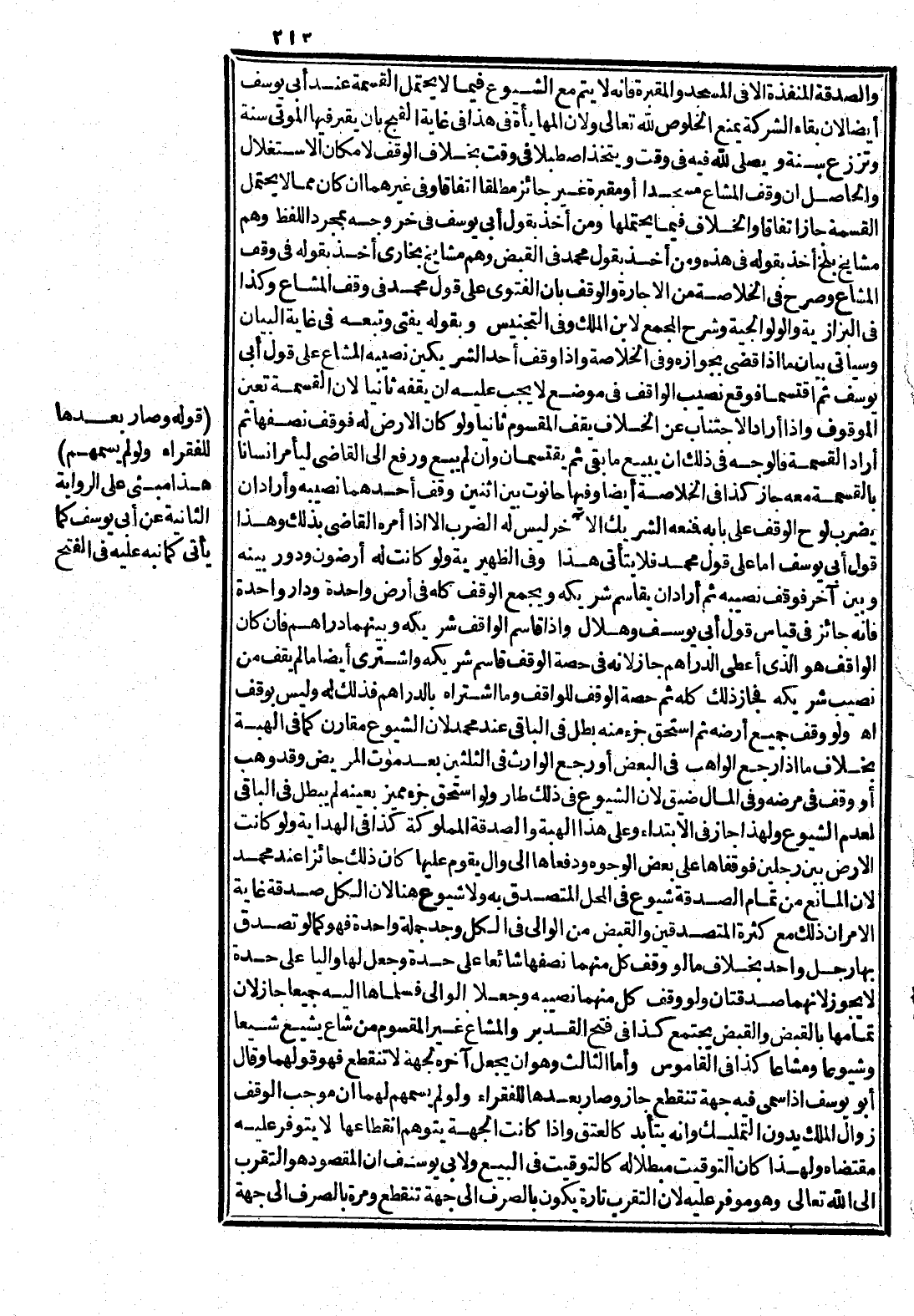 كَذَا فِي فَتْحِ الْقَدِيرِ وَالْمُشَاعُ غَيْرُ الْمَقْسُومِ مِنْ شَاعَ يَشِيعُ شَيْعًا وَشُيُوعًا وَمَشَاعًا كَذَا فِي الْقَامُوسِ وَأَمَّا الثَّالِثُ وَهُوَ أَنْ يَجْعَلَ آخِرَهُ لِجِهَةٍ لَا تَنْقَطِعُ فَهُوَ قَوْلُهُمَا وَقَالَ أَبُو يُوسُفَ إذَا سَمَّى فِيهِ جِهَةً تَنْقَطِعُ جَازَ وَصَارَ بَعْدَهَا لِلْفُقَرَاءِ وَلَوْ لَمْ يُسَمِّهِمْ لَهُمَا أَنَّ مُوجِبَ الْوَقْفِ زَوَالُ الْمِلْكِ بِدُونِ التَّمْلِيكِ وَأَنَّهُ يَتَأَبَّدُ كَالْعِتْقِ وَإِذَا كَانَتْ الْجِهَةُ يُتَوَهَّمُ انْقِطَاعُهَا لَا يَتَوَفَّرُ عَلَيْهِ مُقْتَضَاهُ وَلِهَذَا كَانَ التَّوْقِيتُ مُبْطِلًا لَهُ كَالتَّوْقِيتِ فِي الْبَيْعِ وَلِأَبِي يُوسُفَ أَنَّ الْمَقْصُودَ هُوَ التَّقَرُّبُ إلَى اللَّهِ تَعَالَى وَهُوَ مُوَفَّرٌ عَلَيْهِ لِأَنَّ التَّقَرُّبَ تَارَةً يَكُونُ بِالصَّرْفِ إلَى جِهَةٍ تَنْقَطِعُ وَمَرَّةً بِالصَّرْفِ إلَى جِهَةٍ