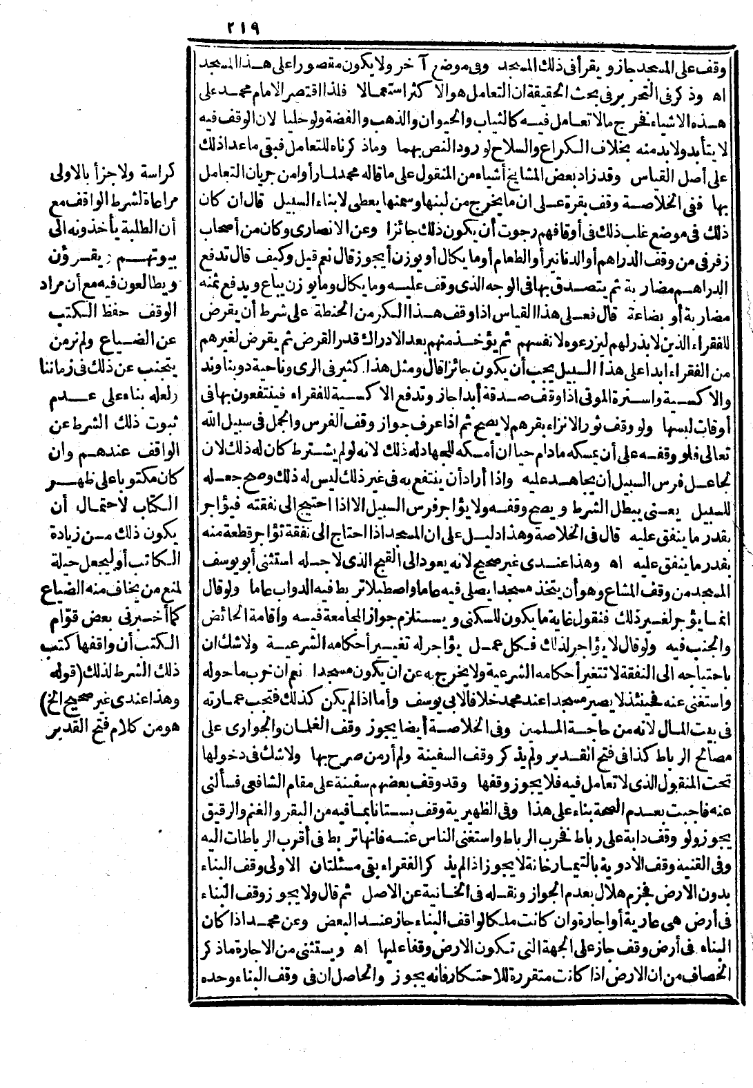 وَهَذَا عِنْدِي غَيْرُ صَحِيحٍ لِأَنَّهُ يَعُودُ إلَى الْقُبْحِ الَّذِي لِأَجْلِهِ اسْتَثْنَى أَبُو يُوسُفَ الْمَسْجِدَ مِنْ وَقْفِ الْمُشَاعِ وَهُوَ أَنْ يَتَّخِذَ مَسْجِدًا يُصَلَّى فِيهِ عَامًا وَإِصْطَبْلًا تُرْبَطُ فِيهِ الدَّوَابُّ عَامًا وَلَوْ قَالَ إنَّمَا يُؤَجَّرُ لِغَيْرِ ذَلِكَ فَنَقُولُ غَايَةُ مَا يَكُونُ لِلسُّكْنَى وَيَسْتَلْزِمُ جَوَازَ الْمُجَامَعَةِ فِيهِ وَإِقَامَةَ الْحَائِضِ وَالْجُنُبِ فِيهِ وَلَوْ قَالَ لَا يُؤَاجَرُ لِذَلِكَ فَكُلُّ عَمَلٍ يُؤَاجَرُ لَهُ تَغْيِيرُ أَحْكَامِهِ الشَّرْعِيَّةِ وَلَا شَكَّ أَنَّ بِاحْتِيَاجِهِ إلَى النَّفَقَةِ لَا تَتَغَيَّرُ أَحْكَامُهُ الشَّرْعِيَّةُ وَلَا يَخْرُجُ بِهِ عَنْ أَنْ يَكُونَ مَسْجِدًا نَعَمْ إنْ خَرِبَ مَا حَوْلَهُ وَاسْتَغْنَى عَنْهُ فَحِينَئِذٍ لَا يَصِيرُ مَسْجِدًا عِنْدَ مُحَمَّدٍ خِلَافًا لِأَبِي يُوسُفَ وَأَمَّا إذَا لَمْ يَكُنْ كَذَلِكَ فَتَجِبُ عِمَارَتُهُ فِي بَيْتِ الْمَالِ لِأَنَّهُ مِنْ حَاجَةِ الْمُسْلِمِينَ وَفِي الْخُلَاصَةِ أَيْضًا يَجُوزُ وَقْفُ الْغِلْمَانِ وَالْجَوَارِي عَلَى مَصَالِحِ الرِّبَاطِ كَذَا فِي فَتْحِ الْقَدِيرِ وَلَمْ يَذْكُرْ وَقْفَ السَّفِينَةِ وَلَمْ أَرَ مَنْ صَرَّحَ بِهَا وَلَا شَكَّ فِي دُخُولِهَا تَحْتَ الْمَنْقُولِ الَّذِي لَا تَعَامُلَ فِيهِ فَلَا يَجُوزُ وَقْفُهَا وَقَدْ وَقَفَ بَعْضُهُمْ سَفِينَةً عَلَى مَقَامِ الشَّافِعِيِّ فَسَأَلَنِي عَنْهُ فَأَجَبْتُ بِعَدَمِ الصِّحَّةِ بِنَاءً عَلَى هَذَا وَفِي الظَّهِيرِيَّةِ وَقَفَ بُسْتَانًا بِمَا فِيهِ مِنْ الْبَقَرِ وَالْغَنَمِ وَالرَّقِيقِ يَجُوزُ وَلَوْ وَقَفَ دَابَّةً عَلَى رِبَاطٍ فَخَرِبَ الرِّبَاطُ وَاسْتَغْنَى النَّاسُ عَنْهُ فَإِنَّهَا تُرْبَطُ فِي أَقْرَبِ الرِّبَاطَاتِ إلَيْهِ.