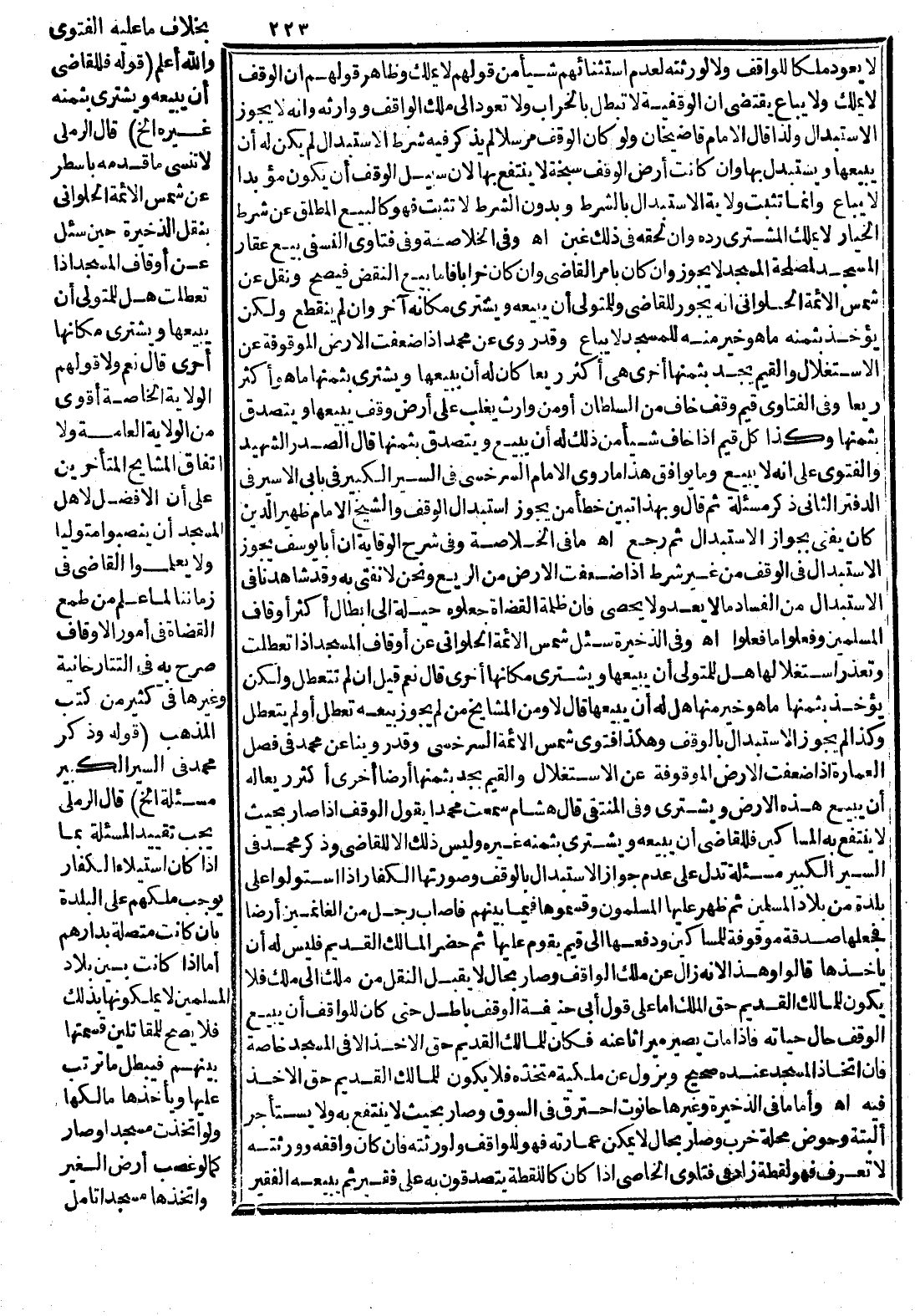 ـــــــــــــــــــــــــــــQبِخِلَافِ مَا عَلَيْهِ الْفَتْوَى وَاَللَّهُ أَعْلَمُ (قَوْلُهُ فَلِلْقَاضِي أَنْ يَبِيعَهُ وَيَشْتَرِيَ بِثَمَنِهِ غَيْرَهُ إلَخْ) قَالَ الرَّمْلِيُّ لَا تَنْسَ مَا قَدَّمَهُ بِأَسْطُرٍ عَنْ شَمْسِ الْأَئِمَّةِ الْحَلْوَانِيِّ بِنَقْلِ الذَّخِيرَةِ حِينَ سُئِلَ عَنْ أَوْقَافِ الْمَسْجِدِ إذَا تَعَطَّلَتْ هَلْ لِلْمُتَوَلِّي أَنْ يَبِيعَهَا وَيَشْتَرِيَ مَكَانَهَا أُخْرَى قَالَ نَعَمْ وَلَا قَوْلُهُمْ الْوِلَايَةُ الْخَاصَّةُ أَقْوَى مِنْ الْوِلَايَةِ الْعَامَّةِ وَلَا اتِّفَاقُ الْمَشَايِخِ الْمُتَأَخِّرِينَ عَلَى أَنَّ الْأَفْضَلَ لِأَهْلِ الْمَسْجِدِ أَنْ يَنْصِبُوا مُتَوَلِّيًا وَلَا يُعْلِمُوا الْقَاضِيَ فِي زَمَانِنَا لِمَا عُلِمَ مِنْ طَمَعِ الْقُضَاةِ فِي أُمُورِ الْأَوْقَافِ صَرَّحَ بِهِ فِي التَّتَارْخَانِيَّة وَغَيْرِهَا فِي كَثِيرٍ مِنْ كُتُبِ الْمَذْهَبِ (قَوْلُهُ وَذَكَرَ مُحَمَّدٌ فِي السِّيَرِ الْكَبِيرِ مَسْأَلَةً إلَخْ) قَالَ الرَّمْلِيُّ يَجِبُ تَقْيِيدُ الْمَسْأَلَةِ بِمَا إذَا كَانَ اسْتِيلَاءُ الْكُفَّارِ يُوجِبُ مِلْكَهُمْ عَلَى الْبَلْدَةِ بِأَنْ كَانَتْ مُتَّصِلَةً بِدَارِهِمْ أَمَّا إذَا كَانَتْ بَيْنَ بِلَادِ الْمُسْلِمِينَ لَا يَمْلِكُونَهَا بِذَلِكَ فَلَا يَصِحُّ لِلْمُقَاتِلِينَ قِسْمَتُهَا بَيْنَهُمْ فَيَبْطُلُ مَا تَرَتَّبَ عَلَيْهَا وَيَأْخُذُهَا مَالِكُهَا وَلَوْ اُتُّخِذَتْ مَسْجِدًا وَصَارَ كَمَا لَوْ غَصَبَ أَرْضَ الْغَيْرِ وَاتَّخَذَهَا مَسْجِدًا تَأَمَّلْ