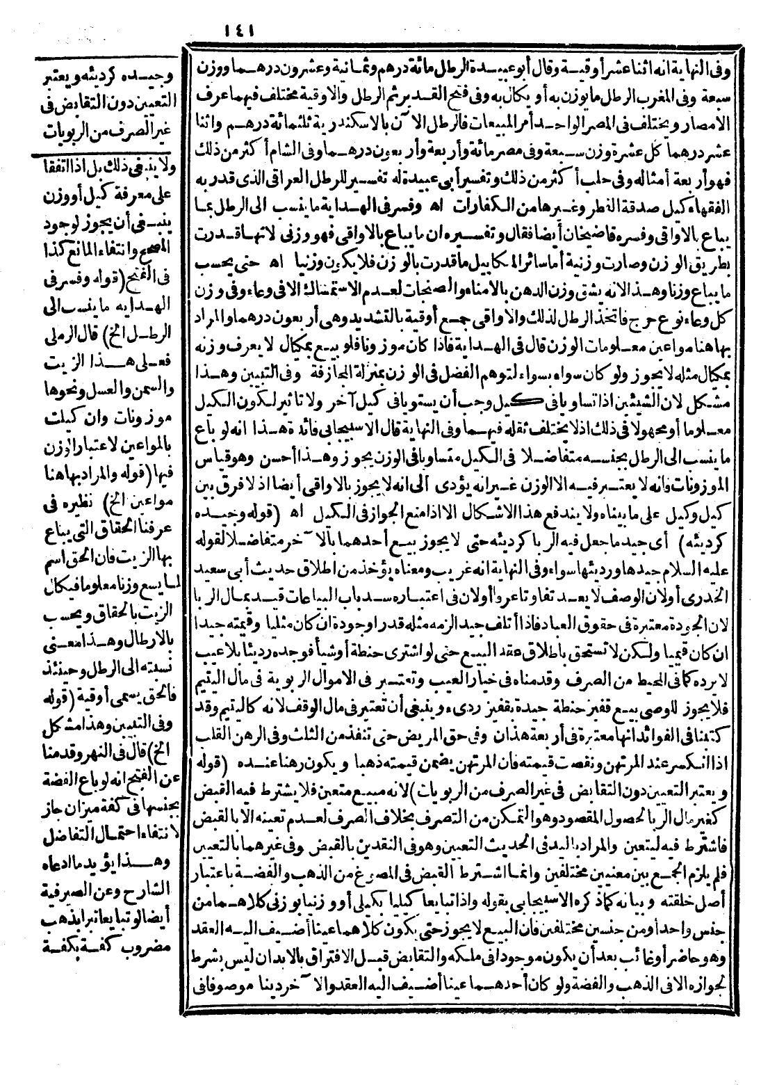 وَفَسَّرَ فِي الْهِدَايَةِ مَا يُنْسَبُ إلَى الرِّطْلِ بِمَا يُبَاعُ بِالْأَوَاقِيِ، وَفَسَّرَهُ قَاضِي خَانْ أَيْضًا فَقَالَ وَتَفْسِيرُهُ أَنَّ مَا يُبَاعُ بِالْأَوَاقِيِ فَهُوَ وَزْنِيٌّ لِأَنَّهَا قُدِّرَتْ بِطَرِيقِ الْوَزْنِ، وَصَارَتْ وَزْنِيَّةً أَمَّا سَائِرُ الْمَكَايِيلِ مَا قُدِّرَتْ بِالْوَزْنِ فَلَا يَكُونُ وَزْنِيًّا اهـ.