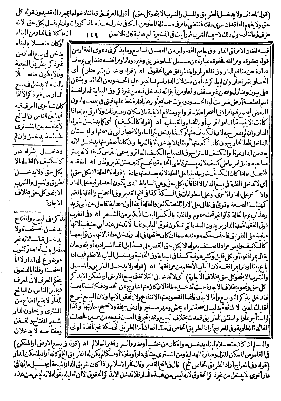 ـــــــــــــــــــــــــــــQبَابُ الْحُقُوقِ (قَوْلُ الْمُصَنِّفِ، وَلَا يَدْخُلُ الطَّرِيقُ وَالْمَسِيلُ وَالشِّرْبُ إلَّا بِنَحْوِ كُلِّ حَقٍّ) أَقُولُ: الْعُرْفُ فِي زَمَانِنَا دُخُولُهَا بِمُجَرَّدِ الْعَقْدِ بِدُونِ قَوْلِهِ كُلُّ حَقٍّ، وَلَا يَفْهَمُ الْعَاقِدُ أَنَّ سِوَى ذَلِكَ فَمُقْتَضَى مَا مَرَّ فِي مَسْأَلَةِ الْعُلْوِ عَنْ الْكَافِي دُخُولُ هَذِهِ الْمَذْكُورَاتِ، وَإِنْ لَمْ يَقُلْ بِكُلِّ حَقٍّ لِأَنَّ عُرْفَ زَمَانِنَا دُخُولُ ذَلِكَ لَا سِيَّمَا الشُّرْبُ ثُمَّ رَأَيْت فِي الذَّخِيرَةِ الْبُرْهَانِيَّةِ قَالَ فَالْأَصْلُ أَنَّ مَا كَانَ فِي الدَّارِ مِنْ الْبِنَاءِ أَوْ كَانَ مُتَّصِلًا بِالْبِنَاءِ يَدْخُلُ فِي بَيْعِ الدَّارِ مِنْ غَيْرِ ذِكْرٍ بِطَرِيقِ التَّبَعِيَّةِ، وَمَا لَا يَكُونُ مُتَّصِلًا بِالْبِنَاءِ لَا يَدْخُلُ فِي بَيْعِ الدَّارِ مِنْ غَيْرِ ذِكْرٍ إلَّا إذَا كَانَ شَيْئًا جَرَى الْعُرْفُ فِيهِ فِيمَا بَيْنَ النَّاسِ أَنَّ الْبَائِعَ لَا يَمْنَعُهُ عَنْ الْمُشْتَرِي فَحِينَئِذٍ يَدْخُلُ، وَإِنْ لَمْ يَذْكُرْهُ فِي الْبَيْعِ، وَالْمِفْتَاحُ يَدْخُلُ اسْتِحْسَانًا، وَلَا يَدْخُلُ قِيَاسًا لِأَنَّهُ غَيْرُ مُتَّصِلٍ بِالْبِنَاءِ فَصَارَ كَثَوْبٍ مَوْضُوعٍ فِي الدَّارِ إلَّا أَنَّا اسْتَحْسَنَّا، وَقُلْنَا بِالدُّخُولِ بِحُكْمِ الْعُرْفِ لِأَنَّ الْعُرْفَ فِيمَا بَيْنَ النَّاسِ أَنَّ الْبَائِعَ لِلدَّارِ لَا يَمْنَعُ الْمِفْتَاحَ عَنْ الْمُشْتَرِي، وَيُسَلِّمُونَ الدَّارَ بِتَسْلِيمِ الْمِفْتَاحِ، وَالْقُفْلُ وَمِفْتَاحُهُ لَا يَدْخُلَانِ، وَالسُّلَّمُ إنْ كَانَ مُتَّصِلًا بِالْبِنَاءِ يَدْخُلُ سَوَاءٌ كَانَ مِنْ خَشَبٍ أَوْ مَدَرٍ، وَالسُّرَرُ نَظِيرُ السَّلَالِمِ. اهـ.