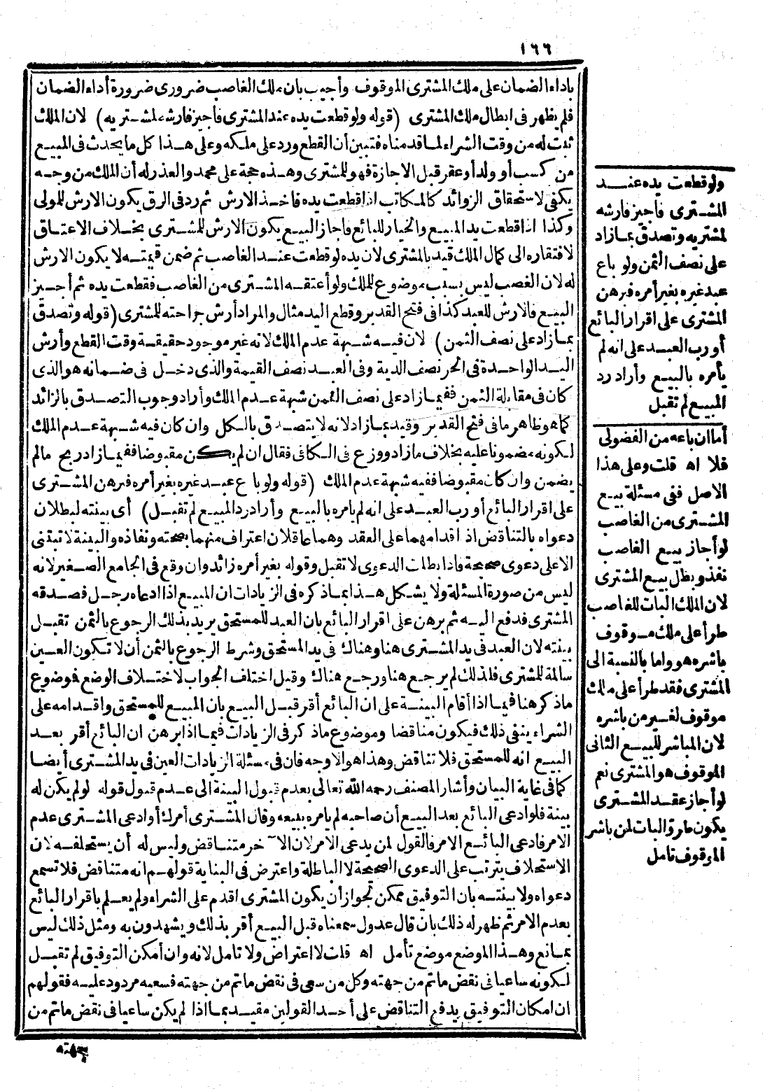 بِأَدَاءِ الضَّمَانِ عَلَى مِلْكِ الْمُشْتَرِي الْمَوْقُوفِ، وَأُجِيبَ بِأَنَّ مِلْكَ الْغَاصِبِ ضَرُورِيٌّ ضَرُورَةَ أَدَاءِ الضَّمَانِ فَلَمْ يَظْهَرْ فِي إبْطَالِ مِلْكِ الْمُشْتَرِي.