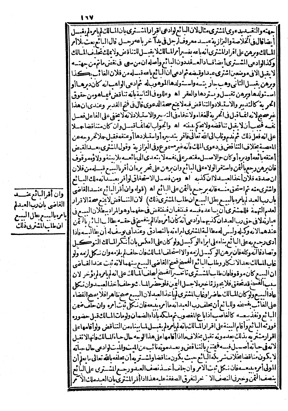 وَالْجَوَابُ أَنَّهُ إنَّمَا قُبِلَ، وَإِنْ كَانَ مُتَنَاقِضًا حَمْلًا عَلَى أَنَّهُ فَعَلَ ذَلِكَ ثُمَّ نَدِمَ وَتَابَ إلَى اللَّهِ تَعَالَى فَأَقَرَّ بِتَدْبِيرِهِ أَوْ اسْتِيلَادِهَا أَوْ عِتْقِهِ فَقُبِلَ حَمْلًا لِخُرُوجِهِ عَنْ الْمَعْصِيَةِ بِخِلَافِ التَّنَاقُضِ فِي دَعْوَى الْمِلْكِ فَإِنَّهُ غَيْرُ مَسْمُوعٍ، وَفِي الْبَزَّازِيَّةِ، وَقَوْلُ الْمُشْتَرِي بَعْدَ الْقَبْضِ أَعْتَقَهُ بَائِعُهُ أَوْ دَبَّرَهُ أَوْ كَانَ حُرَّ الْأَصْلِ مُقْتَصِرٌ عَلَى نَفْسِهِ لَا يَتَعَدَّى إلَى بَائِعِهِ بِلَا بَيِّنَةٍ، وَوَلَاؤُهُ مَوْقُوفٌ فَإِنْ بَرْهَنَ رَجَعَ بِالثَّمَنِ، وَاسْتَقَرَّ الْوَلَاءُ عَلَى الْبَائِعِ، وَإِنْ بَرْهَنَ عَلَى تَحْرِيرِهِ إنْ أَقَرَّ بِالْبَيْعِ قَبْلَهُ مِنْ فُلَانٍ إنْ صَدَّقَهُ فُلَانٌ أَخَذَ الْعَبْدَ لَا إنْ كَذَّبَهُ. اهـ.