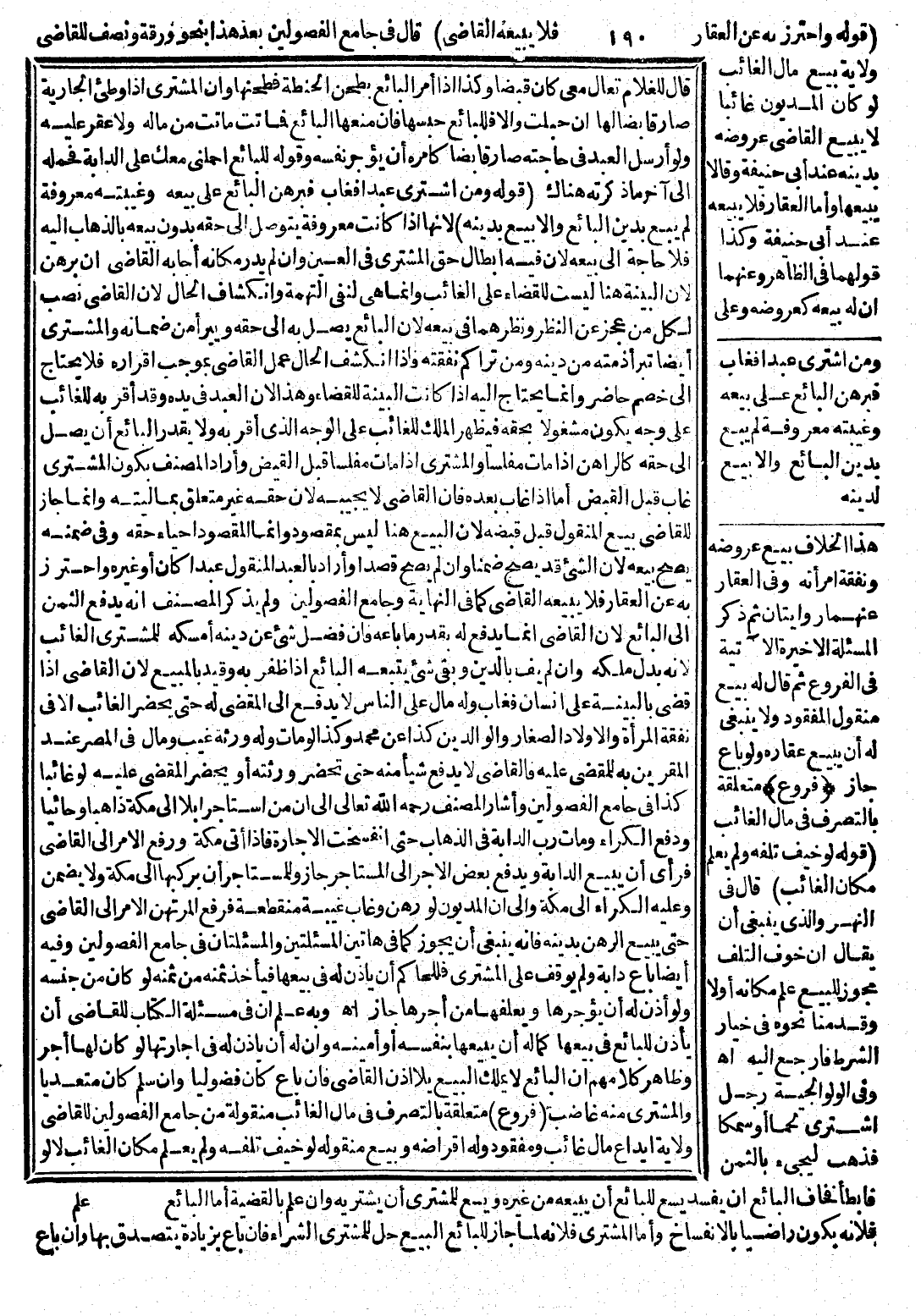 ـــــــــــــــــــــــــــــQ (قَوْلُهُ: وَاحْتُرِزَ بِهِ عَنْ الْعَقَارِ فَلَا يَبِيعُهُ الْقَاضِي) قَالَ فِي جَامِعِ الْفُصُولَيْنِ بَعْدَ هَذَا بِنَحْوِ وَرَقَةٍ وَنِصْفٍ لِلْقَاضِي وِلَايَةُ بَيْعِ مَالِ الْغَائِبِ لَوْ كَانَ الْمَدْيُون غَائِبًا لَا يَبِيعُ الْقَاضِي عُرُوضَهُ بِدَيْنِهِ عِنْدَ أَبِي حَنِيفَةَ، وَقَالَا يَبِيعُهَا، وَأَمَّا الْعَقَارُ فَلَا يَبِيعُهُ عِنْدَ أَبِي حَنِيفَةَ وَكَذَا قَوْلُهُمَا وَفِي الظَّاهِرِ وَعَنْهُمَا أَنَّ لَهُ بَيْعَهُ كَعُرُوضِهِ وَعَلَى هَذَا الْخِلَافِ بَيْعُ عُرُوضِهِ وَنَفَقَةُ امْرَأَتِهِ وَفِي الْعَقَارِ عَنْهُمَا رِوَايَتَانِ ثُمَّ ذَكَرَ الْمَسْأَلَةَ الْأَخِيرَةَ الْآتِيَةَ فِي الْفُرُوعِ، ثُمَّ قَالَ لَهُ بَيْعُ مَنْقُولِ الْمَفْقُودِ وَلَا يَنْبَغِي لَهُ أَنْ يَبِيعَ عَقَارَهُ وَلَوْ بَاعَ جَازَ.