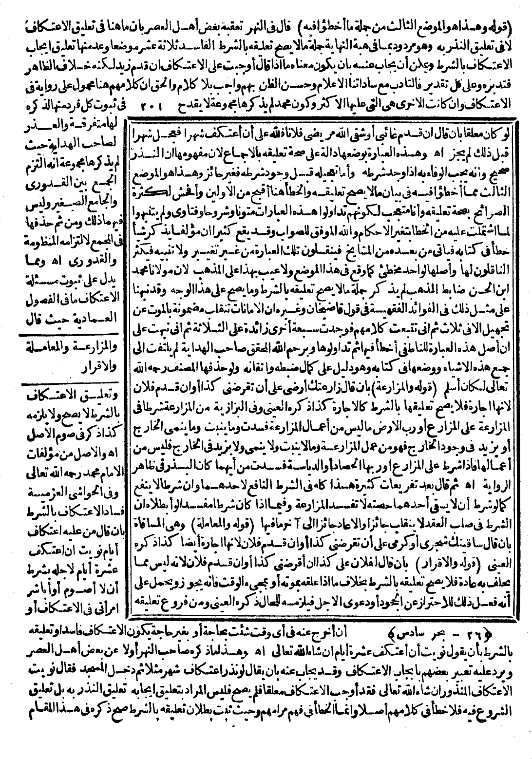 وَالْأَصْلُ مِنْ مُؤَلَّفَاتِ الْإِمَامِ مُحَمَّدٍ - رَحِمَهُ اللَّهُ تَعَالَى - وَفِي الْحَوَاشِي الْعَزْمِيَّةِ فَسَادُ الِاعْتِكَافِ بِالشَّرْطِ بِأَنْ قَالَ مَنْ عَلَيْهِ اعْتِكَافُ أَيَّامٍ نَوَيْت أَنْ أَعْتَكِفَ عَشَرَةَ أَيَّامٍ لِأَجَلِهِ بِشَرْطِ أَنْ لَا أَصُومَ أَوْ أُبَاشِرَ امْرَأَتِي فِي الِاعْتِكَافِ أَوْ أَنْ أَخْرُجَ عَنْهُ فِي أَيِّ وَقْتٍ شِئْت بِحَاجَةٍ أَوْ بِغَيْرِ حَاجَةٍ يَكُونُ الِاعْتِكَافُ فَاسِدًا وَتَعْلِيقُهُ بِالشَّرْطِ بِأَنْ يَقُولَ نَوَيْت أَنْ أَعْتَكِفَ عَشَرَةَ أَيَّامٍ إنْ شَاءَ اللَّهُ تَعَالَى. اهـ.