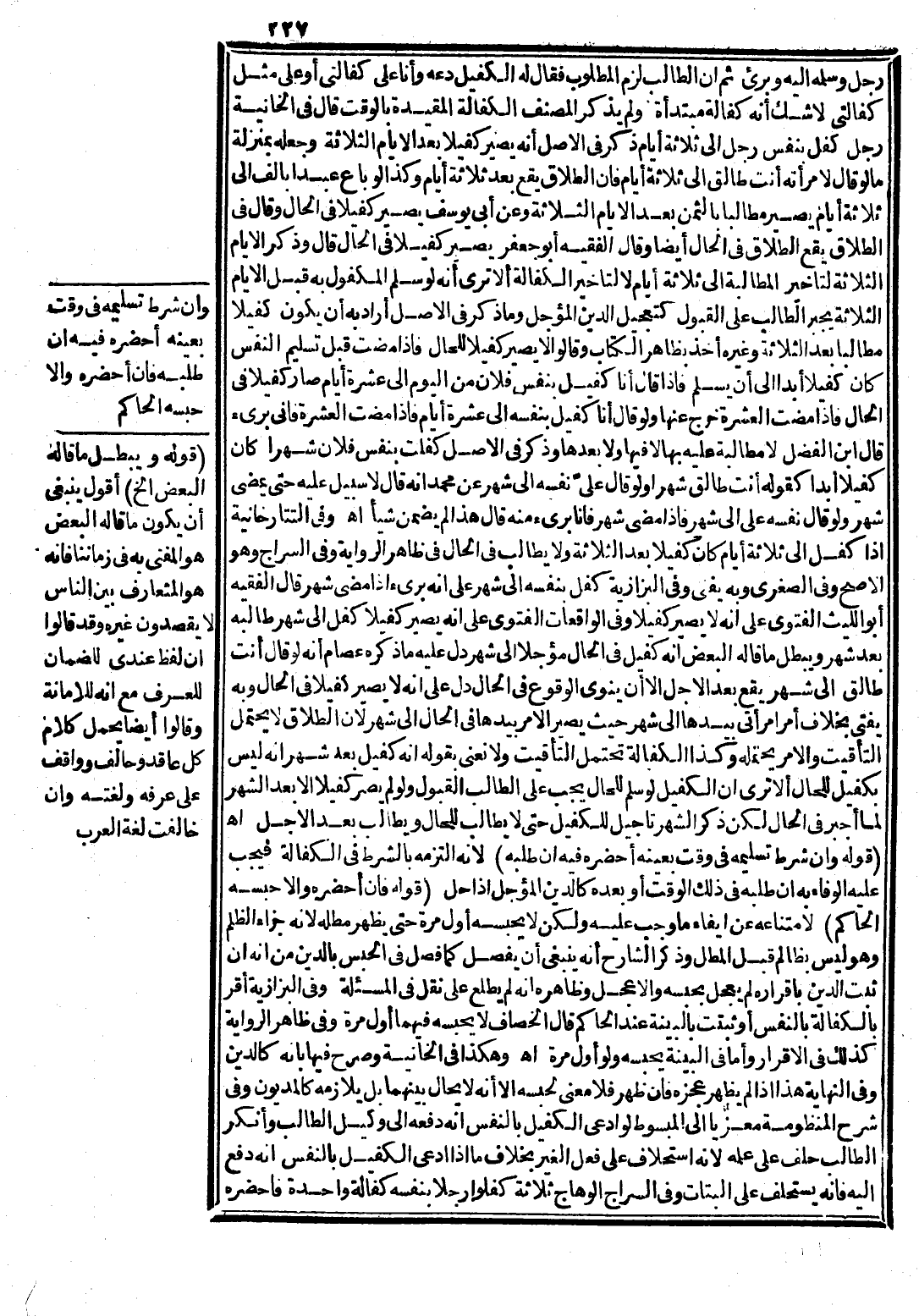 قَوْلُهُ (وَإِنْ شَرَطَ تَسْلِيمَهُ فِي وَقْتٍ بِعَيْنِهِ أَحْضَرَهُ فِيهِ إنْ طَلَبَهُ) ؛ لِأَنَّهُ الْتَزَمَهُ بِالشَّرْطِ فِي الْكَفَالَةِ فَيَجِبُ عَلَيْهِ الْوَفَاءُ بِهِ إنْ طَلَبَهُ فِي ذَلِكَ الْوَقْتِ أَوْ بَعْدَهُ كَالدَّيْنِ الْمُؤَجَّلِ إذَا حَلَّ. قَوْلُهُ (فَإِنْ أَحْضَرَهُ وَإِلَّا حَبَسَهُ الْحَاكِمُ) لِامْتِنَاعِهِ عَنْ إيفَاءِ مَا وَجَبَ عَلَيْهِ وَلَكِنْ لَا يَحْبِسُهُ أَوَّلَ مَرَّةٍ حَتَّى يَظْهَرَ مَطْلُهُ؛ لِأَنَّهُ جَزَاءُ الظُّلْمِ وَهُوَ لَيْسَ بِظَالِمٍ قَبْلَ الْمَطْلِ، وَذَكَرَ الشَّارِحُ أَنَّهُ يَنْبَغِي أَنْ يُفَصِّلَ كَمَا فَصَّلَ فِي الْحَبْسِ بِالدَّيْنِ مِنْ أَنَّهُ إنْ ثَبَتَ الدَّيْنُ بِإِقْرَارِهِ لَمْ يُعَجِّلْ بِحَبْسِهِ وَإِلَّا عَجَّلَ وَظَاهِرُهُ أَنَّهُ لَمْ يَطَّلِعْ عَلَى نَقْلٍ فِي الْمَسْأَلَةِ، وَفِي الْبَزَّازِيَّةِ أَقَرَّ بِالْكَفَالَةِ بِالنَّفْسِ أَوْ ثَبَتَتْ بِالْبَيِّنَةِ عِنْدَ الْحَاكِمِ قَالَ الْخَصَّافُ لَا يَحْبِسُهُ فِيهِمَا أَوَّلَ مَرَّةٍ وَفِي ظَاهِرِ الرِّوَايَةِ كَذَلِكَ فِي الْإِقْرَارِ، وَأَمَّا فِي الْبَيِّنَةِ يَحْبِسُهُ وَلَوْ أَوَّلَ مَرَّةٍ. اهـ.