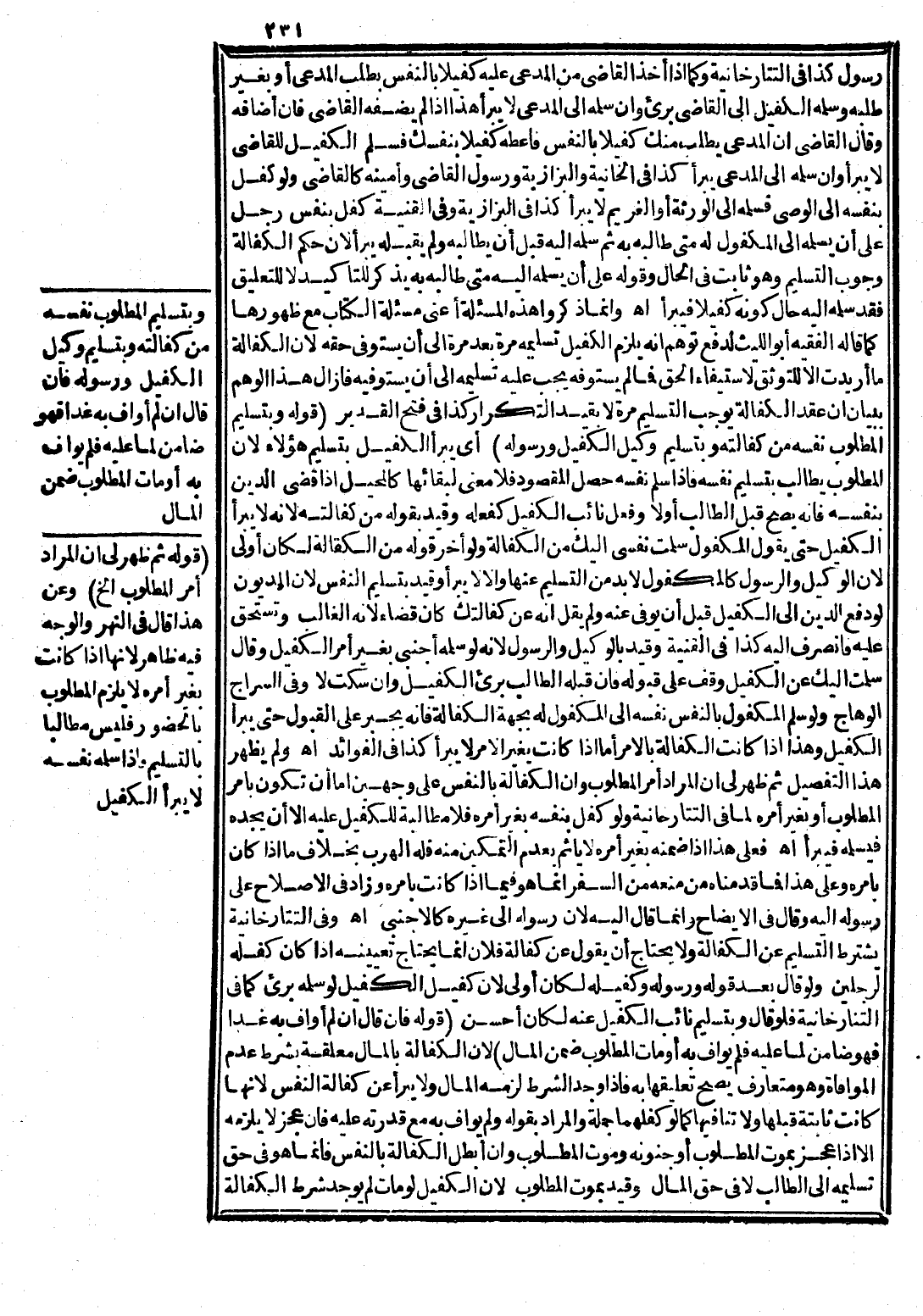 وَلَمْ يَظْهَرْ هَذَا التَّفْصِيلُ ثُمَّ ظَهَرَ لِي أَنَّ الْمُرَادَ أَمْرُ الْمَطْلُوبِ وَأَنَّ الْكَفَالَةَ بِالنَّفْسِ عَلَى وَجْهَيْنِ: إمَّا أَنْ تَكُونَ بِأَمْرِ الْمَطْلُوبِ أَوْ بِغَيْرِ أَمْرِهِ لِمَا فِي التَّتَارْخَانِيَّة وَلَوْ كَفَلَ بِنَفْسِهِ بِغَيْرِ أَمْرِهِ فَلَا مُطَالَبَةَ لِلْكَفِيلِ عَلَيْهِ إلَّا أَنْ يَجِدَهُ فَيُسَلِّمَهُ فَيَبْرَأَ. اهـ.