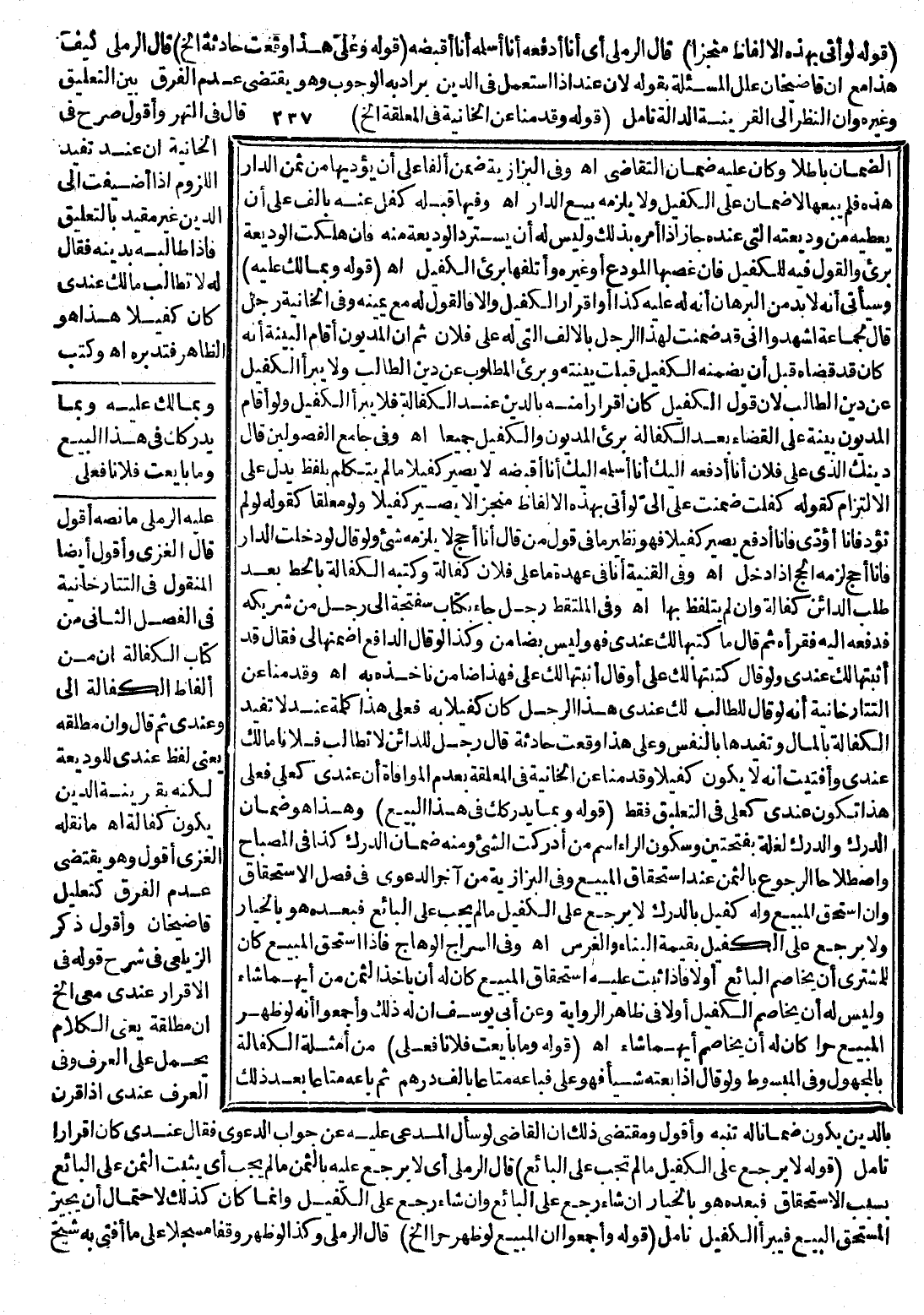 وَكَتَبَ عَلَيْهِ الرَّمْلِيُّ مَا نَصُّهُ أَقُولُ: قَالَ الْغَزِّيِّ وَأَقُولُ: أَيْضًا الْمَنْقُولُ فِي التَّتَارْخَانِيَّة فِي الْفَصْلِ الثَّانِي مِنْ كِتَابِ الْكَفَالَةِ أَنَّ مِنْ أَلْفَاظِ الْكَفَالَةِ إلَيَّ وَعِنْدِي، ثُمَّ قَالَ وَإِنَّ مُطْلَقَهُ يَعْنِي لَفْظَ عِنْدِي لِلْوَدِيعَةِ لَكِنَّهُ بِقَرِينَةِ الدَّيْنِ يَكُونُ كَفَالَةً. اهـ.