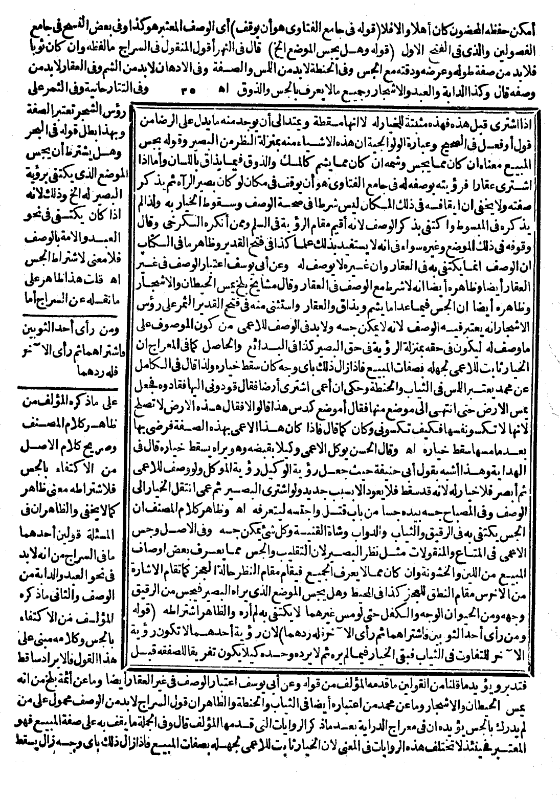 وَظَاهِرُ مَا فِي الْكِتَابِ أَنَّ الْوَصْفَ إنَّمَا يَكْتَفِي بِهِ فِي الْعَقَارِ وَأَنَّ غَيْرَهُ لَا يُوصَفُ لَهُ وَعَنْ أَبِي يُوسُفَ اعْتِبَارُ الْوَصْفِ فِي غَيْرِ الْعَقَارِ أَيْضًا وَظَاهِرُهُ أَيْضًا أَنَّهُ لَا شَرْطَ مَعَ الْوَصْفِ فِي الْعَقَارِ وَقَالَ مَشَايِخُ بَلْخٍ يَمَسُّ الْحِيطَانَ وَالْأَشْجَارَ وَظَاهِرُهُ أَيْضًا أَنَّ الْجَسَّ فِيمَا عَدَا مَا يُشَمُّ وَيُذَاقُ وَالْعَقَارَ وَاسْتَثْنَى مِنْهُ فِي فَتْحِ الْقَدِيرِ الثَّمَرَ عَلَى رُءُوسِ الْأَشْجَارِ أَنَّهُ يُعْتَبَرُ فِيهِ الْوَصْفُ لِأَنَّهُ لَا يُمْكِنُ جَسُّهُ وَلَا بُدَّ فِي الْوَصْفِ لِلْأَعْمَى مِنْ كَوْنِ الْمَوْصُوفِ عَلَى مَا وُصِفَ لَهُ لِيَكُونَ فِي حَقِّهِ بِمَنْزِلَةِ الرُّؤْيَةِ فِي حَقِّ الْبَصِيرِ كَذَا فِي الْبَدَائِعِ.