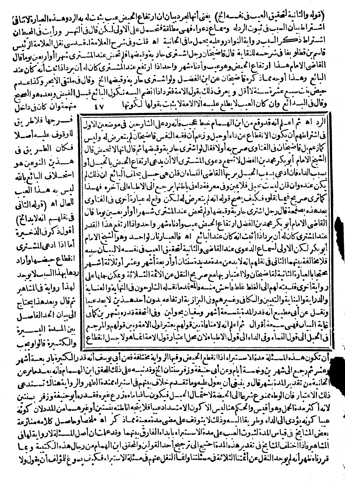 وَحَاصِلُ كَلَامِهِ مُنَازَعَةُ بَعْضِ الْمَشَايِخِ فِي قِيَاسِ الْمُدَّةِ لِثُبُوتِ الْعَيْبِ عَلَى مُدَّةِ الِاسْتِبْرَاءِ بِإِبْدَاءِ الْفَارِقِ بَيْنَهُمَا وَقَدْ عَلِمْت أَنَّ أَصْلَ الْمَسْأَلَةِ لَا رِوَايَةَ لَهَا فِي الْمَشَاهِيرِ فَإِذَا اخْتَلَفَ الْمَشَايِخُ فِي تَقْدِيرِ هَذِهِ الْمُدَّةِ اُحْتِيجَ إلَى تَرْجِيحِ أَحَدِ الْقَوْلَيْنِ وَالْمُحَقِّقُ ابْنِ الْهُمَامِ مِنْ رِجَالِ هَذِهِ الْكَتِيبَةِ وَبِمَا قَرَرْنَاهُ ظَهَرَ أَنَّهُ لَمْ يُوجَدْ النَّقْلُ عَنْ أَئِمَّتِنَا الثَّلَاثَةِ فِي مَسْأَلَتِنَا وَإِنَّمَا النَّقْلُ عَنْهُمْ فِي مَسْأَلَةِ الِاسْتِبْرَاءِ فَكَيْفَ يُسَوَّغُ لِلْمُؤَلِّفِ أَنْ يَقُولَ وَلَا