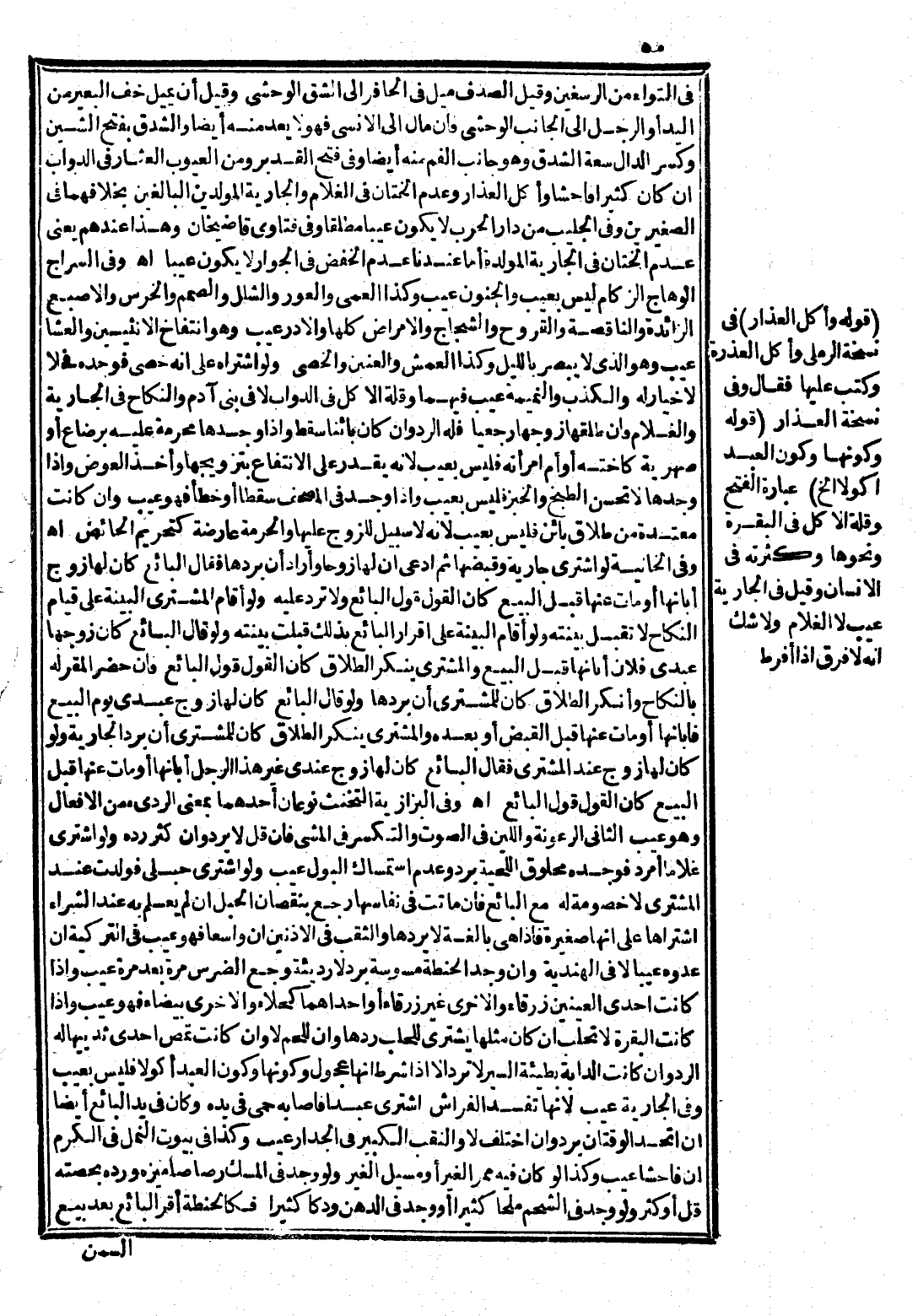 وَفِي السِّرَاجِ الْوَهَّاجِ الزُّكَامُ لَيْسَ بِعَيْبٍ وَالْجُنُونُ عَيْبٌ وَكَذَا الْعَمَى وَالْعَوَرُ وَالشَّلَلُ وَالصَّمَمُ وَالْخَرَسُ وَالْإِصْبَعُ الزَّائِدَةُ وَالنَّاقِصَةُ وَالْقُرُوحُ وَالشِّجَاجُ وَالْأَمْرَاضُ كُلُّهَا وَالْأَدَرُ عَيْبٌ وَهُوَ انْتِفَاخُ الْأُنْثَيَيْنِ وَالْعَشَا عَيْبٌ وَهُوَ الَّذِي لَا يُبْصِرُ بِاللَّيْلِ وَكَذَا الْعَمَشُ وَالْعِنِّينُ وَالْخَصِيُّ وَلَوْ اشْتَرَاهُ عَلَى أَنَّهُ خَصِيٌّ فَوَجَدَهُ فَحْلًا لَا خِيَارَ لَهُ وَالْكَذِبُ وَالنَّمِيمَةُ عَيْبٌ فِيهِمَا وَقِلَّةُ الْأَكْلِ فِي الدَّوَابِّ لَا فِي بَنِي آدَمَ وَالنِّكَاحُ فِي الْجَارِيَةِ وَالْغُلَامِ وَإِنْ طَلَّقَهَا زَوْجُهَا رَجْعِيًّا فَلَهُ الرَّدُّ وَإِنْ كَانَ بَائِنًا سَقَطَ وَإِذَا وَجَدَهَا مُحَرَّمَةً عَلَيْهِ بِرَضَاعٍ أَوْ صِهْرِيَّةٍ كَأُخْتِهِ أَوْ أُمِّ امْرَأَتِهِ فَلَيْسَ بِعَيْبٍ لِأَنَّهُ يَقْدِرُ عَلَى الِانْتِفَاعِ بِتَزْوِيجِهَا وَأَخْذِ الْعِوَضِ وَإِذَا وَجَدَهَا لَا تُحْسِنُ الطَّبْخَ وَالْخَبْزَ فَلَيْسَ بِعَيْبٍ وَإِذَا وَجَدَ فِي الْمُصْحَفِ سَقْطًا أَوْ خَطَأً فَهُوَ عَيْبٌ وَإِنْ كَانَتْ مُعْتَدَّةً مِنْ طَلَاقِ بَائِنٍ فَلَيْسَ بِعَيْبٍ لِأَنَّهُ لَا سَبِيلَ لِلزَّوْجِ عَلَيْهَا وَالْحُرْمَةُ عَارِضَةٌ كَتَحْرِيمِ الْحَائِضِ. اهـ.