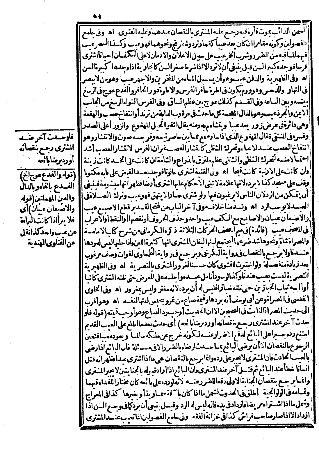 السَّمْنِ الذَّائِبِ بِمَوْتِ فَأْرَةٍ فِيهِ رَجَعَ عَلَيْهِ الْمُشْتَرِي بِالنُّقْصَانِ عِنْدَهُمَا وَعَلَيْهِ الْفَتْوَى اهـ.