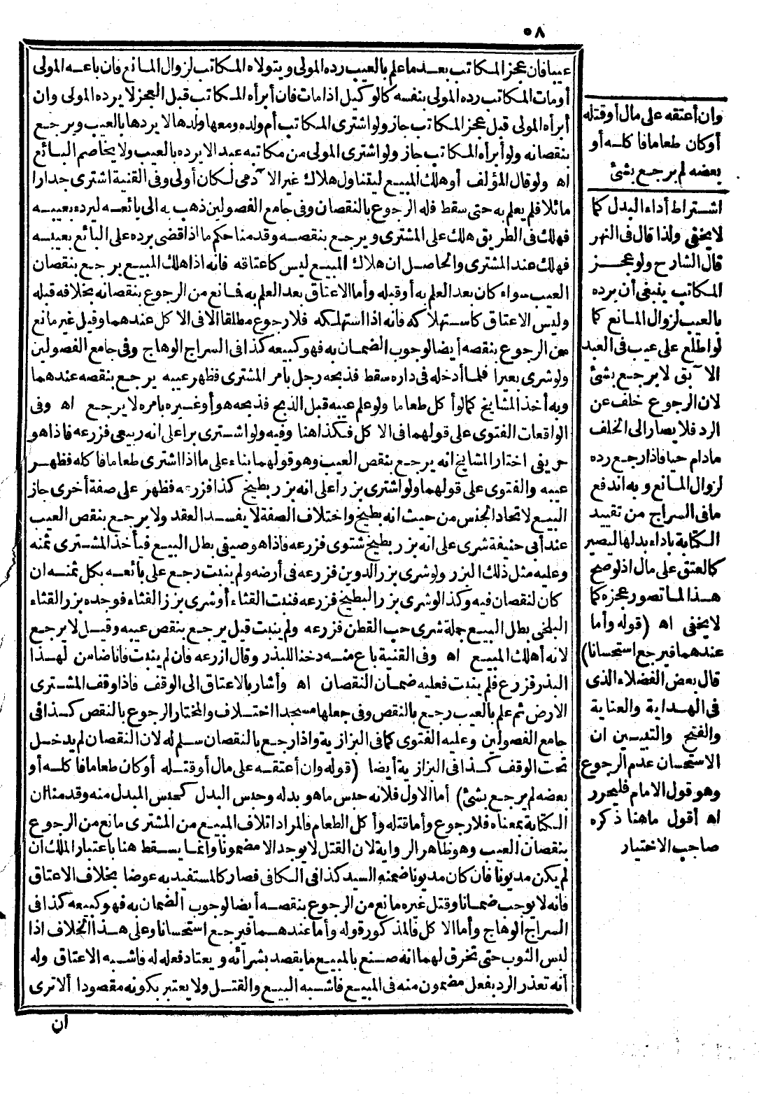 وَالْحَاصِلُ أَنَّ هَلَاكَ الْمَبِيعِ لَيْسَ كَإِعْتَاقِهِ فَإِنَّهُ إذَا هَلَكَ الْمَبِيعُ يَرْجِعُ بِنُقْصَانِ الْعَيْبِ سَوَاءٌ كَانَ بَعْدَ الْعِلْمِ بِهِ أَوْ قَبْلَهُ وَأَمَّا الْإِعْتَاقُ بَعْدَ الْعِلْمِ بِهِ فَمَانِعٌ مِنْ الرُّجُوعِ بِنُقْصَانِهِ بِخِلَافِهِ قَبْلَهُ وَلَيْسَ الْإِعْتَاقُ كَاسْتِهْلَاكِهِ فَإِنَّهُ إذَا اسْتَهْلَكَهُ فَلَا رُجُوعَ مُطْلَقًا إلَّا فِي الْأَكْلِ عِنْدَهُمَا وَقِيلَ غَيْرُ مَانِعٍ مِنْ الرُّجُوعِ بِنَقْصِهِ أَيْضًا لِوُجُوبِ الضَّمَانِ بِهِ فَهُوَ كَبَيْعِهِ كَذَا فِي السِّرَاجِ الْوَهَّاجِ وَفِي جَامِعِ الْفُصُولَيْنِ وَلَوْ شَرَى بَعِيرًا فَلَمَّا أَدْخَلَهُ فِي دَارِهِ سَقَطَ فَذَبَحَهُ رَجُلٌ بِأَمْرِ الْمُشْتَرِي فَظَهَرَ عَيْبُهُ يَرْجِعُ بِنَقْصِهِ عِنْدَهُمَا وَبِهِ أَخَذَ الْمَشَايِخُ كَمَا لَوْ أَكَلَ طَعَامًا وَلَوْ عَلِمَ عَيْبَهُ قَبْلَ الذَّبْحِ فَذَبَحَهُ هُوَ أَوْ غَيْرُهُ بِأَمْرِهِ لَا يَرْجِعُ اهـ.