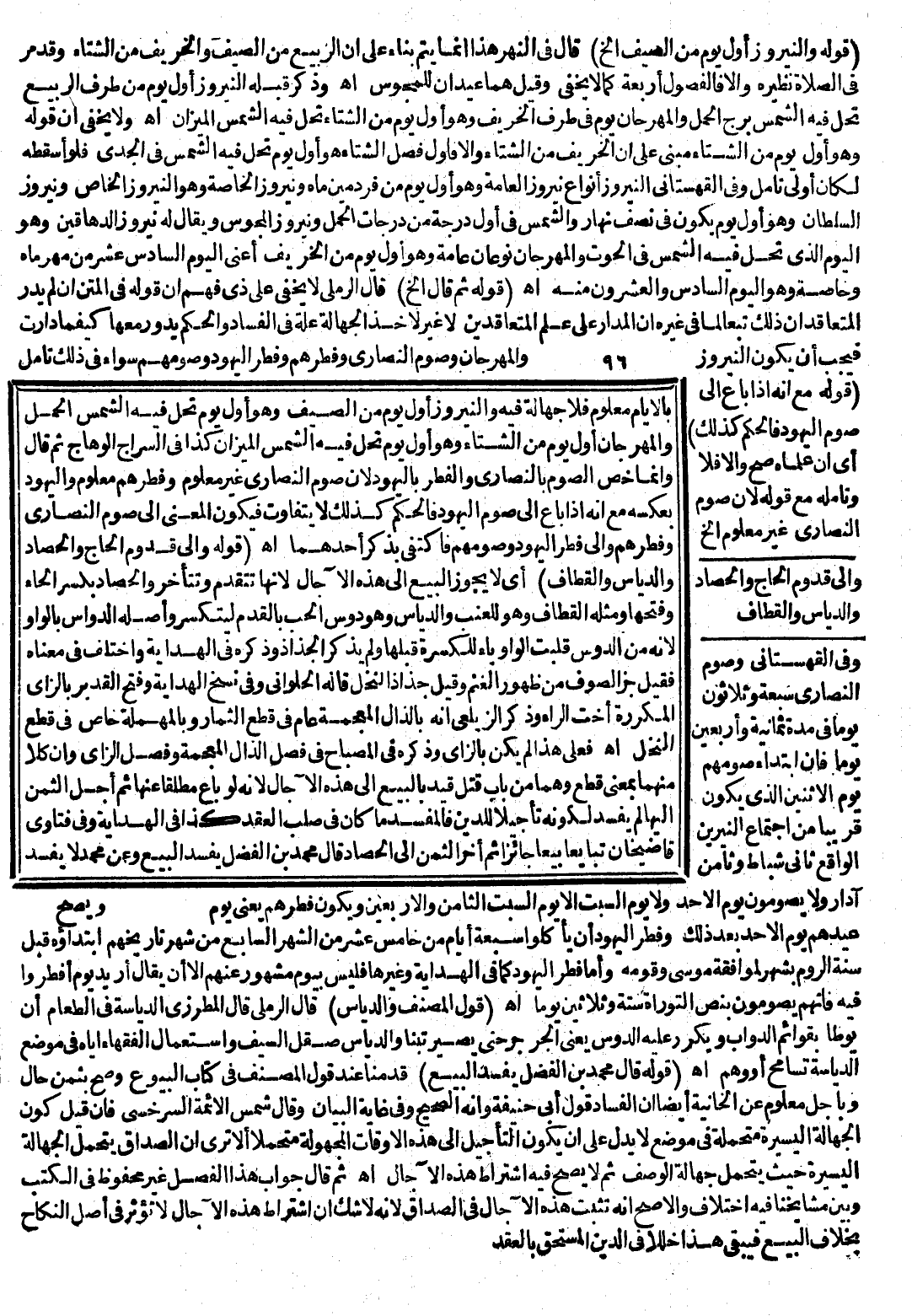 بِالْأَيَّامِ مَعْلُومٌ فَلَا جَهَالَةَ فِيهِ، وَالنَّيْرُوزُ أَوَّلُ يَوْمٍ مِنْ الصَّيْفِ، وَهُوَ أَوَّلُ يَوْمٍ تَحِلُّ فِيهِ الشَّمْسُ الْحَمَلَ، وَالْمِهْرَجَانُ أَوَّلُ يَوْمٍ مِنْ الشِّتَاءِ، وَهُوَ أَوَّلُ يَوْمٍ تَحِلُّ فِيهِ الشَّمْسُ الْمِيزَانَ كَذَا فِي السِّرَاجِ الْوَهَّاجِ ثُمَّ قَالَ وَإِنَّمَا خَصَّ الصَّوْمَ بِالنَّصَارَى، وَالْفِطْرَ بِالْيَهُودِ لِأَنَّ صَوْمَ النَّصَارَى غَيْرُ مَعْلُومٍ، وَفِطْرَهُمْ مَعْلُومٌ، وَالْيَهُودُ بِعَكْسِهِ مَعَ أَنَّهُ إذَا بَاعَ إلَى صَوْمِ الْيَهُودِ فَالْحُكْمُ كَذَلِكَ لَا يَتَفَاوَتُ فَيَكُونُ الْمَعْنَى إلَى صَوْمِ النَّصَارَى وَفِطْرِهِمْ، وَإِلَى فِطْرِ الْيَهُودِ، وَصَوْمِهِمْ فَاكْتَفَى بِذِكْرِ أَحَدِهِمَا. اهـ. .