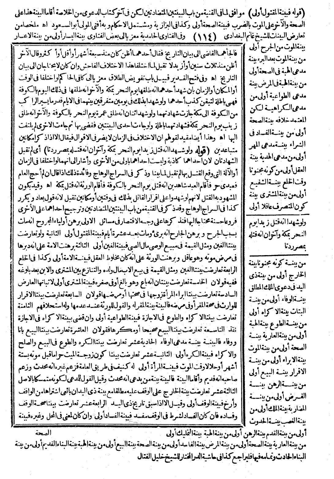 مِنْ تَعَارُضِ الْبَيِّنَاتِ لِلشَّيْخِ غَانِمٍ الْبَغْدَادِيِّ وَفِي الْفَتَاوَى الْحَامِدِيَّةِ مَعْزِيًّا إلَى بَعْضِ الْفَتَاوَى بَيِّنَةُ الْيَسَارِ أَوْلَى مِنْ بَيِّنَةِ الْإِعْسَارِ بَيِّنَةُ الْمَوْتِ مِنْ الْجُرْحِ أَوْلَى مِنْ بَيِّنَةِ الْمَوْتِ بَعْدَ الْبُرْءِ بَيِّنَةُ مُدَّعِي الْهِبَةِ فِي الصِّحَّةِ أَوْلَى مِنْ بَيِّنَةِ الْهِبَةِ فِي الْمَرَضِ بَيِّنَةُ مُدَّعِي الطَّوَاعِيَةِ أَوْلَى مِنْ مُدَّعِي الْكَرَاهِيَةِ لَكِنَّ الْمُعْتَمَدَ خِلَافُهُ بَيِّنَةُ الصِّحَّةِ أَوْلَى مِنْ بَيِّنَةِ الْفَسَادِ فِي الشِّرَاءِ بَيِّنَةُ مُدَّعِي الْمَهْرِ أَوْلَى مِنْ مُدَّعِي الْهَدِيَّةِ بَيِّنَةُ الْعَقْلِ أَوْلَى مِنْ كَوْنِهِ مَجْنُونًا وَقْتَ الْخُلْعِ بَيِّنَةُ الشَّفِيعِ أَوْلَى مِنْ بَيِّنَةِ الْمُشْتَرِي بَيِّنَةُ كَوْنِ الْمُتَصَرِّفِ عَاقِلًا أَوْلَى مِنْ بَيِّنَةِ كَوْنِهِ مَجْنُونًا بَيِّنَةُ الْخَارِجِ أَوْلَى مِنْ بَيِّنَةِ ذِي الْيَدِ فِي دَعْوَى الْمِلْكِ الْمُطْلَقِ بَيِّنَةُ الْوَفَاءِ أَوْلَى مِنْ بَيِّنَةِ الْبَتَاتِ بَيِّنَةُ الْإِكْرَاهِ أَوْلَى مِنْ بَيِّنَةِ الطَّوْعِ بَيِّنَةُ الْهِبَةِ أَوْلَى مِنْ بَيِّنَةِ الْعَارِيَّةِ بَيِّنَةُ الصِّحَّةِ أَوْلَى مِنْ بَيِّنَةِ الْمَوْتِ بَيِّنَةُ الْإِبْرَاءِ أَوْلَى مِنْ بَيِّنَةِ الْإِقْرَارِ بَيِّنَةُ الْبَيْعِ أَوْلَى مِنْ بَيِّنَةِ الرَّهْنِ بَيِّنَةُ الْقَرْضِ أَوْلَى مِنْ بَيِّنَةِ الْمُضَارَبَةِ بَيِّنَةُ الْمِلْكِ أَوْلَى مِنْ بَيِّنَةِ الْغَصْبِ بَيِّنَةُ الْحُدُوثِ أَوْلَى مِنْ بَيِّنَةِ الْقِدَمِ بَيِّنَةُ الرَّهْنِ أَوْلَى مِنْ بَيِّنَةِ الْهِبَةِ بَيِّنَةُ التَّمْلِيكِ أَوْلَى مِنْ بَيِّنَةِ الْعَارِيَّةِ بَيِّنَةُ الصِّحَّةِ أَوْلَى مِنْ بَيِّنَةِ الْمَرَضِ بَيِّنَةُ الْفَاسِدِ أَوْلَى مِنْ بَيِّنَةِ الصِّحَّةِ بَيِّنَةُ الْبَيْعِ أَوْلَى مِنْ بَيِّنَةِ الْهِبَةِ بَيِّنَةُ الْبِنَاءِ الْقَدِيمِ أَوْلَى مِنْ بَيِّنَةِ الْبِنَاءِ الْحَادِثِ وَتَمَامُهُ فَلْيُرَاجَعْ كَذَا فِي حَاشِيَةِ الدُّرِّ الْمُخْتَارِ لِلشَّيْخِ خَلِيلٍ الْفَتَّالِ.
