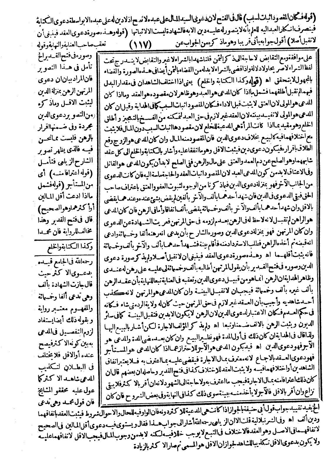 (قَوْلُهُ وَكَذَا الْكِتَابَةُ وَالْخُلْعُ) يَعْنِي إذَا اخْتَلَفَ الشَّاهِدَانِ فِي مِقْدَارِ الْبَدَلِ فِيهِمَا لَمْ تُقْبَلُ أَطْلَقَهُمَا فَشَمَلَ مَا إذَا كَانَ الْمُدَّعِي هُوَ الْعَبْدُ وَهُوَ ظَاهِرٌ لِأَنَّ مَقْصُودَهُ هُوَ الْعَقْدُ وَمَا إذَا كَانَ الْمُدَّعِي هُوَ الْمَوْلَى لِأَنَّ الْعِتْقَ لَا يَثْبُتُ قَبْلَ الْأَدَاءِ فَكَانَ الْمَقْصُودُ إثْبَاتَ السَّبَبِ كَمَا فِي الْهِدَايَةِ وَقِيلَ: إنْ كَانَ الْمُدَّعِي هُوَ الْمَوْلَى لَا تُفِيدُ بَيِّنَتُهُ لِأَنَّ الْعَقْدَ غَيْرُ لَازِمٍ فِي حَقِّ الْعَبْدِ لِتَمَكُّنِهِ مِنْ الْفَسْخِ بِالتَّعْجِيزِ وَأَطْلَقَ الْخُلْعَ وَهُوَ مُقَيَّدٌ بِمَا إذَا كَانَتْ الْمَرْأَةُ هِيَ الْمُدَّعِيَةُ لِلْخُلْعِ لِأَنَّ مَقْصُودَهَا إثْبَاتُ السَّبَبِ دُونَ الْمَالِ فَلَا يَثْبُتُ مَعَ اخْتِلَافِهِمَا فِيهِ كَالْبَيْعِ بِخِلَافِ دَعْوَى الدَّيْنِ فَإِنَّ الْمَقْصُودَ مِنْهُ الْمَالُ وَإِنْ كَانَ الْمُدَّعِي هُوَ الزَّوْجُ وَقَعَ الطَّلَاقُ بِإِقْرَارِهِ فَيَكُونُ دَعْوَى دَيْنٍ فَيَثْبُتُ الْأَقَلُّ وَهُوَ مَا اتَّفَقَا عَلَيْهِ وَأَشَارَ بِالْكِتَابَةِ وَالْخُلْعِ إلَى كُلِّ عَقْدٍ شَابَهَهُمَا وَهُوَ الصُّلْحُ عَنْ دَمِ الْعَمْدِ وَالْعِتْقُ عَلَى مَالٍ وَالرَّهْنُ فَفِي الصُّلْحِ لَا بُدَّ أَنْ يَكُونَ الْمُدَّعِي هُوَ الْقَاتِلُ وَفِي الْإِعْتَاقِ لَا بُدَّ مِنْ كَوْنِ الْمُدَّعِي الْعَبْدَ لِأَنَّ الْمَقْصُودَ إثْبَاتُ الْعَقْدِ وَالْحَاجَةُ مَاسَّةٌ إلَيْهِ فَإِنْ كَانَتْ الدَّعْوَى مِنْ الْجَانِبِ الْآخَرِ فَهُوَ بِمَنْزِلَةِ دَعْوَى الدَّيْنِ فِيمَا ذَكَرْنَا مِنْ الْوُجُوهِ لِثُبُوتِ الْعَفْوِ وَالْعِتْقِ بِاعْتِرَافِ صَاحِبِ الْحَقِّ فَبَقِيَ الدَّعْوَى فِي الدَّيْنِ.