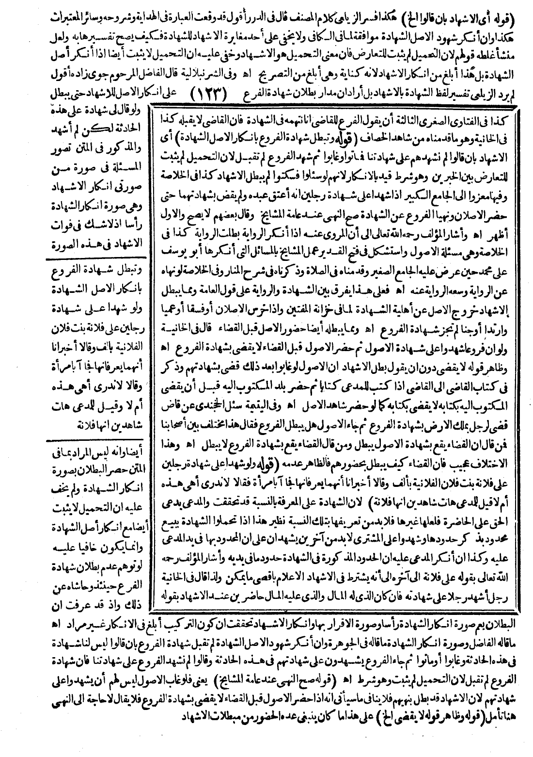 وَفِي الشُّرُنْبُلَالِيَّة قَالَ الْفَاضِلُ الْمَرْحُومُ جَوَى زَادَهْ: أَقُولُ: لَمْ يُرِدْ الزَّيْلَعِيُّ تَفْسِيرَ لَفْظِ الشَّهَادَةِ بِالْإِشْهَادِ بَلْ أَرَادَ أَنَّ مَدَارَ بُطْلَانِ شَهَادَةِ الْفَرْعِ عَلَى إنْكَارِ الْأَصْلِ لِلْإِشْهَادِ حَتَّى يَبْطُلُ وَلَوْ قَالَ: لِي شَهَادَةٌ عَلَى هَذِهِ الْحَادِثَةِ لَكِنْ لَمْ أَشْهَدْ وَالْمَذْكُورُ فِي الْمَتْنِ تَصَوُّرُ الْمَسْأَلَةِ فِي صُورَةٍ مِنْ صُورَتِي إنْكَارِ الْإِشْهَادِ وَهِيَ صُورَةُ إنْكَارِ الشَّهَادَةِ رَأْسًا إذْ لَا شَكَّ فِي فَوَاتِ الْإِشْهَادِ فِي هَذِهِ الصُّورَةِ أَيْضًا وَأَنَّهُ لَيْسَ الْمُرَادُ بِمَا فِي الْمَتْنِ حَصْرَ الْبُطْلَانِ بِصُورَةِ إنْكَارِ الشَّهَادَةِ وَلَمْ يَخَفْ عَلَيْهِ أَنَّ التَّحْمِيلَ لَا يَثْبُتُ أَيْضًا مَعَ إنْكَارِ أَصْلِ الشَّهَادَةِ وَإِنَّمَا يَكُونُ خَافِيًا عَلَيْهِ لَوْ تَوَهَّمَ عَدَمَ بُطْلَانِ شَهَادَةِ الْفَرْعِ حِينَئِذٍ وَحَاشَاهُ عَنْ ذَلِكَ وَإِذْ قَدْ عَرَفْت أَنَّ الْبُطْلَانَ يَعُمُّ صُورَةَ إنْكَارِ الشَّهَادَةِ رَأْسًا وَصُورَةَ الْإِقْرَارِ بِهَا وَإِنْكَارَ الْإِشْهَادِ تَحَقَّقْت أَنَّ كَوْنَ التَّرْكِيبِ أَبْلَغَ فِي الْإِنْكَارِ غَيْرُ مُرَادٍ اهـ.