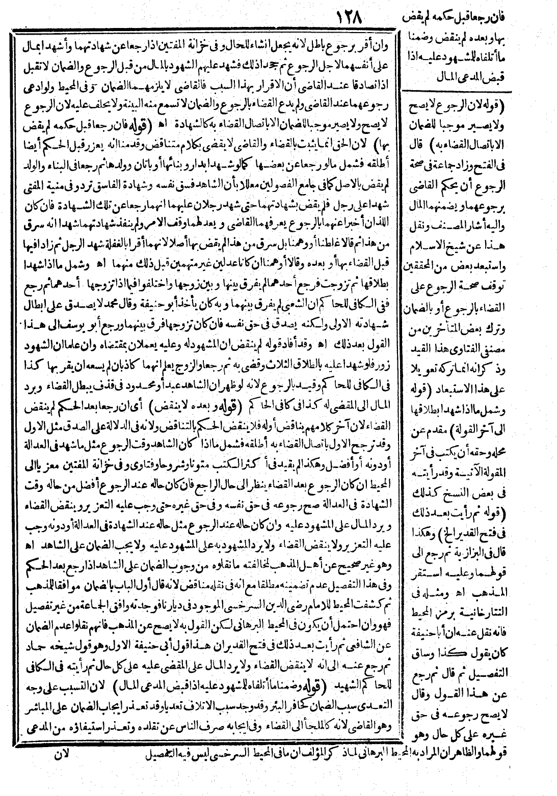 وَهُوَ غَيْرُ صَحِيحٍ عَنْ أَهْلِ الْمَذْهَبِ لِمُخَالَفَتِهِ مَا نَقَلُوهُ مِنْ وُجُوبِ الضَّمَانِ عَلَى الشَّاهِدِ إذَا رَجَعَ بَعْدَ الْحُكْمِ وَفِي هَذَا التَّفْصِيلِ عَدَمُ تَضْمِينِهِ مُطْلَقًا مَعَ أَنَّهُ فِي نَقْلِهِ مُنَاقِضٌ لِأَنَّهُ قَالَ أَوَّلَ الْبَابِ بِالضَّمَانِ مُوَافِقًا لِلْمَذْهَبِ ثُمَّ كَشَفْت الْمُحِيطَ لِلْإِمَامِ - رَضِيَ اللَّهُ عَنْهُ - الْمَوْجُودَ فِي دِيَارِنَا فَوَجَدْتُهُ وَافَقَ الْجَمَاعَةَ مِنْ غَيْرِ تَفْصِيلٍ فَهُوَ وَإِنْ احْتَمَلَ أَنْ يَكُونَ فِي الْمُحِيطِ الْبُرْهَانِيِّ لَكِنَّ الْقَوْلَ بِهِ لَا يَصِحُّ عَنْ الْمَذْهَبِ فَإِنَّهُمْ نَقَلُوا عَدَمَ الضَّمَانِ عَنْ الشَّافِعِيِّ ثُمَّ رَأَيْت بَعْدَ ذَلِكَ فِي فَتْحِ الْقَدِيرِ أَنَّ هَذَا قَوْلُ أَبِي حَنِيفَةَ الْأَوَّلُ وَهُوَ قَوْلُ شَيْخِهِ حَمَّادٍ ثُمَّ رَجَعَ عَنْهُ إلَى أَنَّهُ لَا يُنْقَضُ الْقَضَاءُ وَلَا يُرَدُّ الْمَالُ عَلَى الْمَقْضِيِّ عَلَيْهِ عَلَى كُلِّ حَالٍ ثُمَّ رَأَيْتُهُ فِي الْكَافِي لِلْحَاكِمِ الشَّهِيدِ.