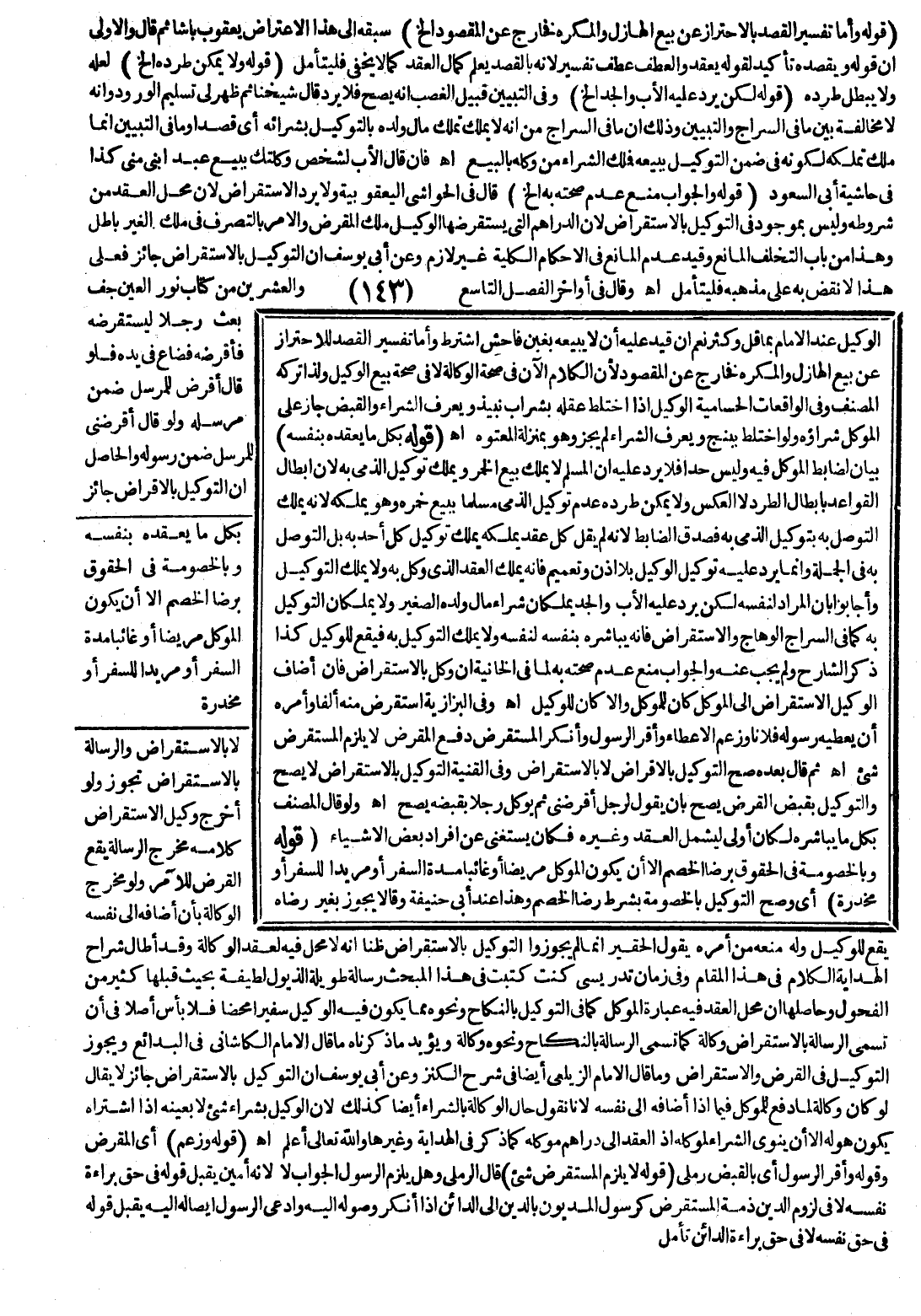 وَالْحَاصِلُ أَنَّ التَّوْكِيلَ بِالْإِقْرَاضِ جَائِزٌ لَا بِالِاسْتِقْرَاضِ وَالرِّسَالَةُ بِالِاسْتِقْرَاضِ تَجُوزُ وَلَوْ أَخْرَجَ وَكِيلُ الِاسْتِقْرَاضِ كَلَامَهُ مَخْرَجَ الرِّسَالَةِ يَقَعُ الْقَرْضُ لِلْآمِرِ وَلَوْ مَخْرَجَ الْوَكَالَةِ بِأَنْ أَضَافَهُ إلَى نَفْسِهِ يَقَعُ لِلْوَكِيلِ وَلَهُ مَنْعُهُ مِنْ أَمْرِهِ يَقُولُ الْحَقِيرُ إنَّمَا لَمْ يُجَوِّزُوا التَّوْكِيلَ بِالِاسْتِقْرَاضِ ظَنًّا أَنَّهُ لَا مَحِلَّ فِيهِ لِعَقْدِ الْوَكَالَةِ وَقَدْ أَطَالَ شُرَّاحُ الْهِدَايَةِ الْكَلَامَ فِي هَذَا الْمَقَامِ وَفِي زَمَانِ تَدْرِيسِي كُنْت كَتَبْت فِي هَذَا الْمَبْحَثِ رِسَالَةً طَوِيلَةَ الذُّيُولِ لَطِيفَةً بِحَيْثُ قَبِلَهَا كَثِيرٌ مِنْ الْفُحُولِ وَحَاصِلُهَا أَنَّ مَحِلَّ الْعَقْدِ فِيهِ عِبَارَةُ الْمُوَكِّلِ كَمَا فِي التَّوْكِيلِ بِالنِّكَاحِ وَنَحْوِهِ مِمَّا يَكُونُ فِيهِ الْوَكِيلُ سَفِيرًا مَحْضًا فَلَا بَأْسَ أَصْلًا فِي أَنْ تُسَمَّى الرِّسَالَةُ بِالِاسْتِقْرَاضِ وَكَالَةً كَمَا تُسَمَّى الرِّسَالَةُ بِالنِّكَاحِ وَنَحْوِهِ وَكَالَةً وَيُؤَيِّدُ مَا ذَكَرْنَاهُ مَا قَالَ الْإِمَامُ الْكَاشَانِيُّ فِي الْبَدَائِعِ: وَيَجُوزُ التَّوْكِيلُ فِي الْقَرْضِ وَالِاسْتِقْرَاضِ وَمَا قَالَ الْإِمَامُ الزَّيْلَعِيُّ أَيْضًا فِي شَرْحِ الْكَنْزِ وَعَنْ أَبِي يُوسُفَ أَنَّ التَّوْكِيلَ بِالِاسْتِقْرَاضِ جَائِزٌ لَا يُقَالُ لَوْ كَانَ وَكَالَةً لَمَا دُفِعَ لِلْمُوَكِّلِ فِيمَا إذَا أَضَافَهُ إلَى نَفْسِهِ لِأَنَّا نَقُولُ: حَالُ الْوَكَالَةِ بِالشِّرَاءِ أَيْضًا كَذَلِكَ لِأَنَّ الْوَكِيلَ بِشِرَاءِ شَيْءٍ لَا بِعَيْنِهِ إذَا اشْتَرَاهُ يَكُونُ هُوَ إلَّا أَنْ يَنْوِيَ الشِّرَاءَ لِمُوَكِّلِهِ إذْ الْعَقْدُ إلَى دَرَاهِمِ مُوَكِّلِهِ كَمَا ذَكَرَ فِي الْهِدَايَةِ وَغَيْرِهَا وَاَللَّهُ تَعَالَى أَعْلَمُ اهـ.