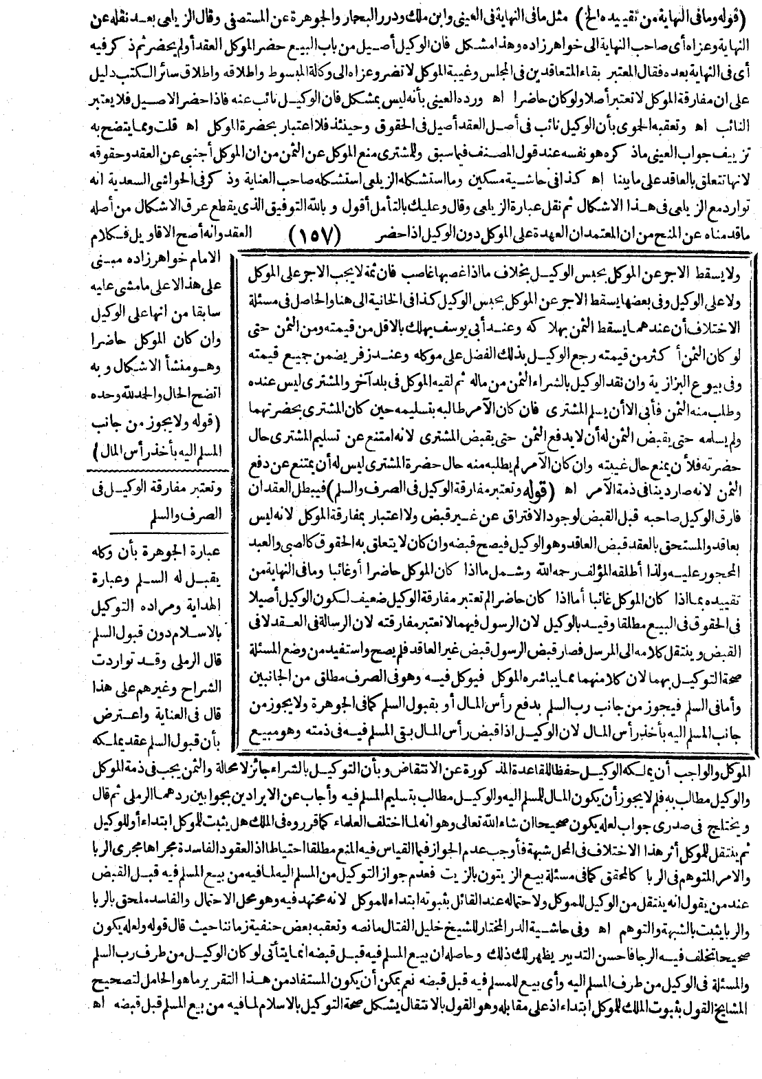 أَقُولُ: وَبِاَللَّهِ التَّوْفِيقُ: الَّذِي يَقْطَعُ عِرْقَ الْإِشْكَالِ مِنْ أَصْلِهِ مَا قَدَّمْنَاهُ عَنْ الْمِنَحِ مِنْ أَنَّ الْمُعْتَمَدَ أَنَّ الْعُهْدَةَ عَلَى الْمُوَكِّلِ دُونَ الْوَكِيلِ إذَا حَضَرَ الْعَقْدَ وَأَنَّهُ أَصَحُّ الْأَقَاوِيلِ فَكَلَامُ الْإِمَامِ خواهر زاده مَبْنِيٌّ عَلَى هَذَا لَا عَلَى مَا مَشَى عَلَيْهِ سَابِقًا مِنْ أَنَّهَا عَلَى الْوَكِيلِ وَإِنْ كَانَ الْمُوَكِّلُ حَاضِرًا وَهُوَ مَنْشَأُ الْإِشْكَالِ وَبِهِ اتَّضَحَ الْحَالُ وَالْحَمْدُ لِلَّهِ وَحْدَهُ. (قَوْلُهُ وَلَا يَجُوزُ مِنْ جَانِبِ الْمُسْلَمِ إلَيْهِ يَأْخُذُ رَأْسَ الْمَالِ) عِبَارَةُ الْجَوْهَرَةِ بِأَنْ وَكَّلَهُ يَقْبَلُ لَهُ السَّلَمَ وَعِبَارَةُ الْهِدَايَةِ وَمُرَادُهُ التَّوْكِيلُ بِالْإِسْلَامِ دُونَ قَبُولِ السَّلَمِ قَالَ الرَّمْلِيُّ: وَقَدْ تَوَارَدَتْ الشُّرَّاحُ وَغَيْرُهُمْ عَلَى هَذَا قَالَ فِي الْعِنَايَةِ: وَاعْتُرِضَ بِأَنَّ قَبُولَ السَّلَمِ عَقْدٌ يَمْلِكُهُ الْمُوَكِّلُ وَالْوَاجِبُ أَنْ يَمْلِكَهُ الْوَكِيلُ حِفْظًا لِلْقَاعِدَةِ الْمَذْكُورَةِ عَنْ الِانْتِقَاضِ وَبِأَنَّ التَّوْكِيلَ بِالشِّرَاءِ جَائِزٌ لَا مَحَالَةَ وَالثَّمَنُ يَجِبُ فِي ذِمَّةِ الْمُوَكِّلِ وَالْوَكِيلُ مُطَالَبٌ بِهِ فَلِمَ لَا يَجُوزُ أَنْ يَكُونَ الْمَالُ لِلْمُسْلَمِ إلَيْهِ وَالْوَكِيلُ مُطَالَبٌ بِتَسْلِيمِ الْمُسْلَمِ فِيهِ وَأَجَابَ عَنْ الْإِيرَادَيْنِ بِجَوَابَيْنِ رَدَّهُمَا الرَّمْلِيُّ ثُمَّ قَالَ: وَيَخْتَلِجُ فِي صَدْرِي جَوَابٌ لَعَلَّهُ يَكُونُ صَحِيحًا إنْ شَاءَ اللَّهُ تَعَالَى وَهُوَ أَنَّهُ اخْتَلَفَ الْعُلَمَاءُ كَمَا قَرَّرَهُ فِي الْمِلْكِ هَلْ يَثْبُتُ لِلْمُوَكِّلِ ابْتِدَاءً أَوْ لِلْوَكِيلِ ثُمَّ يَنْتَقِلُ لِلْمُوَكِّلِ أَثَّرَ هَذَا الِاخْتِلَافُ فِي الْمَحَلِّ شُبْهَةً فَأَوْجَبَ عَدَمَ الْجَوَازِ فِيمَا الْقِيَاسُ فِيهِ الْمَنْعُ مُطْلَقًا احْتِيَاطًا إذْ الْعُقُودُ الْفَاسِدَةُ مَجْرَاهَا مَجْرَى الرِّبَا وَالْأَمْرُ الْمُتَوَهَّمُ كَالْمُحَقَّقِ كَمَا فِي مَسْأَلَةِ بَيْعِ الزَّيْتُونِ بِالزَّيْتِ فَعَدَمُ جَوَازِ التَّوْكِيلِ مِنْ الْمُسْلَمِ إلَيْهِ لِمَا فِيهِ مِنْ بَيْعِ الْمُسْلَمِ فِيهِ قَبْلَ الْقَبْضِ عِنْدَ مَنْ يَقُولُ: إنَّهُ يَنْتَقِلُ مِنْ الْوَكِيلِ لِلْمُوَكِّلِ وَلِاحْتِمَالِهِ عِنْدَ الْقَائِلِ بِثُبُوتِهِ ابْتِدَاءً لِلْمُوَكِّلِ لِأَنَّهُ مُجْتَهَدٌ فِيهِ وَهُوَ مَحَلُّ الِاحْتِمَالِ وَالْفَاسِدُ مُلْحَقٌ بِالرِّبَا وَالرِّبَا يَثْبُتُ بِالشُّبْهَةِ وَالتَّوَهُّمِ اهـ.