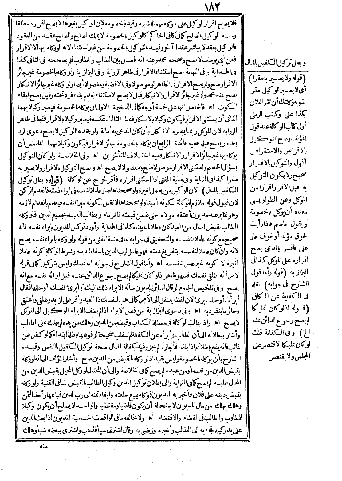 (قَوْلُهُ وَبَطَلَ تَوْكِيلُ الْكَفِيلِ بِالْمَالِ) لِأَنَّ الْوَكِيلَ مَنْ يَعْمَلُ لِغَيْرِهِ وَلَوْ صَحَّحْنَاهَا صَارَ عَامِلًا لِنَفْسِهِ فِي إبْرَاءِ ذِمَّتِهِ فَانْعَدَمَ الرُّكْنُ لِأَنَّ قَبُولَ قَوْلِهِ مُلَازِمٌ لِلْوَكَالَةِ لِكَوْنِهِ أَمِينًا وَلَوْ صَحَّحْنَاهَا لَا تُقْبَلُ لِكَوْنِهِ مُبَرِّئًا نَفْسَهُ فَيُعْدَمُ بِانْعِدَامِ لَازِمِهِ وَهُوَ نَظِيرُ عَبْدٍ مَدْيُونٍ أَعْتَقَهُ مَوْلَاهُ حَتَّى ضَمِنَ قِيمَتَهُ لِلْغُرَمَاءِ وَيُطَالِبُ الْعَبْدَ بِجَمِيعِ الدَّيْنِ فَلَوْ وَكَّلَهُ الطَّالِبُ بِقَبْضِ الْمَالِ مِنْ الْعَبْدِ كَانَ بَاطِلًا لِمَا بَيَّنَّاهُ كَذَا فِي الْهِدَايَةِ وَأُورِدَ تَوْكِيلُ الْمَدْيُونِ بِإِبْرَاءِ نَفْسِهِ فَإِنَّهُ صَحِيحٌ مَعَ كَوْنِهِ عَامِلًا لِنَفْسِهِ وَالتَّحْقِيقُ فِي جَوَابِهِ مَا فِي مُنْيَةِ الْمُفْتِي مِنْ قَوْلِهِ وَلَوْ وَكَّلَهُ بِإِبْرَاءِ نَفْسِهِ يَصِحُّ لِأَنَّهُ وَإِنْ كَانَ عَامِلًا لِنَفْسِهِ بِتَفْرِيغِ ذِمَّتِهِ فَهُوَ عَامِلٌ لِرَبِّ الدَّيْنِ بِإِسْقَاطِ دَيْنِهِ وَشَرْطُ الْوَكَالَةِ كَوْنُهُ عَامِلًا لِغَيْرِهِ لَا كَوْنُهُ غَيْرَ عَامِلٍ لِنَفْسِهِ اهـ.