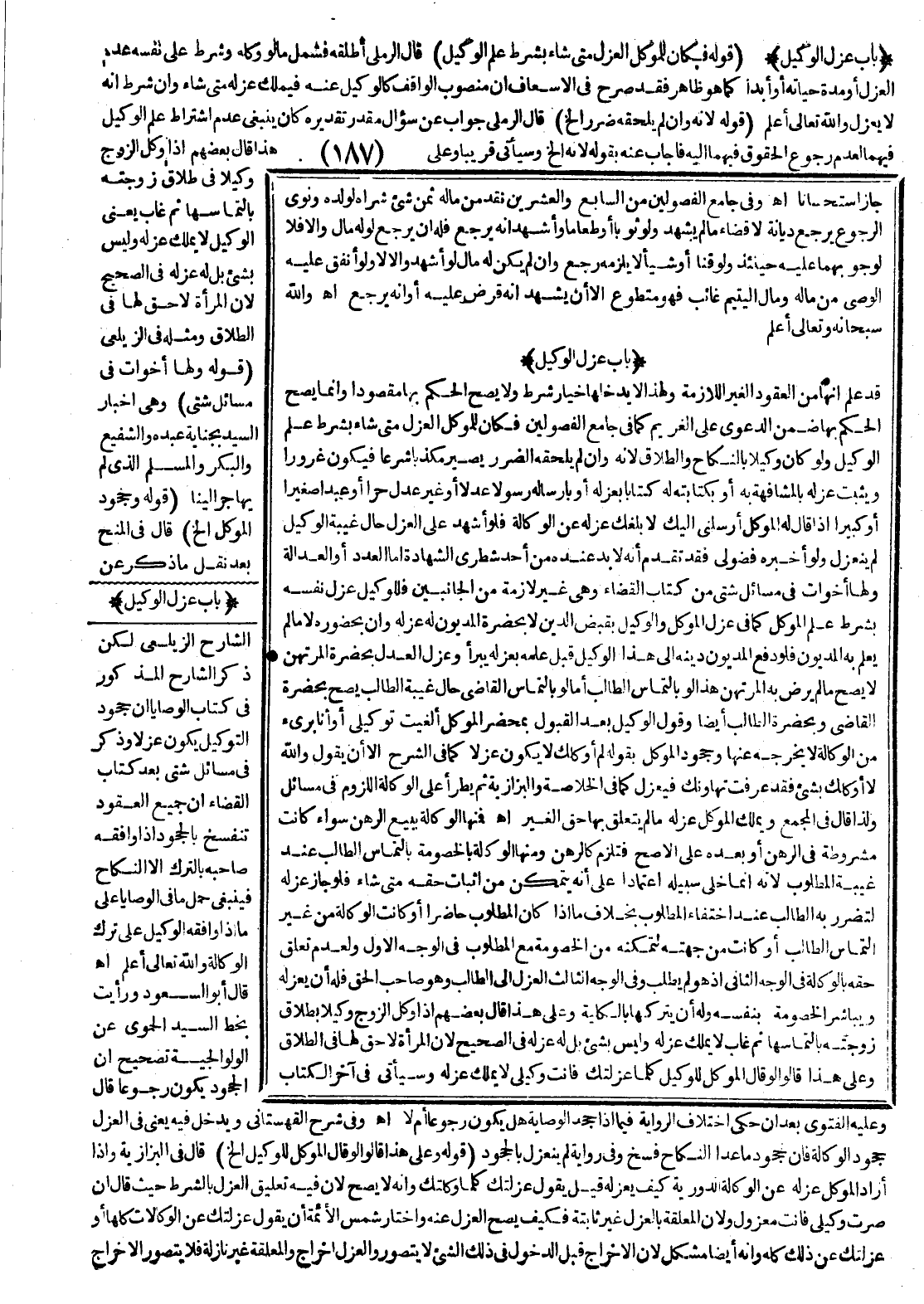 ـــــــــــــــــــــــــــــQ (بَابُ عَزْلِ الْوَكِيلِ) (قَوْلُهُ فَكَانَ لِلْمُوَكِّلِ الْعَزْلُ مَتَى شَاءَ بِشَرْطِ عِلْمِ الْوَكِيلِ) قَالَ الرَّمْلِيُّ: أَطْلَقَهُ فَشَمَلَ مَا لَوْ وَكَّلَهُ وَشَرَطَ عَلَى نَفْسِهِ عَدَمَ الْعَزْلِ أَوْ مُدَّةَ حَيَاتِهِ أَوْ أَبَدًا كَمَا هُوَ ظَاهِرٌ فَقَدْ صَرَّحَ فِي الْإِسْعَافِ أَنَّ مَنْصُوبَ الْوَاقِفِ كَالْوَكِيلِ عَنْهُ فَيَمْلِكُ عَزْلَهُ مَتَى شَاءَ وَإِنْ شَرَطَ أَنَّهُ لَا يُعْزَلُ وَاَللَّهُ تَعَالَى أَعْلَمُ (قَوْلُهُ لِأَنَّهُ وَإِنْ لَمْ يَلْحَقْهُ ضَرَرٌ إلَخْ) قَالَ الرَّمْلِيُّ: جَوَابٌ عَنْ سُؤَالٍ مُقَدَّرٍ تَقْدِيرُهُ كَانَ يَنْبَغِي عَدَمُ اشْتِرَاطِ عِلْمِ الْوَكِيلِ فِيهِمَا لِعَدَمِ رُجُوعِ الْحُقُوقِ فِيهِمَا إلَيْهِ فَأَجَابَ عَنْهُ بِقَوْلِهِ لِأَنَّهُ إلَخْ وَسَيَأْتِي قَرِيبًا وَعَلَى هَذَا قَالَ بَعْضُهُمْ: إذَا وَكَّلَ الزَّوْجُ وَكِيلًا فِي طَلَاقِ زَوْجَتِهِ بِالْتِمَاسِهِمَا ثُمَّ غَابَ يَعْنِي الْوَكِيلُ لَا يَمْلِكُ عَزْلَهُ وَلَيْسَ بِشَيْءٍ بَلْ لَهُ عَزْلُهُ فِي الصَّحِيحِ لِأَنَّ الْمَرْأَةَ لَا حَقَّ لَهَا فِي الطَّلَاقِ وَمِثْلُهُ فِي الزَّيْلَعِيِّ (قَوْلُهُ وَلَهَا أَخَوَاتٌ فِي مَسَائِلَ شَتَّى) وَهِيَ إخْبَارُ السَّيِّدِ بِجِنَايَةِ عَبْدِهِ وَالشَّفِيعِ وَالْبِكْرِ وَالْمُسْلِمِ الَّذِي لَمْ يُهَاجِرْ إلَيْنَا (قَوْلُهُ وَجُحُودُ الْمُوَكِّلِ إلَخْ) قَالَ فِي الْمِنَحِ بَعْدَ نَقْلِ مَا ذُكِرَ عَنْ الشَّارِحِ الزَّيْلَعِيِّ لَكِنْ ذَكَرَ الشَّارِحُ الْمَذْكُورَ فِي كِتَابِ الْوَصَايَا أَنَّ جُحُودَ التَّوْكِيلِ يَكُونُ عَزْلًا وَذَكَرَ فِي مَسَائِلَ شَتَّى بَعْدَ كِتَابِ الْقَضَاءِ أَنَّ جَمِيعَ الْعُقُودِ تَنْفَسِخُ بِالْجُحُودِ إذَا وَافَقَهُ صَاحِبُهُ بِالتَّرْكِ إلَّا النِّكَاحَ فَيَنْبَغِي حَمْلُ مَا فِي الْوَصَايَا عَلَى مَا إذَا وَافَقَهُ الْوَكِيلُ عَلَى تَرْكِ الْوَكَالَةِ وَاَللَّهُ تَعَالَى أَعْلَمُ اهـ.
