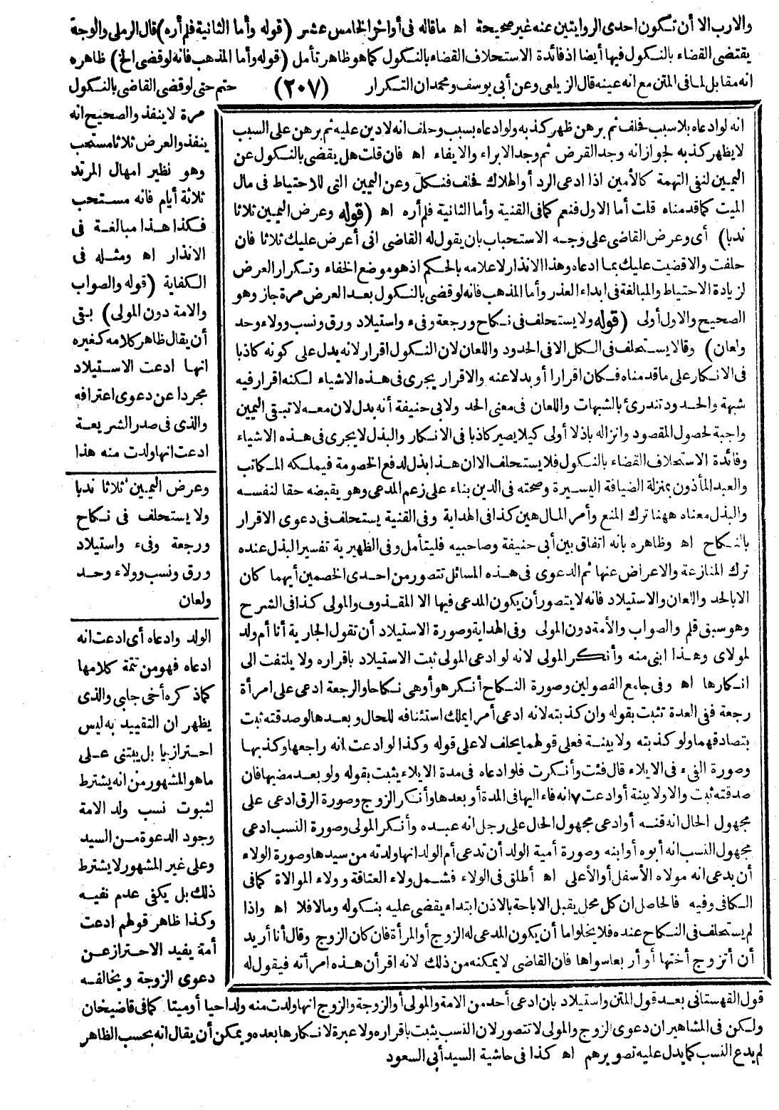 (قَوْلُهُ: وَلَا يُسْتَحْلَفُ فِي نِكَاحٍ وَرَجْعَةٍ وَفَيْءٍ وَاسْتِيلَادٍ وَرِقٍّ وَنَسَبٍ وَوَلَاءٍ وَحَدٍّ وَلِعَانٍ) وَقَالَا يُسْتَحْلَفُ فِي الْكُلِّ إلَّا فِي الْحُدُودِ وَاللِّعَانِ؛ لِأَنَّ النُّكُولَ إقْرَارٌ؛ لِأَنَّهُ يَدُلُّ عَلَى كَوْنِهِ كَاذِبًا فِي الْإِنْكَارِ عَلَى مَا قَدَّمْنَاهُ فَكَانَ إقْرَارًا أَوْ بَدَلًا عَنْهُ وَالْإِقْرَارُ يَجْرِي فِي هَذِهِ الْأَشْيَاءِ لَكِنَّهُ إقْرَارٌ فِيهِ شُبْهَةٌ وَالْحُدُودُ تَنْدَرِئُ بِالشُّبُهَاتِ، وَاللِّعَانُ فِي مَعْنَى الْحَدِّ وَلِأَبِي حَنِيفَةَ أَنَّهُ بَدَلٌ؛ لِأَنَّ مَعَهُ لَا تَبْقَى الْيَمِينُ وَاجِبَةً لِحُصُولِ الْمَقْصُودِ، وَإِنْزَالُهُ بَاذِلًا أَوْلَى كَيْ لَا يَصِيرَ كَاذِبًا فِي الْإِنْكَارِ وَالْبَذْلُ لَا يَجْرِي فِي هَذِهِ الْأَشْيَاءِ، وَفَائِدَةُ الِاسْتِحْلَافِ الْقَضَاءُ بِالنُّكُولِ فَلَا يُسْتَحْلَفُ إلَّا أَنَّ هَذَا بَذْلٌ لِدَفْعِ الْخُصُومَةِ فَيَمْلِكُهُ الْمُكَاتَبُ، وَالْعَبْدُ الْمَأْذُونُ بِمَنْزِلَةِ الضِّيَافَةِ الْيَسِيرَةِ وَصِحَّتُهُ فِي الدَّيْنِ بِنَاءً عَلَى زَعْمِ الْمُدَّعِي، وَهُوَ يَقْبِضُهُ حَقًّا لِنَفْسِهِ وَالْبَذْلُ مَعْنَاهُ هَا هُنَا تَرْكُ الْمَنْعِ، وَأَمْرُ الْمَالِ هَيِّنٌ كَذَا فِي الْهِدَايَةِ، وَفِي الْقُنْيَةِ يُسْتَحْلَفُ فِي دَعْوَى الْإِقْرَارِ بِالنِّكَاحِ. اهـ.