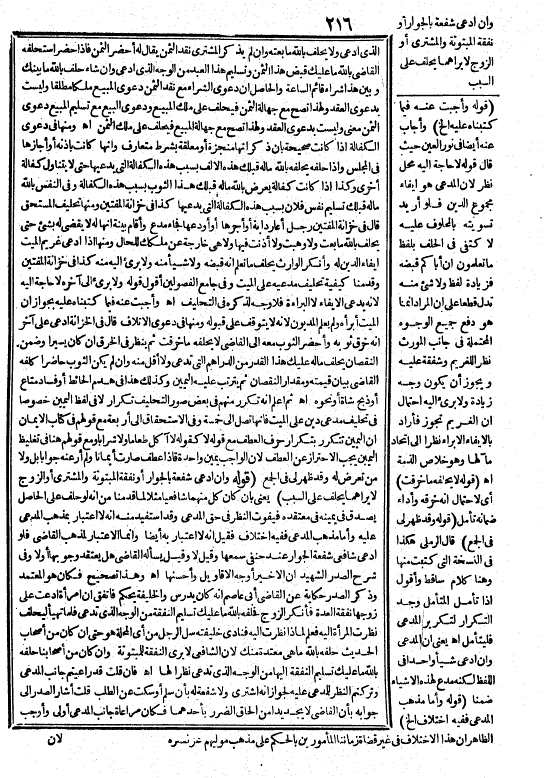 (قَوْلُهُ: وَإِنْ ادَّعَى شُفْعَةً بِالْجِوَارِ أَوْ نَفَقَةَ الْمَبْتُوتَةِ وَالْمُشْتَرِي أَوْ الزَّوْجُ لَا يَرَاهُمَا يَحْلِفُ عَلَى السَّبَبِ) يَعْنِي بِأَنْ كَانَ كُلٌّ مِنْهُمَا شَافِعِيًّا مَثَلًا لِمَا قَدَّمْنَا مِنْ أَنَّهُ لَوْ حَلَفَ عَلَى الْحَاصِلِ يُصَدَّقُ فِي يَمِينِهِ فِي مُعْتَقَدِهِ فَيَفُوتُ النَّظَرُ فِي حَقِّ الْمُدَّعِي، وَقَدْ اُسْتُفِيدَ مِنْهُ أَنَّهُ لَا اعْتِبَارَ بِمَذْهَبِ الْمُدَّعَى عَلَيْهِ، وَأَمَّا مَذْهَبُ الْمُدَّعِي فَفِيهِ اخْتِلَافٌ فَقِيلَ إنَّهُ لَا اعْتِبَارَ بِهِ أَيْضًا، وَإِنَّمَا الِاعْتِبَارُ لِمَذْهَبِ الْقَاضِي فَلَوْ ادَّعَى شَافِعِيٌّ شُفْعَةَ الْجِوَارِ عِنْدَ حَنَفِيٍّ سَمِعَهَا، وَقِيلَ لَا، وَقِيلَ يَسْأَلُهُ الْقَاضِي هَلْ يَعْتَقِدُ وُجُوبَهَا أَوْ لَا، وَفِي شَرْحِ الصَّدْرِ الشَّهِيدِ أَنَّ الْأَخِيرَ أَوْجَهُ الْأَقَاوِيلِ، وَأَحْسَنُهَا. اهـ.