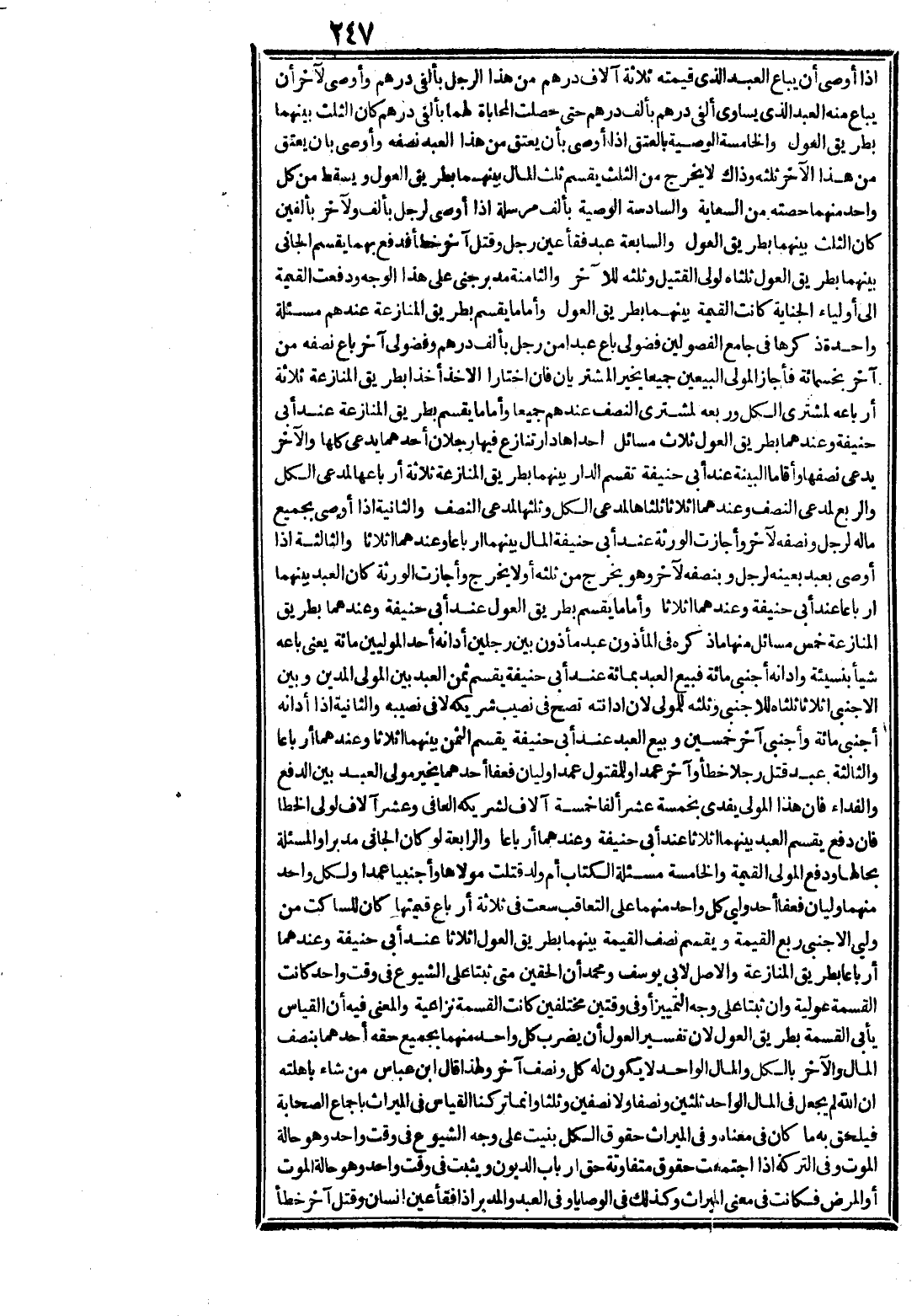 إذَا أَوْصَى أَنْ يُبَاعَ الْعَبْدُ الَّذِي قِيمَتُهُ ثَلَاثَةُ آلَافِ دِرْهَمٍ مِنْ هَذَا الرَّجُلِ بِأَلْفَيْ دِرْهَمٍ وَأَوْصَى لِآخَرَ أَنْ يُبَاعَ مِنْهُ الْعَبْدُ الَّذِي يُسَاوِي أَلْفَيْ دِرْهَمٍ بِأَلْفِ دِرْهَمٍ حَتَّى حَصَلَتْ الْمُحَابَاةُ لَهُمَا بِأَلْفَيْ دِرْهَمٍ كَانَ الثُّلُثُ بَيْنَهُمَا بِطَرِيقِ الْعَوْلِ وَالْخَامِسَةُ الْوَصِيَّةُ بِالْعِتْقِ إذَا أَوْصَى بِأَنْ يُعْتَقَ مِنْ هَذَا الْعَبْدِ نِصْفُهُ وَأَوْصَى بِأَنْ يُعْتَقَ مِنْ هَذَا الْآخَرِ ثُلُثُهُ وَذَاكَ لَا يَخْرُجُ مِنْ الثُّلُثِ يُقْسَمُ ثُلُثُ الْمَالِ بَيْنَهُمَا بِطَرِيقِ الْعَوْلِ وَيَسْقُطُ مِنْ كُلِّ وَاحِدٍ مِنْهُمَا حِصَّتُهُ مِنْ السِّعَايَةِ وَالسَّادِسَةُ الْوَصِيَّةُ بِأَلْفٍ مُرْسَلَةٍ إذَا أَوْصَى لِرَجُلٍ بِأَلْفٍ وَلِآخَرَ بِأَلْفَيْنِ كَانَ الثُّلُثُ بَيْنَهُمَا بِطَرِيقِ الْعَوْلِ وَالسَّابِعَةُ عَبْدٌ فَقَأَ عَيْنَ رَجُلٍ وَقَتَلَ آخَرَ خَطَأً فَدُفِعَ بِهِمَا يُقْسَمُ الْجَانِي بَيْنَهُمَا بِطَرِيقِ الْعَوْلِ ثُلُثَاهُ لِوَلِيِّ الْقَتِيلِ وَثُلُثُهُ لِلْآخَرِ وَالثَّامِنَةُ مُدَبَّرٌ جَنَى عَلَى هَذَا الْوَجْهِ وَدُفِعَتْ الْقِيمَةُ إلَى أَوْلِيَاءِ الْجِنَايَةِ كَانَتْ الْقِيمَةُ بَيْنَهُمَا بِطَرِيقِ الْعَوْلِ وَأَمَّا مَا يُقْسَمُ بِطَرِيقِ الْمُنَازَعَةِ عِنْدَهُمْ مَسْأَلَةٌ وَاحِدَةٌ ذَكَرَهَا فِي جَامِعِ الْفُصُولَيْنِ فُضُولِيٌّ بَاعَ عَبْدًا مِنْ رَجُلٍ بِأَلْفِ دِرْهَمٍ وَفُضُولِيٌّ آخَرُ بَاعَ نِصْفَهُ مِنْ آخَرَ بِخَمْسِمِائَةٍ فَأَجَازَ الْمَوْلَى الْبَيْعَيْنِ جَمِيعًا يُخَيَّرُ الْمُشْتَرِيَانِ فَإِنْ اخْتَارَ الْأَخْذَ أَخَذَا بِطَرِيقِ الْمُنَازَعَةِ ثَلَاثَةَ أَرْبَاعِهِ لِمُشْتَرِي الْكُلِّ وَرُبْعَهُ لِمُشْتَرِي النِّصْفِ عِنْدَهُمْ جَمِيعًا وَأَمَّا مَا يُقْسَمُ بِطَرِيقِ الْمُنَازَعَةِ عِنْدَ أَبِي حَنِيفَةَ وَعِنْدَهُمَا بِطَرِيقِ الْعَوْلِ ثَلَاثُ مَسَائِلَ إحْدَاهَا دَارٌ تَنَازَعَ فِيهَا رَجُلَانِ أَحَدُهُمَا يَدَّعِي كُلَّهَا وَالْآخَرُ يَدَّعِي نِصْفَهَا وَأَقَامَا الْبَيِّنَةَ عِنْدَ أَبِي حَنِيفَةَ تُقْسَمُ الدَّارُ بَيْنَهُمَا بِطَرِيقِ الْمُنَازَعَةِ ثَلَاثَةُ أَرْبَاعِهَا لِمُدَّعِي الْكُلَّ وَالرُّبْعُ لِمُدَّعِي النِّصْفَ وَعِنْدَهُمَا أَثْلَاثًا ثُلُثَاهَا لِمُدَّعِي الْكُلَّ وَثُلُثُهَا لِمُدَّعِي النِّصْفَ وَالثَّانِيَةُ إذَا أَوْصَى بِجَمِيعِ مَالِهِ لِرَجُلٍ وَنِصْفِهِ لِآخَرَ وَأَجَازَتْ الْوَرَثَةُ عِنْدَ أَبِي حَنِيفَةَ الْمَالَ بَيْنَهُمَا أَرْبَاعًا وَعِنْدَهُمَا أَثْلَاثًا وَالثَّالِثَةُ إذَا أَوْصَى بِعَبْدٍ بِعَيْنِهِ لِرَجُلٍ وَبِنِصْفِهِ لِآخَرَ وَهُوَ يَخْرُجُ مِنْ ثُلُثِهِ أَوْ لَا يَخْرُجُ وَأَجَازَتْ الْوَرَثَةُ كَانَ الْعَبْدُ بَيْنَهُمَا أَرْبَاعًا عِنْدَ أَبِي حَنِيفَةَ وَعِنْدَهُمَا أَثْلَاثًا وَأَمَّا مَا يُقْسَمُ بِطَرِيقِ الْعَوْلِ عِنْدَ أَبِي حَنِيفَةَ وَعِنْدَهُمَا بِطَرِيقِ الْمُنَازَعَةِ خَمْسُ مَسَائِلَ مِنْهَا مَا ذَكَرَهُ فِي الْمَأْذُونِ عَبْدٌ مَأْذُونٌ بَيْنَ رَجُلَيْنِ أَدَانَهُ أَحَدُ الْمَوْلَيَيْنِ مِائَةً يَعْنِي بَاعَهُ شَيْئًا بِنَسِيئَةٍ وَأَدَانَهُ أَجْنَبِيٌّ مِائَةً فَبِيعَ الْعَبْدُ بِمِائَةٍ عِنْدَ أَبِي حَنِيفَةَ يُقْسَمُ ثَمَنُ الْعَبْدِ بَيْنَ الْمَوْلَى الْمَدِينِ وَبَيْنَ الْأَجْنَبِيِّ أَثْلَاثًا ثُلُثَاهُ لِلْأَجْنَبِيِّ وَثُلُثُهُ لِلْمَوْلَى لِأَنَّ إدَانَتَهُ تَصِحُّ فِي نَصِيبِ شَرِيكِهِ لَا فِي نَصِيبِهِ وَالثَّانِيَةُ إذَا أَدَانَهُ أَجْنَبِيٌّ مِائَةً وَأَجْنَبِيٌّ آخَرُ خَمْسِينَ وَبِيعَ الْعَبْدُ عِنْدَ أَبِي