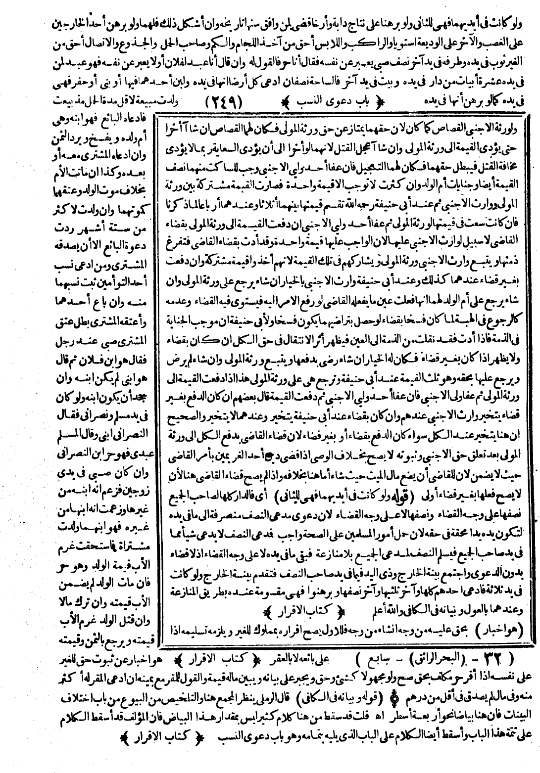 قُلْت قَدْ سَقَطَ مِنْ هُنَا كَلَامٌ كَثِيرٌ لَيْسَ بِمِقْدَارِ هَذَا الْبَيَاضِ فَإِنَّ الْمُؤَلِّفَ قَدْ أَسْقُط الْكَلَامَ عَلَى تَتِمَّةِ هَذَا الْبَابِ وَأَسْقَطَ أَيْضًا الْكَلَامَ عَلَى الْبَابِ الَّذِي يَلِيه بِتَمَامِهِ وَهُوَ بَابُ دَعْوَى النَّسَبِ (كِتَاب الْإِقْرَار) هُوَ إخْبَار عَنْ ثُبُوت حَقّ لِلْغَيْرِ عَلَى نَفْسه إذَا أَقَرَّ حُرّ مُكَلَّف بِحَقِّ صَحَّ وَلَوْ مَجْهُولًا كَشَيْءِ وَحَقّ وَيُجْبَر عَلَى بَيَانه وَيُبَيِّن مَاله قِيمَة وَالْقَوْل لِلْمُقِرِّ مَعَ يَمِينه إنْ ادَّعَى الْمُقِرّ لَهُ أَكْثَر مِنْهُ وَفِي مَال لَمْ يُصَدِّق فِي أَقُلْ مِنْ دِرْهَم (كِتَاب الْإِقْرَار)