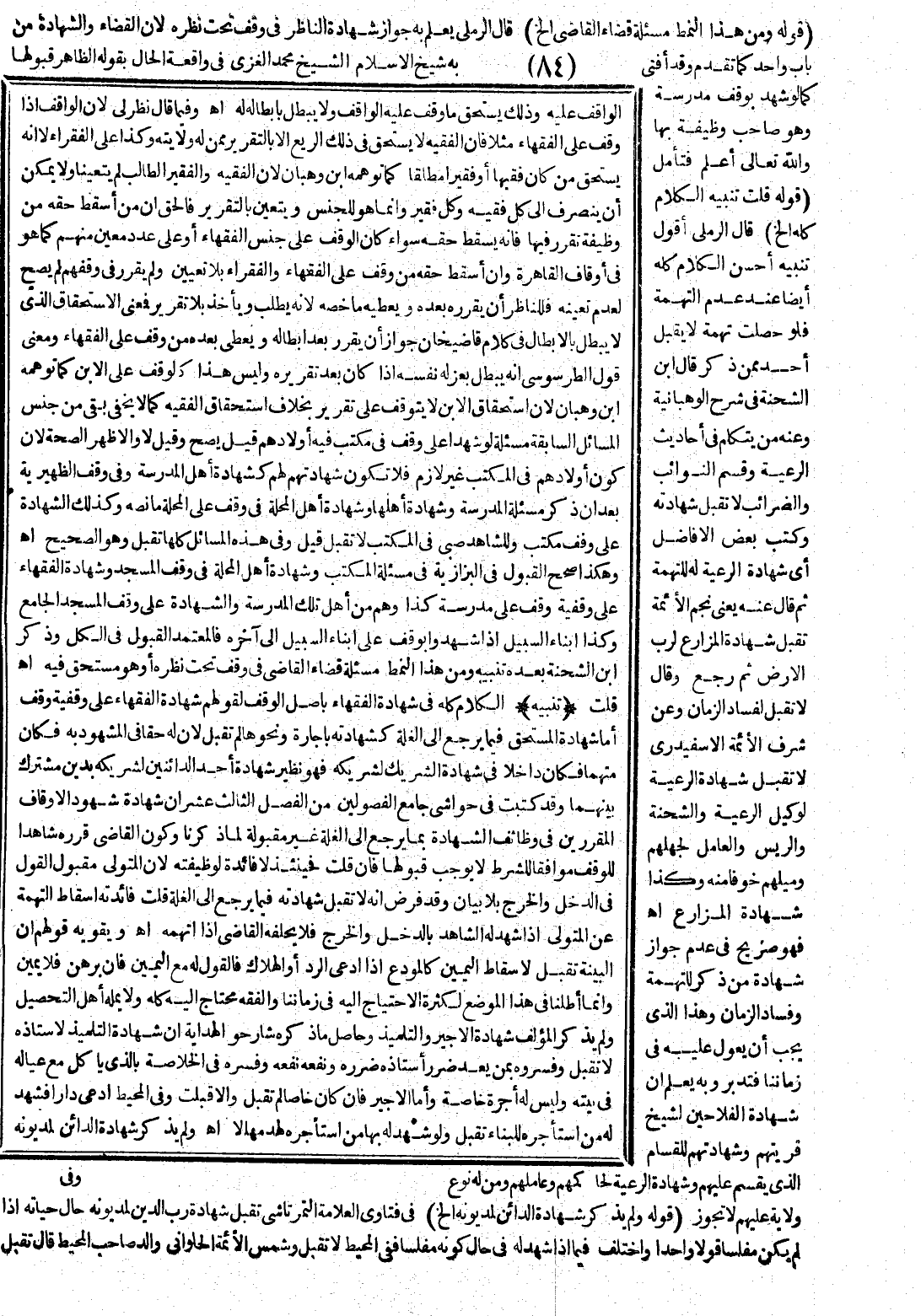قُلْتُ (تَنْبِيهٌ) الْكَلَامُ كُلُّهُ فِي شَهَادَةِ الْفُقَهَاءِ بِأَصْلِ الْوَقْفِ لِقَوْلِهِمْ شَهَادَةُ الْفُقَهَاءِ عَلَى وَقْفِيَّةٍ وَقْفٍ أَمَّا شَهَادَةُ الْمُسْتَحِقِّ فِيمَا يَرْجِعُ إلَى الْغَلَّةِ كَشَهَادَتِهِ بِإِجَارَةٍ وَنَحْوِهَا لَمْ تُقْبَلْ؛ لِأَنَّ لَهُ حَقًّا فِي الْمَشْهُودِ بِهِ فَكَانَ مُتَّهَمًا فَكَانَ دَاخِلًا فِي شَهَادَةِ الشَّرِيكِ لِشَرِيكِهِ فَهُوَ نَظِيرُ شَهَادَةِ أَحَدِ الدَّائِنَيْنِ لِشَرِيكِهِ بِدَيْنٍ مُشْتَرَكٍ بَيْنَهُمَا وَقَدْ كَتَبْت فِي حَوَاشِي جَامِعِ الْفُصُولَيْنِ مِنْ الْفَصْلِ الثَّالِثَ عَشَرَ أَنَّ شَهَادَةَ شُهُودِ الْأَوْقَافِ الْمُقَرَّرِينَ فِي وَظَائِفِ الشَّهَادَةِ بِمَا يَرْجِعُ إلَى الْغَلَّةِ غَيْرُ مَقْبُولَةٍ لِمَا ذَكَرْنَا وَكَوْنُ الْقَاضِي قَرَّرَهُ شَاهِدًا لِلْوَقْفِ مُوَافِقًا لِلشَّرْطِ لَا يُوجِبُ قَبُولَهَا فَإِنْ قُلْت فَحِينَئِذٍ لَا فَائِدَةَ لِوَظِيفَتِهِ؛ لِأَنَّ الْمُتَوَلِّيَ مَقْبُولُ الْقَوْلِ فِي الدَّخْلِ وَالْخَرْجِ بِلَا بَيَانٍ وَقَدْ فَرَضَ أَنَّهُ لَا تُقْبَلُ شَهَادَتُهُ فِيمَا يَرْجِعُ إلَى الْغَلَّةِ قُلْت فَائِدَتُهُ إسْقَاطُ التُّهْمَةِ عَنْ الْمُتَوَلِّي إذَا شَهِدَ لَهُ الشَّاهِدُ بِالدَّخْلِ وَالْخَرْجِ فَلَا يُحَلِّفُهُ الْقَاضِي إذَا اتَّهَمَهُ. اهـ.