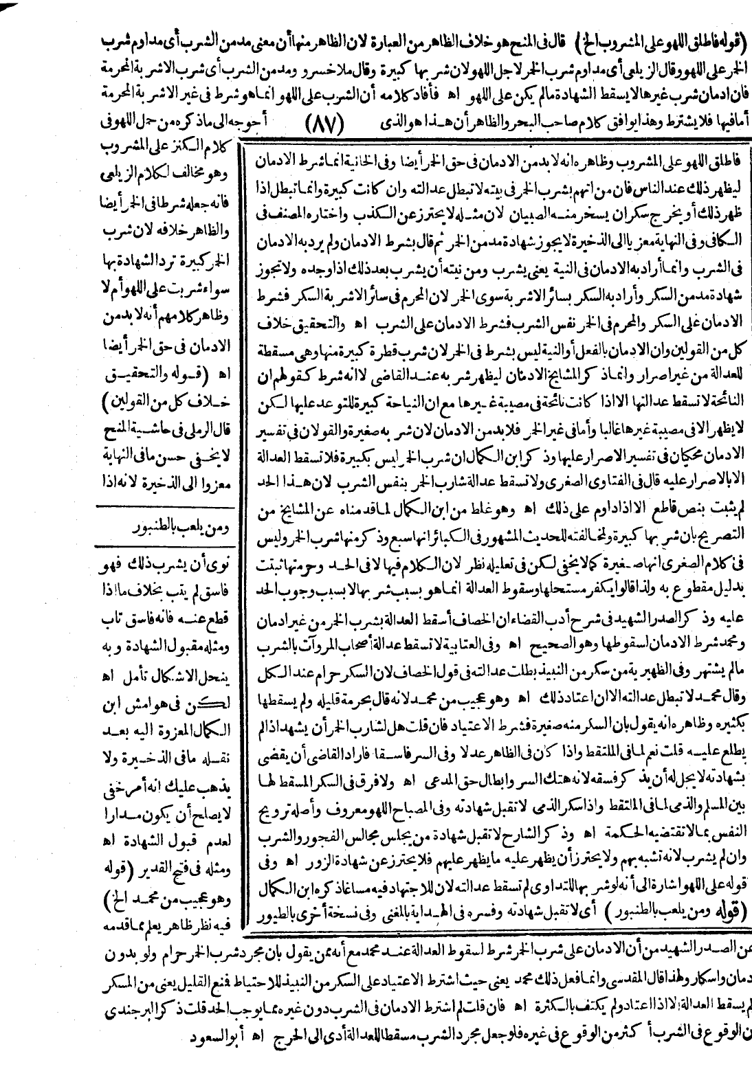 فَأَفَادَ كَلَامُهُ أَنَّ الشُّرْبَ عَلَى اللَّهْوِ إنَّمَا هُوَ شَرْطٌ فِي غَيْرِ الْأَشْرِبَةِ الْمُحَرَّمَةِ أَمَّا فِيهَا فَلَا يُشْتَرَطُ وَهَذَا يُوَافِقُ كَلَامَ صَاحِبِ الْبَحْرِ وَالظَّاهِرُ أَنَّ هَذَا هُوَ الَّذِي أَحْوَجُهُ إلَى مَا ذَكَرَهُ مِنْ حَمْلِ اللَّهْوِ فِي كَلَامِ الْكَنْزِ عَلَى الْمَشْرُوبِ وَهُوَ مُخَالِفٌ لِكَلَامِ الزَّيْلَعِيِّ فَإِنَّهُ جَعَلَهُ شَرْطًا فِي الْخَمْرِ أَيْضًا وَالظَّاهِرُ خِلَافُهُ؛ لِأَنَّ شُرْبَ الْخَمْرِ كَبِيرَةٌ تُرَدُّ الشَّهَادَةُ بِهَا سَوَاءٌ شُرِبَتْ عَلَى اللَّهْوِ أَمْ لَا وَظَاهِرُ كَلَامِهِمْ أَنَّهُ لَا بُدَّ مِنْ الْإِدْمَانِ فِي حَقِّ الْخَمْرِ أَيْضًا. اهـ.