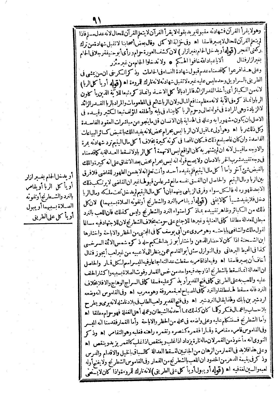 (قَوْلُهُ أَوْ يَأْكُلُ الرِّبَا) ؛ لِأَنَّهُ مِنْ الْكَبَائِرِ أَيْ يَأْخُذُ الْقَدْرَ الزَّائِدَ فَالْمُرَادُ بِالْأَكْلِ الْأَخْذُ وَإِنَّمَا ذَكَرَهُ تَبَعًا لِلْآيَةِ {الَّذِينَ يَأْكُلُونَ الرِّبَا} [البقرة: 275] وَإِنَّمَا ذَكَرَهُ فِي الْآيَةِ؛ لِأَنَّهُ مُعْظَمُ مَنَافِعِ الْمَالِ وَلِأَنَّ الرِّبَا شَائِعٌ فِي الْمَطْعُومَاتِ وَالْمُرَادُ بِالرِّبَا الْقَدْرُ الزَّائِدُ لَا الزِّيَادَةُ وَهِيَ الْمُرَادَةُ فِي قَوْله تَعَالَى {وَحَرَّمَ الرِّبَا} [البقرة: 275] كَمَا بَيَّنَّاهُ فِي بَابِهِ وَأَطْلَقَهُ الْمُؤَلِّفُ تَبَعًا لِكَثِيرٍ وَقَيَّدَهُ فِي الْأَصْلِ بِأَنْ يَكُونَ مَشْهُورًا بِهِ وَعَلَّلَهُ فِي الْهِدَايَةِ بِأَنَّ الْإِنْسَانَ قَلَّ مَا يَنْجُو عَنْ مُبَاشَرَاتِ الْعُقُودِ الْفَاسِدَةِ وَكُلُّ ذَلِكَ رِبَا اهـ.