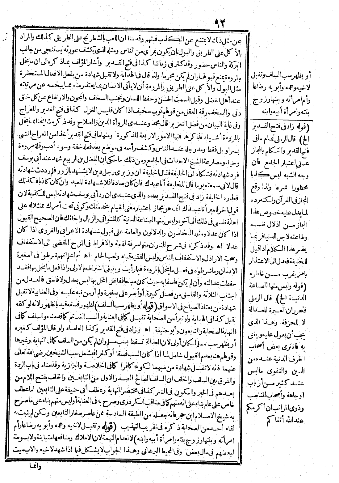 وَزَادَ فِي فَتْحِ الْقَدِيرِ وَكَذَا الْعُلَمَاءُ وَلَوْ قَالَ الْمُؤَلِّفُ كَغَيْرِهِ أَوْ يُظْهِرُ سَبَّ مُسْلِمٍ لَكَانَ أَوْلَى؛ لِأَنَّ الْعَدَالَةَ تَسْقُطُ بِسَبِّ مُسْلِمٍ وَإِنْ لَمْ يَكُنْ مِنْ السَّلَفِ كَمَا فِي النِّهَايَةِ وَغَيْرِهَا وَقَوْلُهُمْ هُنَا بِعَدَمِ الْقَبُولِ شَامِلٌ لِمَا إذَا كَانَ السَّبُّ فِسْقًا أَوْ كُفْرًا فَيَشْمَلُ سَبَّ الشَّيْخَيْنِ - رَضِيَ اللَّهُ تَعَالَى عَنْهُمَا - فَإِنَّهُ لَا تُقْبَلُ شَهَادَةُ مَنْ سَبَّهُمَا لِكَوْنِهِ كَافِرًا كَمَا فِي الْخُلَاصَةِ وَالْبَزَّازِيَّةِ وَقَدَّمْنَاهُ فِي بَابِ الرِّدَّةِ وَالْفَرْقُ بَيْنَ السَّلَفِ وَالْخَلَفِ أَنَّ السَّلَفَ الصَّالِحَ الصَّدْرُ الْأَوَّلُ مِنْ التَّابِعِينَ وَالْخَلَفَ بِفَتْحِ اللَّامِ مَنْ بَعْدَهُمْ فِي الْخَيْرِ وَالسُّكُونِ فِي الشَّرِّ كَذَا فِي مُخْتَصَرِ النِّهَايَةِ وَعَطْفُ أَبِي حَنِيفَةَ عَلَى التَّابِعِينَ إمَّا عَطْفُ خَاصٍّ عَلَى عَامٍّ بِنَاءً عَلَى أَنَّهُ مِنْهُمْ كَمَا فِي مَنَاقِبِ الْكَرْدَرِيِّ وَصَرَّحَ بِهِ فِي الْعِنَايَةِ أَوْ لَيْسَ مِنْهُمْ بِنَاءً عَلَى مَا صَرَّحَ بِهِ شَيْخُ الْإِسْلَامِ ابْنُ حَجَرٍ فَإِنَّهُ جَعَلَهُ مِنْ الطَّبَقَةِ السَّادِسَةِ مِمَّنْ عَاصَرَ صِغَارَ التَّابِعِينَ وَلَكِنْ لَمْ يَثْبُتْ لَهُ لِقَاءُ أَحَدٍ مِنْ الصَّحَابَةِ ذَكَرَهُ فِي تَقْرِيبِ التَّهْذِيبِ