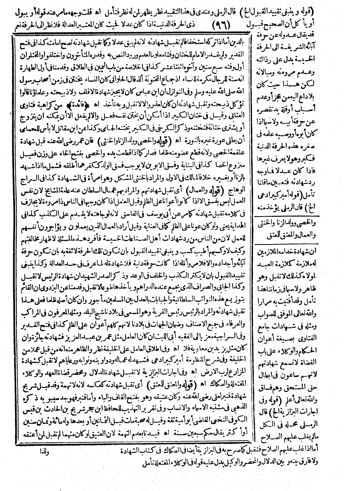 قُلْت وَجْهُهُ مَا مَرَّ عِنْدَ قَوْلِهِ أَوْ يَبُولُ أَوْ يَأْكُلُ أَنَّ الصَّحِيحَ قَبُولُ ذِي الْحِرْفَةِ الدَّنِيَّةِ إذَا كَانَ عَدْلًا فَحَيْثُ كَانَ الْمُعْتَبَرُ الْعَدَالَةَ فَلَا نَظَرَ إلَى الْحِرْفَةِ نَعَمْ قَدْ يُقَالُ عُدُولُهُ عَنْ حِرْفَةِ آبَائِهِ الشَّرِيفَةِ إلَى الْحِرْفَةِ الْخَسِيسَةِ يَدُلُّ عَلَى رَذَالَتِهِ وَعَدَمِ مُرُوءَتِهِ وَمُبَالَاتِهِ لَكِنْ هَذَا حَيْثُ كَانَ بِلَا دَاعٍ إلَيْهِ مِنْ عَجْزٍ أَوْ عَدَمِ أَسْبَابٍ أَوْ قِلَّةِ يَدٍ تَقْصُرُهُ عَنْ حِرْفَةِ أَبِيهِ وَلَا سِيَّمَا إذَا كَانَ أَبُوهُ أَوْ وَصِيُّهُ عَلَّمَهُ فِي صِغَرِهِ هَذِهِ الْحِرْفَةَ الدَّنِيَّةَ فَكَبِرَ وَهُوَ لَا يَعْرِفُ غَيْرَهَا فَإِذَا كَانَ عَدْلًا فَمَا وَجْهُ رَدِّ شَهَادَتِهِ فَتَعَيَّنَ مَا قُلْنَا تَأَمَّلْ (قَوْلُهُ أَمِيرٌ كَبِيرٌ ادَّعَى إلَخْ) قَالَ الرَّمْلِيُّ يُؤْخَذُ مِنْهُ أَنَّ شَهَادَةَ خُدَّامِهِ الْمُلَازِمِينَ لَهُ مُلَازَمَةً كَمُلَازَمَةِ الْعَبْدِ لِمَوْلَاهُ كَذَلِكَ لَا تُقْبَلُ وَهُوَ ظَاهِرٌ وَلَا سِيَّمَا فِي زَمَانِنَا هَذَا تَأَمَّلْ وَقَدْ أَفْتَيْت بِهِ مِرَارًا وَاَللَّهُ تَعَالَى الْمُوَفِّقُ لِلصَّوَابِ وَمِثْلُهُ فِي شَهَادَاتِ جَامِعِ الْفَتَاوَى بِصِيغَةِ أَعْوَانِ الْحُكَّامِ وَالْوُكَلَاءِ عَلَى بَابِ الْقُضَاةِ لَا تُسْمَعُ شَهَادَتُهُمْ؛ لِأَنَّهُمْ سَاعُونَ فِي إبْطَالِ حَقِّ الْمُسْتَحِقِّ وَهُمْ فُسَّاقٌ وَاَللَّهُ تَعَالَى أَعْلَمُ (قَوْلُهُ وَفِي إجَارَاتِ الْبَزَّازِيَّةِ إلَخْ) قَالَ الرَّمْلِيُّ مَحَلُّهُ فِي الْكُلِّ مَا لَمْ يَغْلِبْ عَلَيْهِمْ الصَّلَاحُ أَمَّا إذَا غَلَبَ عَلَيْهِمْ الصَّلَاحُ فَتُقْبَلُ كَمَا صَرَّحَ بِهِ فِي الْبَزَّازِيَّةِ أَيْضًا فِي الصَّكَّاكِ فِي كِتَابِ الشَّهَادَةِ وَلَا فَارِقَ بَيْنَهُ وَبَيْنَ الدَّلَّالِ وَالْمُحْضَرِ وَالْوَكِيلِ يَدُلُّ عَلَيْهِ قَوْلُهُ فِي الْوُكَلَاءِ الْمُفْتَعَلَةِ تَأَمَّلْ.