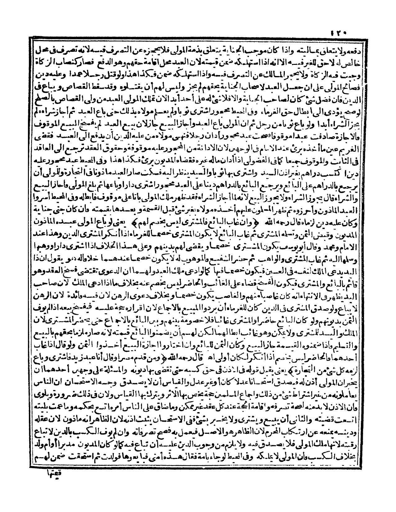 وَفِي الْمُحِيطِ أَسَرُوا الْعَبْدَ الْمَأْذُونَ وَأَحْرَزُوهُ ثُمَّ ظَهَرَ الْمُسْلِمُونَ عَلَيْهِمْ أَخَذَهُ مَوْلَاهُ بِغَيْرِ شَيْءٍ قَبْلَ الْقِسْمَةِ وَبَعْدهَا بِقِيمَتِهِ، فَإِنْ كَانَ جَنَى جِنَايَةً وَكَانَ عَلَيْهِ دَيْنٌ لَزِمَاهُ