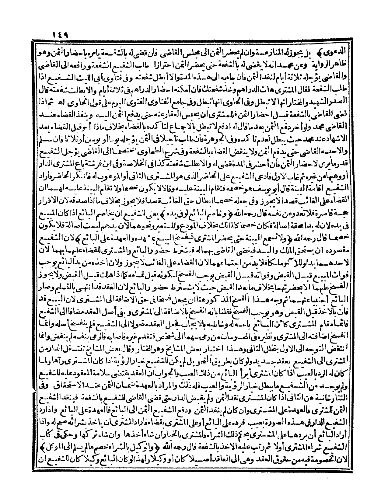 الدَّعْوَى) بَلْ يَجُوزُ لَهُ الْمُنَازَعَةُ، وَإِنْ لَمْ يُحْضِرْ الثَّمَنَ إلَى مَجْلِسِ الْقَاضِي، فَإِنْ قَضَى لَهُ بِالشُّفْعَةِ يَأْمُرُهُ بِإِحْضَارِ الثَّمَنِ وَهُوَ ظَاهِرُ الرِّوَايَةِ وَعَنْ مُحَمَّدٍ أَنَّهُ لَا يَقْضِي لَهُ بِالشُّفْعَةِ حَتَّى يُحْضِرَ الثَّمَنَ احْتِرَازًا طَلَبُ الشَّفِيعُ الشُّفْعَةَ وَرَافَعَهُ إلَى الْقَاضِي وَالْقَاضِي يُؤَجِّلُهُ ثَلَاثَةَ أَيَّامٍ لِنَقْدِ الثَّمَنِ، فَإِنْ جَاءَ بِهِ إلَى هَذِهِ الْمُدَّةِ وَإِلَّا أَبْطَلَ شُفْعَتَهُ وَفِي فَتَاوَى أَبِي اللَّيْثِ الشَّفِيعُ إذَا طَلَبَ الشُّفْعَةَ فَقَالَ الْمُشْتَرِي هَاتِ الدَّرَاهِمَ وَخُذْ شُفْعَتَك، فَإِنْ أَمْكَنَهُ إحْضَارُ الدَّرَاهِمِ فِي ثَلَاثَةِ أَيَّامٍ وَإِلَّا بَطَلَتْ شُفْعَتُهُ قَالَ الصَّدْرُ الشَّهِيدُ وَالْمُخْتَارُ أَنَّهَا لَا تَبْطُلُ وَفِي الْحَاوِي أَنَّهَا تَبْطُلُ وَفِي جَامِعِ الْفَتَاوَى الْفَتْوَى الْيَوْمُ عَلَى قَوْلِ الْحَاوِي. اهـ.