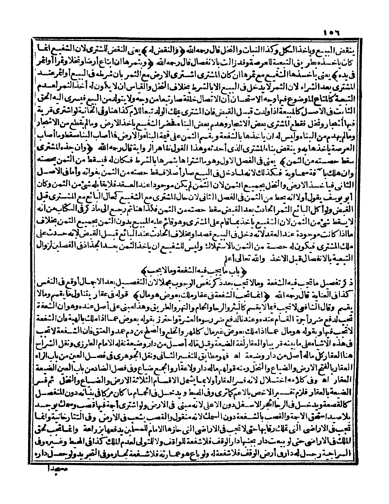 وَفِي كَلَامِهِ اخْتِلَالٌ؛ لِأَنَّهُ فَسَّرَ الْعَقَارَ أَوَّلًا بِمَا يَشْمَلُ الْأَقْسَامَ الثَّلَاثَةَ الْأَرْضَ وَالضِّيَاعَ وَالنَّخْلَ ثُمَّ فَسَّرَ الضَّيْعَةَ بِالْعَقَارِ فَلَزِمَ تَفْسِيرُ الْأَخَصِّ بِالْأَعَمِّ كَمَا تَرَى وَفِي الْمُحِيطِ وَيَدْخُلُ فِي الْحَمَّامِ مَا كَانَ مُرَكَّبًا فِي بُنْيَانِهِ دُونَ الْمُنْفَصِلِ كَالْقَصْعَةِ وَيَدْخُلُ فِي الرَّحَا الْحَجَرُ الْأَسْفَلُ دُونَ الْأَعْلَى؛ لِأَنَّهُ مَبْنِيٌّ فِي الْأَرْضِ وَلَوْ اشْتَرَى أَجَمَةً فِيهَا قَصَبٌ وَسَمَكٌ يُوجَدُ بِلَا صَيْدٍ اسْتَحَقَّ الْأَجَمَةَ وَالْقَصَبَ بِالشُّفْعَةِ دُونَ السَّمَكِ؛ لِأَنَّهُ مَنْقُولٌ وَالْقَصَبُ يُشَعِّبُ الْأَرْضَ وَفِي التَّتَارْخَانِيَّة، وَإِنَّمَا تَجِبُ فِي الْأَرَاضِيِ الَّتِي تُمْلَكُ رِقَابُهَا حَتَّى تَجِبَ فِي الْأَرَاضِيِ الَّتِي حَازَهَا الْإِمَامُ لِلْمُسْلِمِينَ يَدْفَعُهَا بِزِرَاعَةٍ، وَإِنَّمَا تَجِبُ لِحَقِّ الْمِلْكِ فِي الْأَرَاضِيِ حَتَّى لَوْ بِيعَتْ دَارٌ بِجَنْبِهَا دَارُ الْوَقْفِ فَلَا شُفْعَةَ لِلْوَاقِفِ وَلَا لِلْمُتَوَلِّي لِعَدَمِ الْمِلْكِ كَذَا فِي الْمُحِيطِ وَغَيْرِهِ وَفِي السِّرَاجِيَّةِ رَجُلٌ لَهُ دَارٌ فِي أَرْضِ الْوَقْفِ فَلَا شُفْعَةَ لَهُ وَلَوْ بَاعَ هُوَ عِمَارَتَهُ فَلَا شُفْعَةَ لِجَارِهِ وَفِي التَّجْرِيدِ وَلَوْ جَعَلَ دَارِهِ