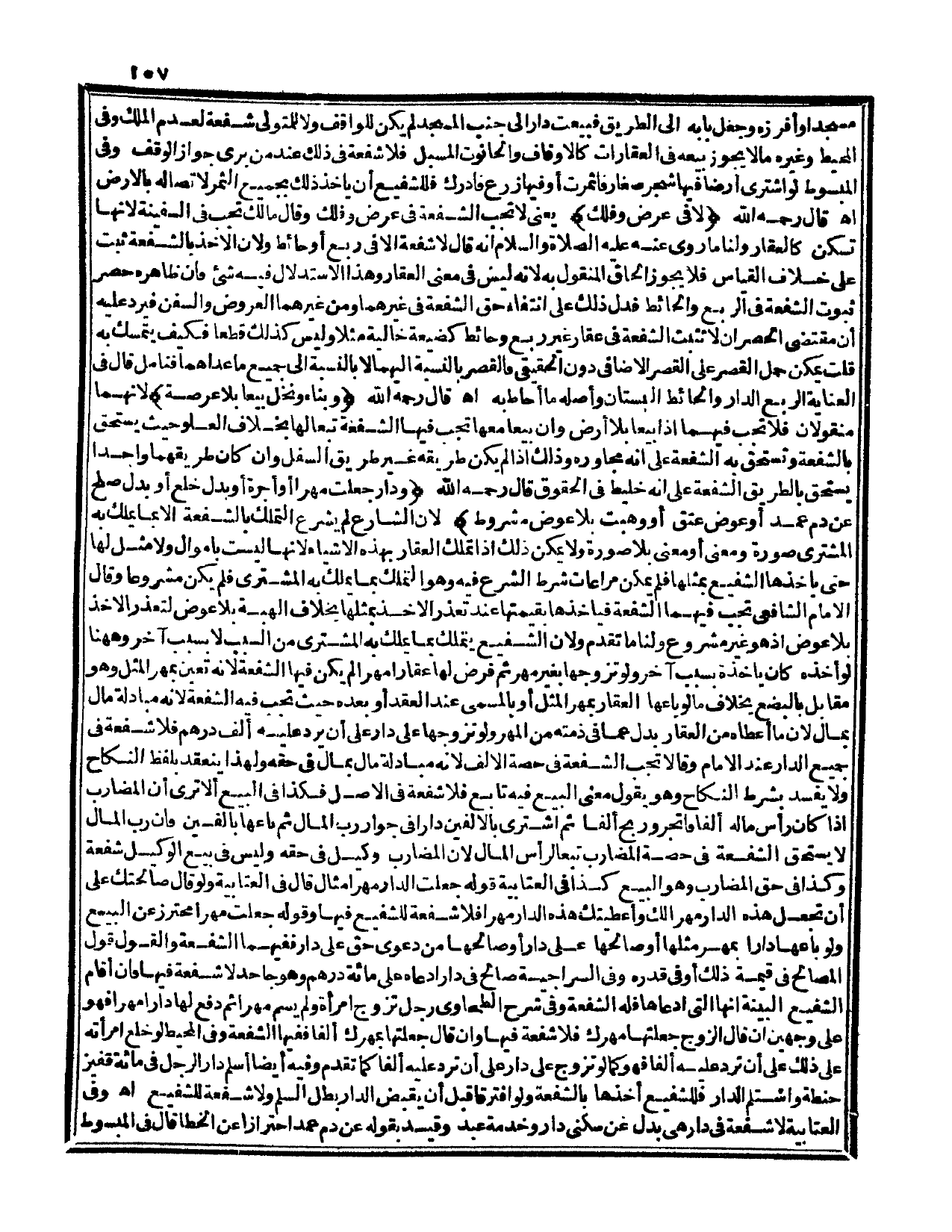 مَسْجِدًا وَأَفْرَزَهُ وَجَعَلَ بَابَهُ إلَى الطَّرِيقِ فَبِيعَتْ دَارٌ إلَى جَنْبِ الْمَسْجِدِ لَمْ يَكُنْ لِلْوَاقِفِ وَلَا لِلْمُتَوَلِّي شُفْعَةً لِعَدَمِ الْمِلْكِ وَفِي الْمُحِيطِ وَغَيْرِهِ مَا لَا يَجُوزُ بَيْعُهُ فِي الْعَقَارَاتِ كَالْأَوْقَافِ وَالْحَانُوتِ الْمُسَبَّلِ فَلَا شُفْعَةَ فِي ذَلِكَ عِنْدَ مَنْ يَرَى جَوَازَ الْوَقْفِ وَفِي الْمَبْسُوطِ لَوْ اشْتَرَى أَرْضًا فِيهَا شَجَرٌ صِغَارٌ فَأَثْمَرَتْ أَوْ فِيهَا زَرْعٌ فَأَدْرَكَ فَلِلشَّفِيعِ أَنْ يَأْخُذَ ذَلِكَ بِجَمِيعِ الثَّمَرِ لِاتِّصَالِهِ بِالْأَرْضِ. اهـ.