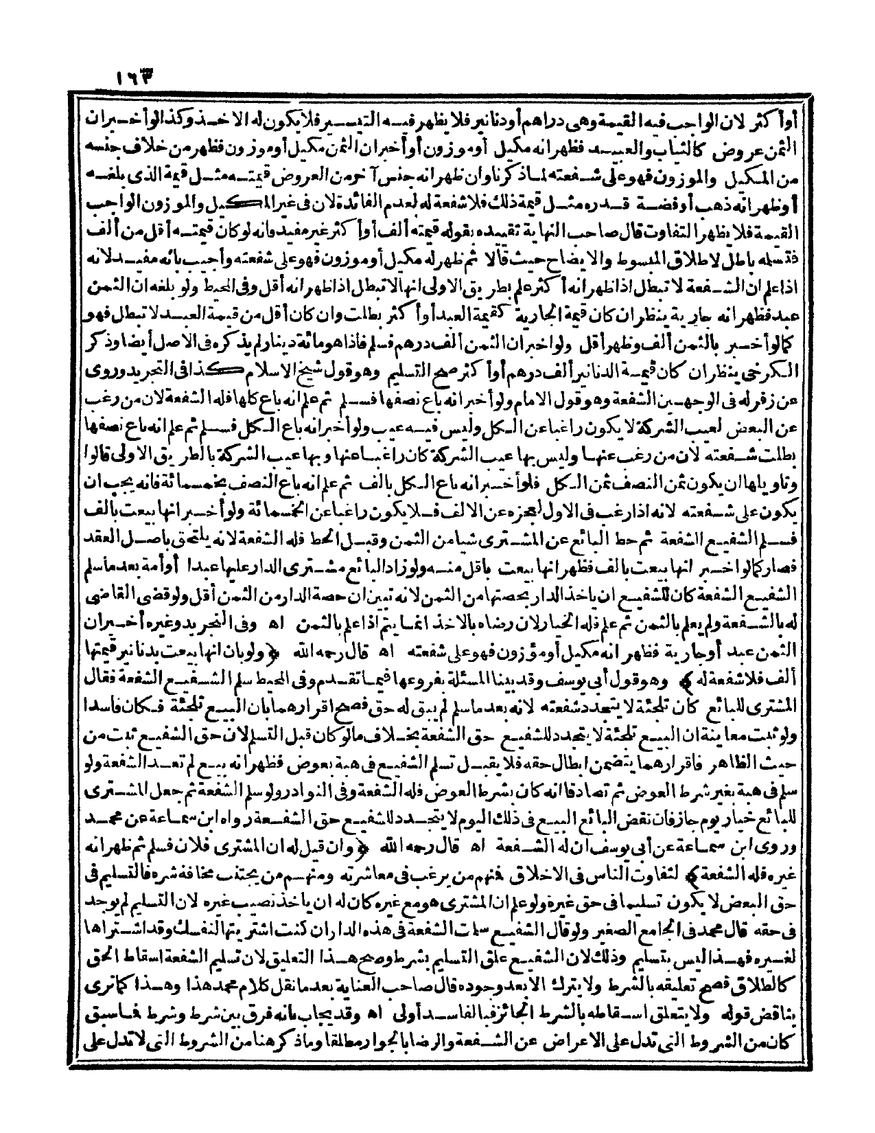 أَوْ أَكْثَرُ؛ لِأَنَّ الْوَاجِبَ فِيهِ الْقِيمَةُ وَهِيَ دَرَاهِمُ أَوْ دَنَانِيرُ فَلَا يَظْهَرُ فِيهِ التَّيْسِيرُ فَلَا يَكُونُ لَهُ الْأَخْذُ وَكَذَا لَوْ أَخْبَرَ أَنَّ الثَّمَنَ عُرُوضٌ كَالثِّيَابِ وَالْعَبِيدِ فَظَهَرَ أَنَّهُ مَكِيلٌ أَوْ مَوْزُونٌ أَوْ أَخْبَرَ أَنَّ الثَّمَنَ مَكِيلٌ أَوْ مَوْزُونٌ فَظَهَرَ مِنْ خِلَافِ جِنْسِهِ مِنْ الْمَكِيلِ وَالْمَوْزُونِ فَهُوَ عَلَى شُفْعَتِهِ لِمَا ذَكَرْنَا، وَإِنْ ظَهَرَ أَنَّهُ جِنْسٌ آخَرُ مِنْ الْعُرُوضِ قِيمَتُهُ مِثْلُ قِيمَةِ الَّذِي بَلَغَهُ أَوْ ظَهَرَ أَنَّهُ ذَهَبٌ أَوْ فِضَّةٌ قَدْرُهُ مِثْلُ قِيمَةِ ذَلِكَ فَلَا شُفْعَةَ لَهُ لِعَدَمِ الْفَائِدَةِ؛ لِأَنَّ غَيْرَ الْمَكِيلِ وَالْمَوْزُونِ الْوَاجِبَ الْقِيمَةُ فَلَا يَظْهَرُ التَّفَاوُتُ قَالَ صَاحِبُ النِّهَايَةِ تَقْيِيدُهُ بِقَوْلِهِ قِيمَتُهُ أَلْفٌ أَوْ أَكْثَرُ غَيْرُ مُفِيدٍ، فَإِنَّهُ لَوْ كَانَ قِيمَتُهُ أَقَلَّ مِنْ أَلْفٍ فَتَسَلُّمُهُ بَاطِلٌ لِإِطْلَاقِ الْمَبْسُوطِ وَالْإِيضَاحِ حَيْثُ قَالَا ثُمَّ ظَهَرَ لَهُ مَكِيلٌ أَوْ مَوْزُونٌ فَهُوَ عَلَى شُفْعَتِهِ.